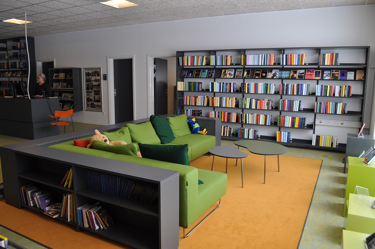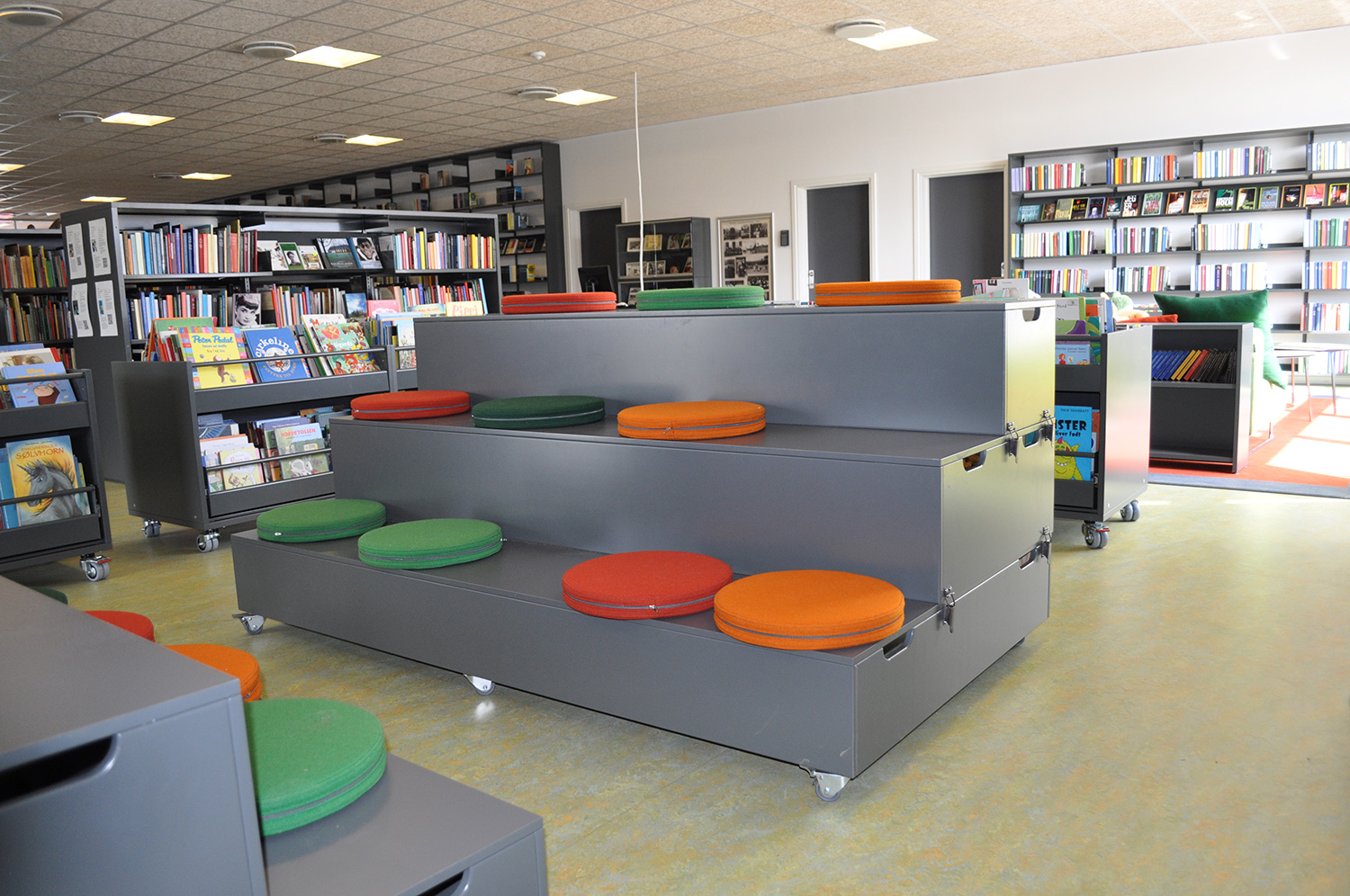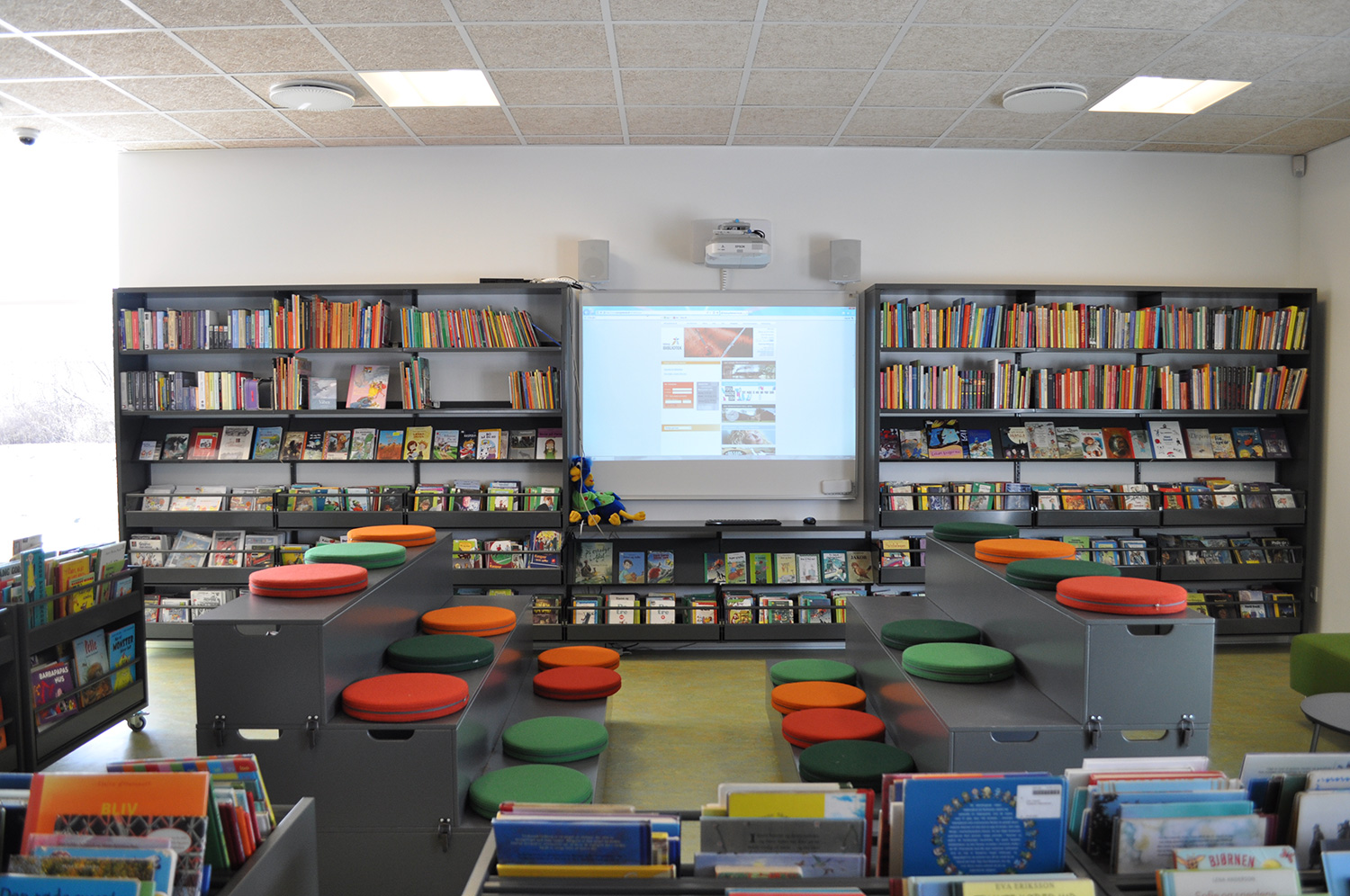Die Regale sind individuell angepasst, es gibt integrierte Computertische und viele andere maßgeschneiderte Lösungen. Zum Beispiel farbige Wände zwischen den Regalen, die Freude ausstrahlen, und abgeschiedene Bereiche für die Benutzer.