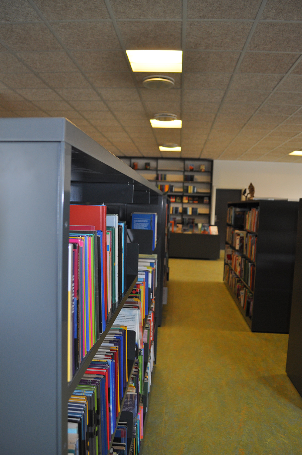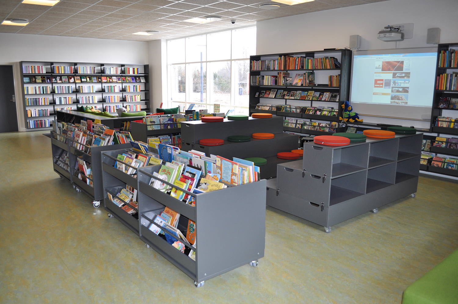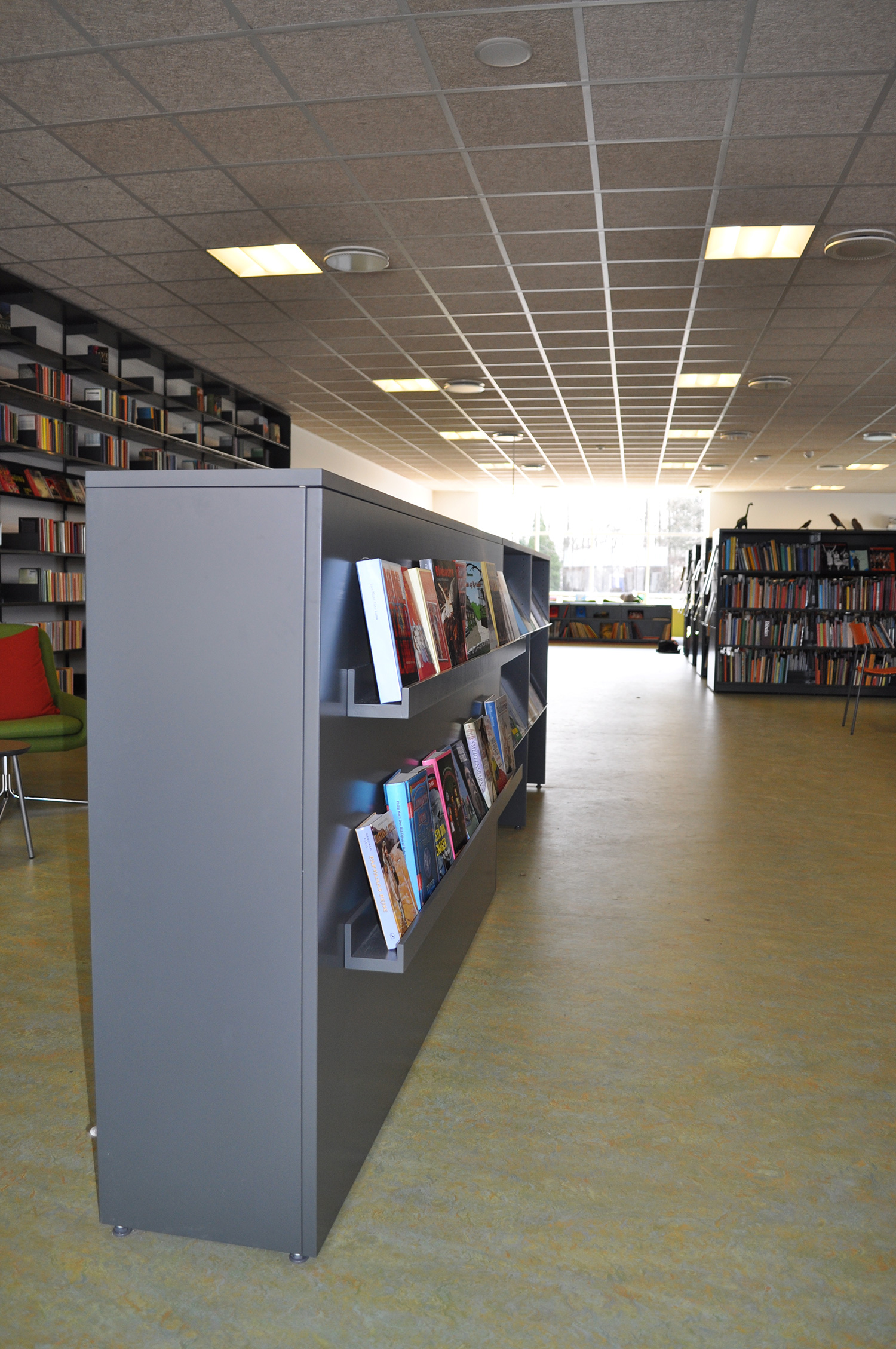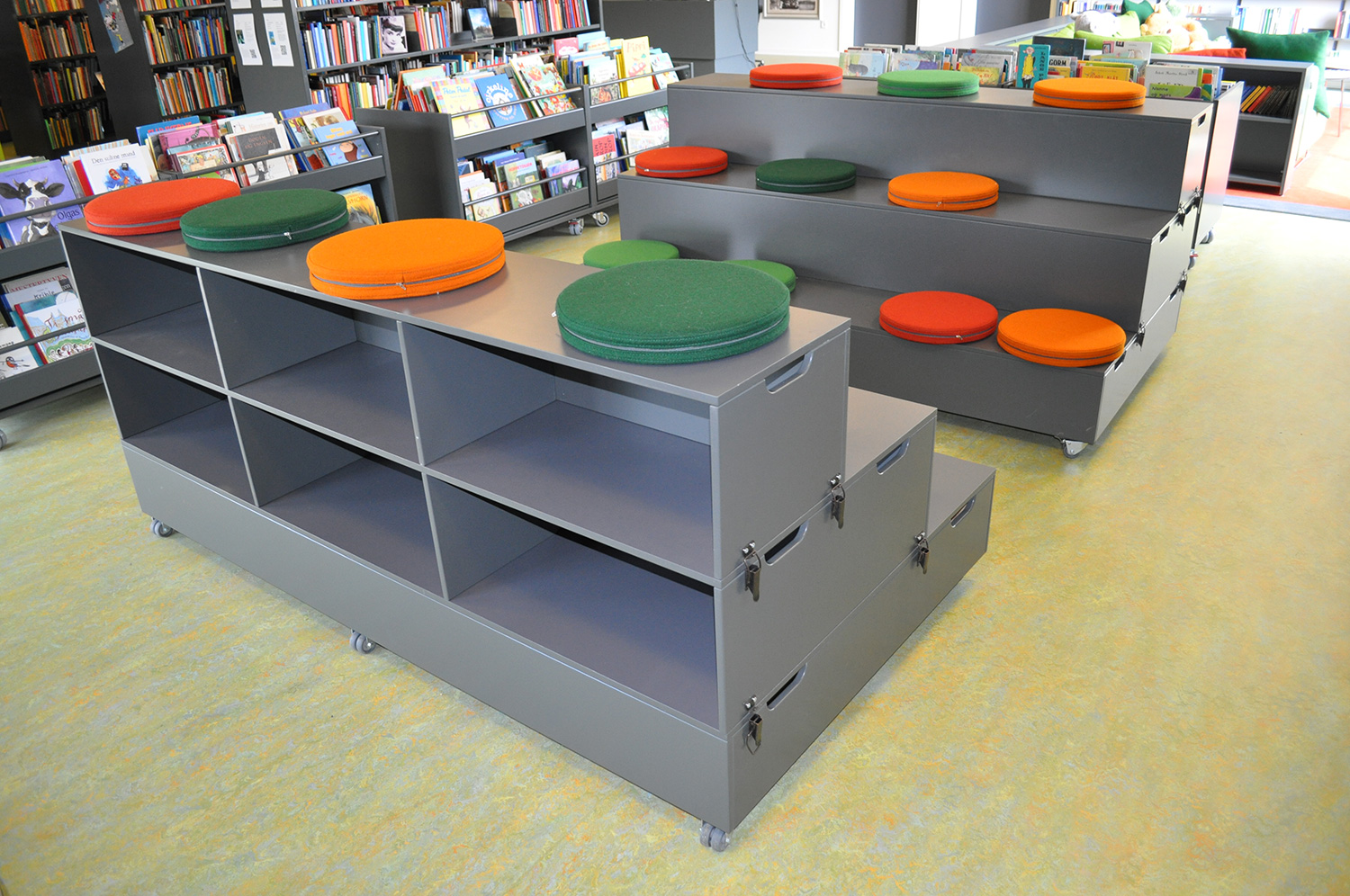 Die Regale sind individuell angepasst, es gibt integrierte Computertische und viele andere maßgeschneiderte Lösungen. Zum Beispiel farbige Wände zwischen den Regalen, die Freude ausstrahlen, und abgeschiedene Bereiche für die Benutzer.