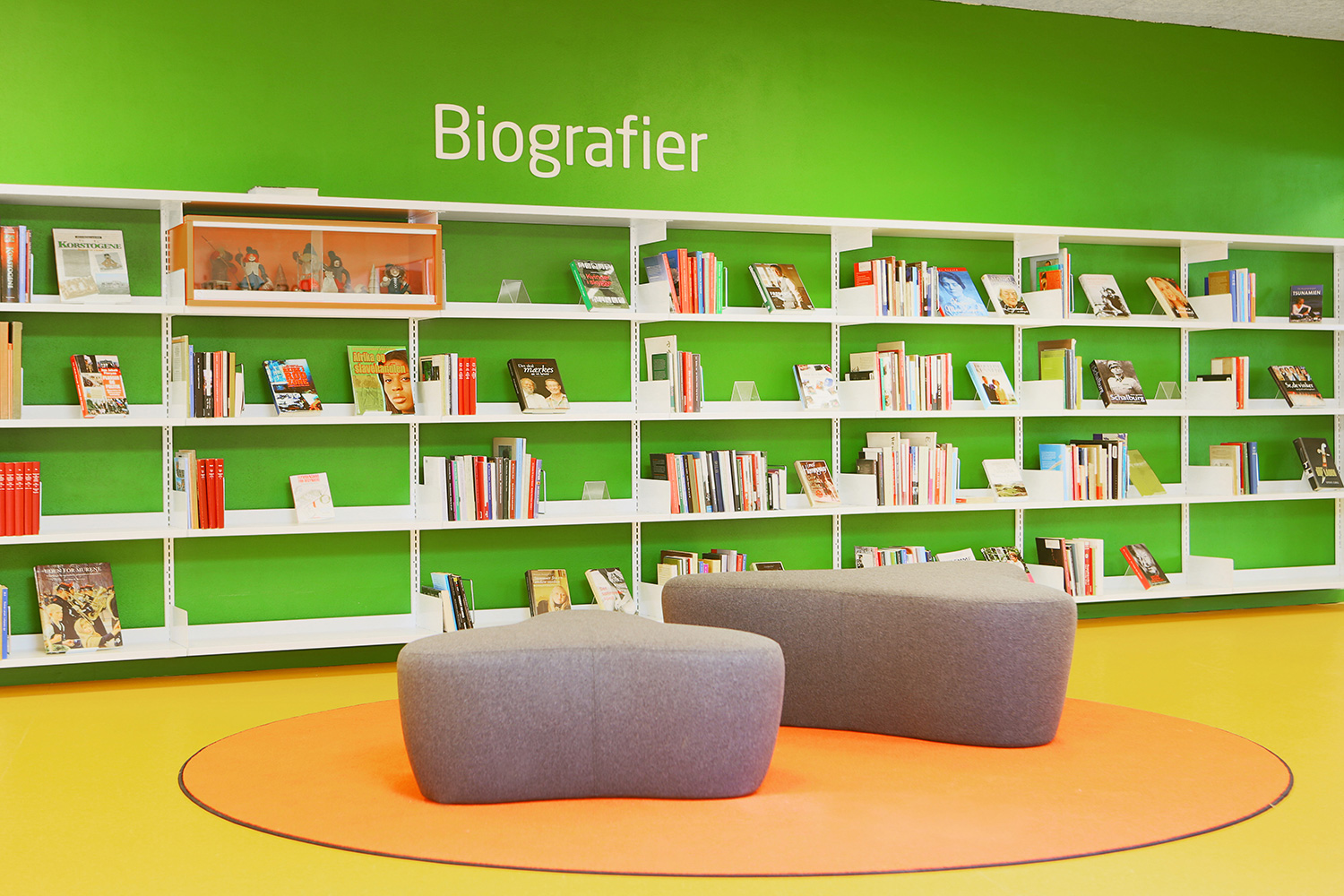 In der Kinderzone findet man große speziell entworfene Sitzplätze zum Spielen mit integrierten Krippen zur Präsentation von Kinderbüchern. An der Wand befestigte Regale in gestaffelten Höhen verleihen dem Raum Dynamik. In den Regalen befinden sich bewegliche orangefarbene Display-Module, um damit die Aufmerksamkeit für ausgewählte Themen zu wecken oder um kleinere Sonderausstellungen zu zeigen.