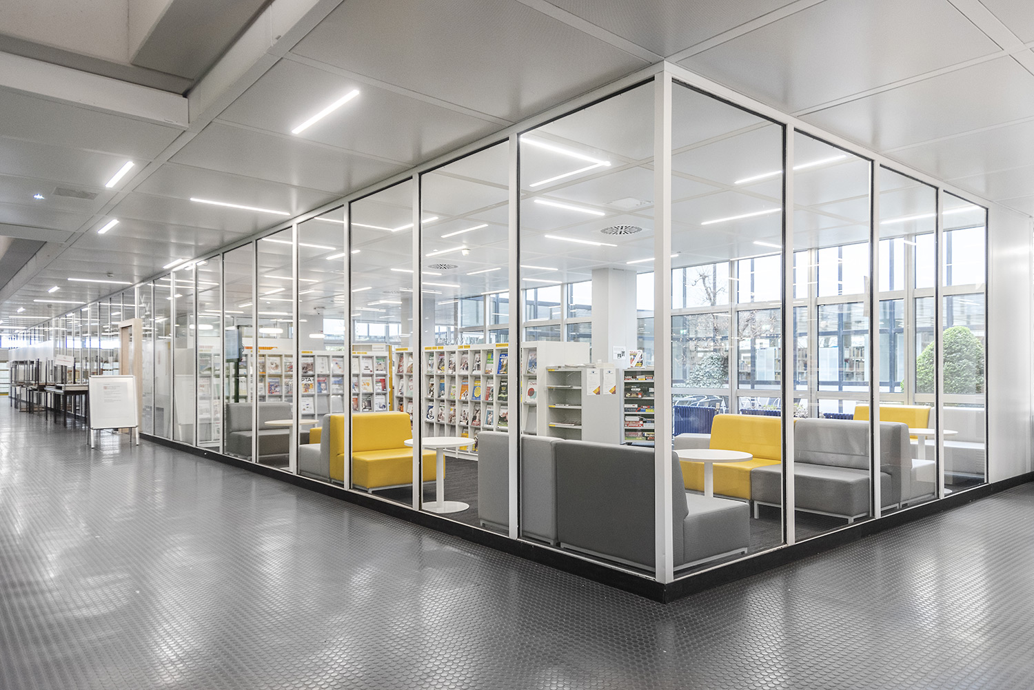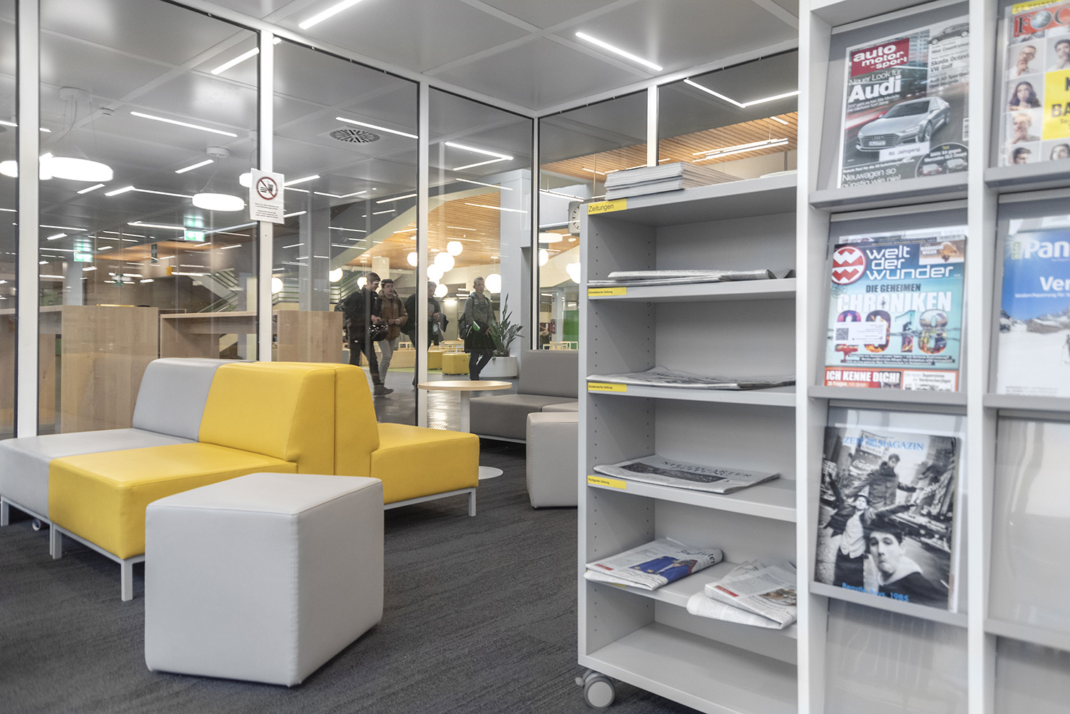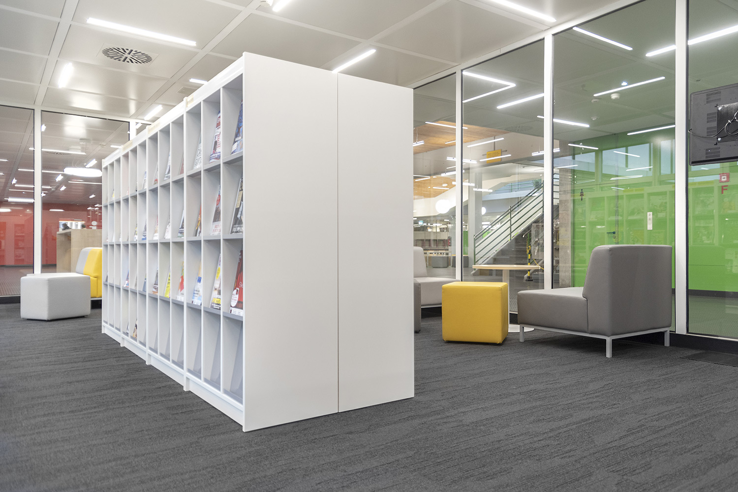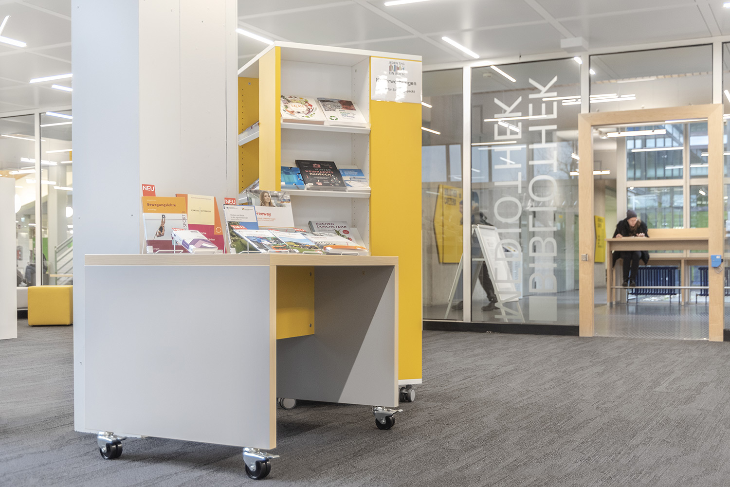 Diese neu eingerichtete Schulbibliothek überzeugt durch ihren hohen Aufenthaltswert. Verschiedene Bedürfnisse wie konzentriertes Arbeiten, Arbeiten in einer Gruppe oder auch einfach in einer angenehmen und relaxten Atmosphäre zu lesen werden in verschiedenen Zonen ermöglicht. Das Mobiliar greift dieses Prinzip auf und verbreitet einen hohen Aufenthaltswert.