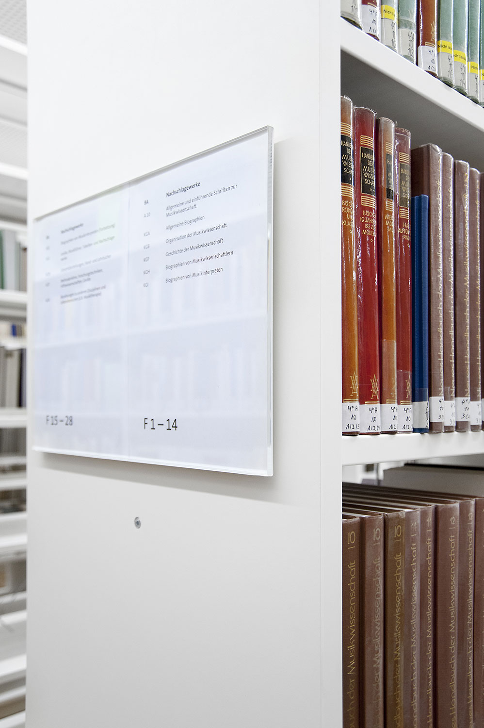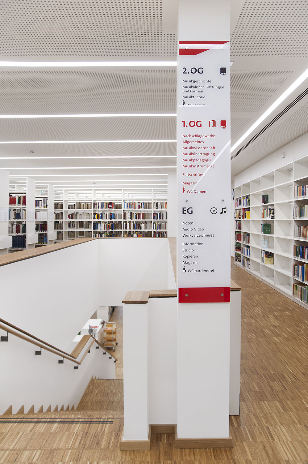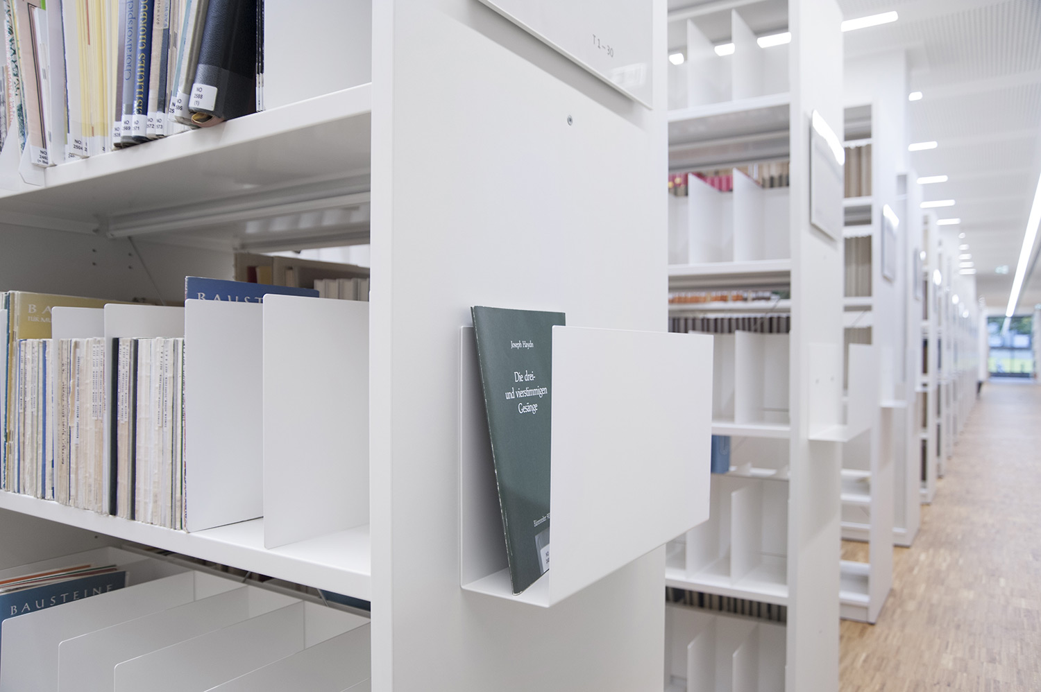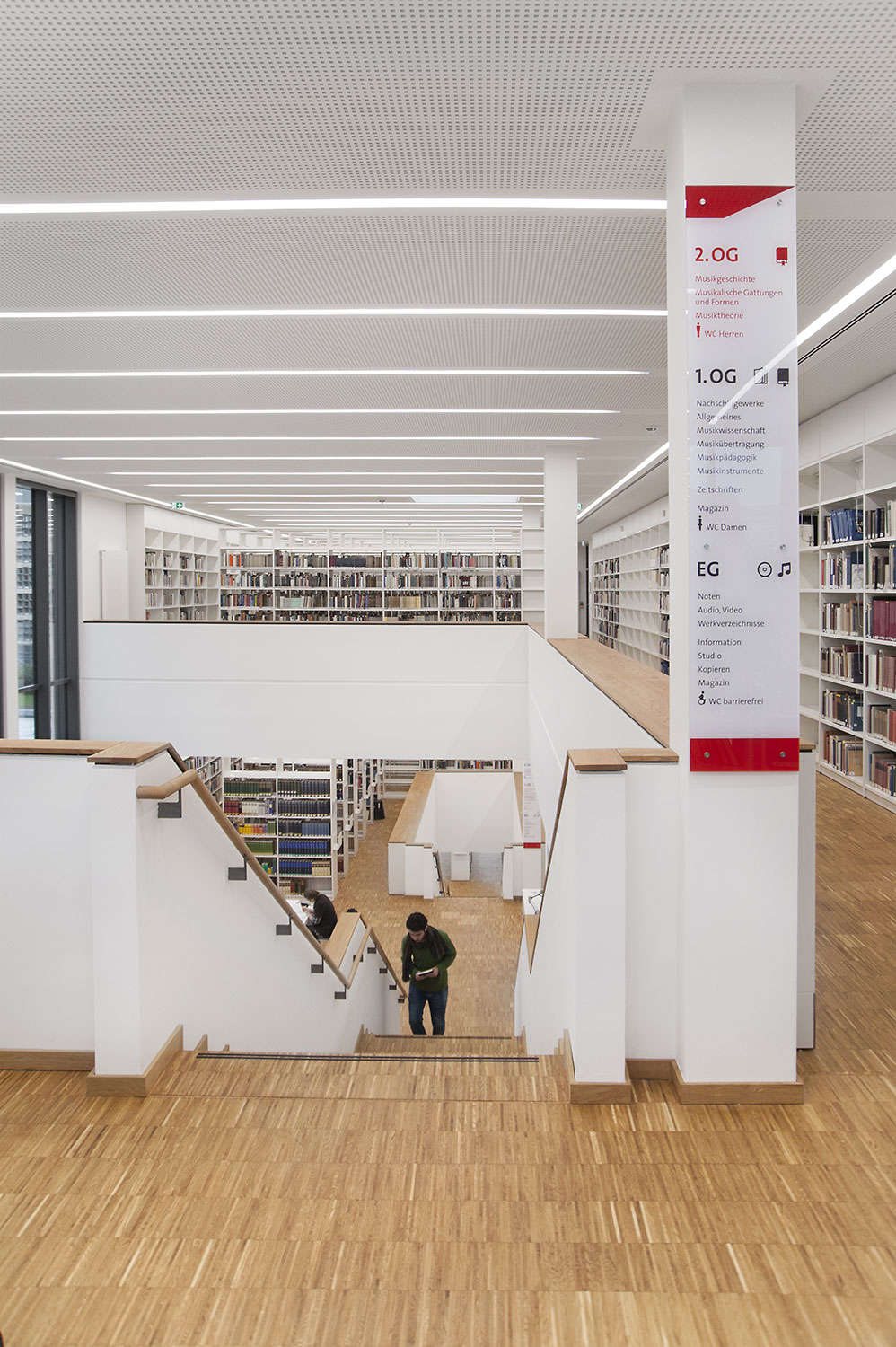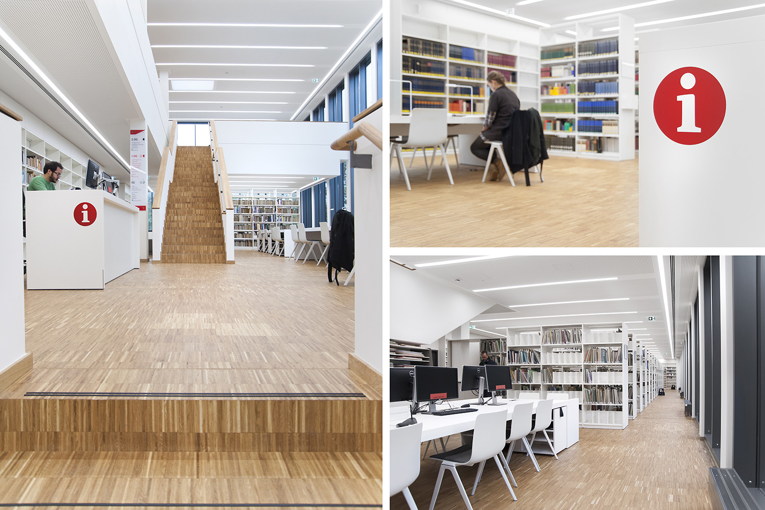 Es stehen 1000 m² flexibel nutzbare Bibliotheksfläche auf drei Ebenen zur Verfügung, ein zweigeschossiger Lesesaal, Büro- und Verwaltungsbereiche etc.