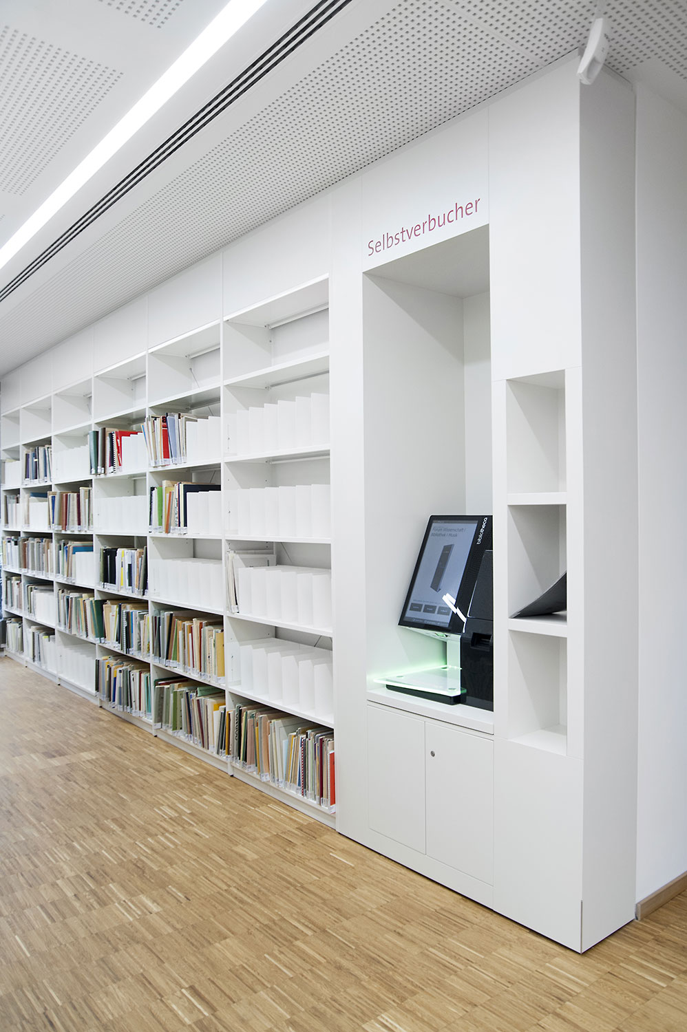 Die beiden Bibliotheken haben in dem gläsernen und von zwei Seiten zugänglichen Verbindungsbau eine gemeinsame Ausleihe und Rückgabe.