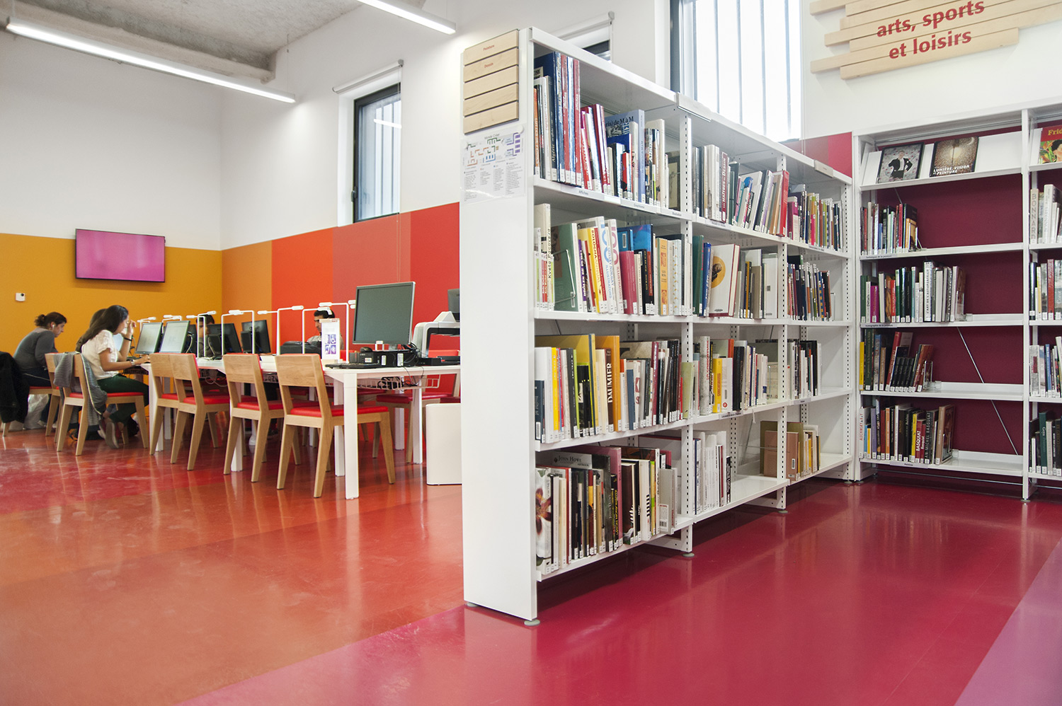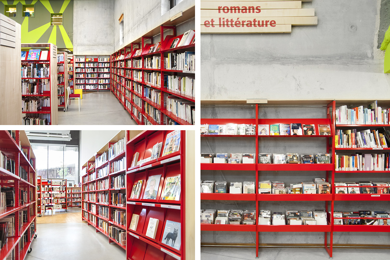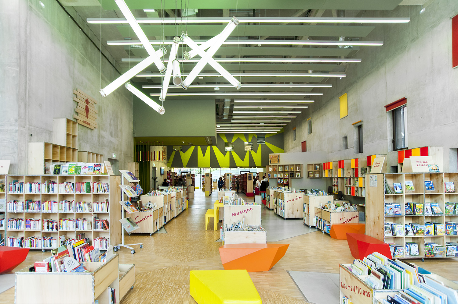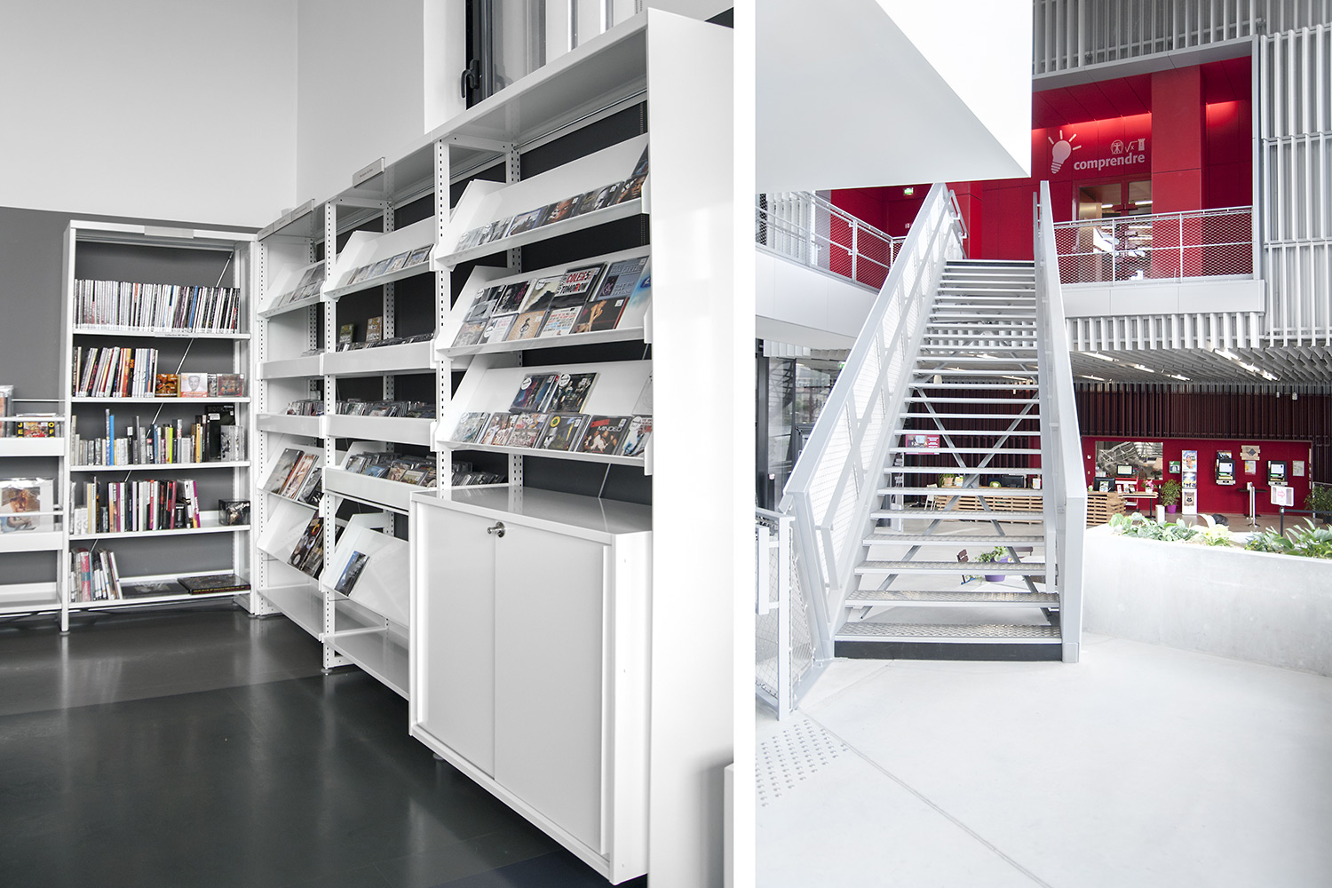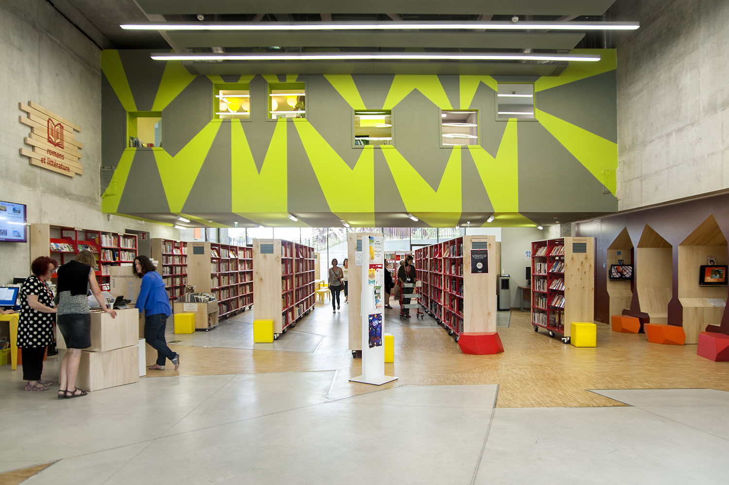 Die Bibliothek dreht sich um 3 Universen: Imagination, Kreation und Verstand. „Kreation“ ist ein Raum, der Comics, Kino, Musik und Kunst gewidmet ist. „Verstand“ deckt die Hauptgebiete des Wissens ab und bietet Raum sowie Bestände an, die dem literarischen Erbe und der Geschichte der Region Charente gewidmet sind. Zum Lesen und Studieren gibt es hier Einzel- und Gemeinschaftsräume. „Imagination“ führt Kinder mit Literatur zusammen. Von diesem Bereich aus gelangt man in den Gerichtshof und zum Auditorium.