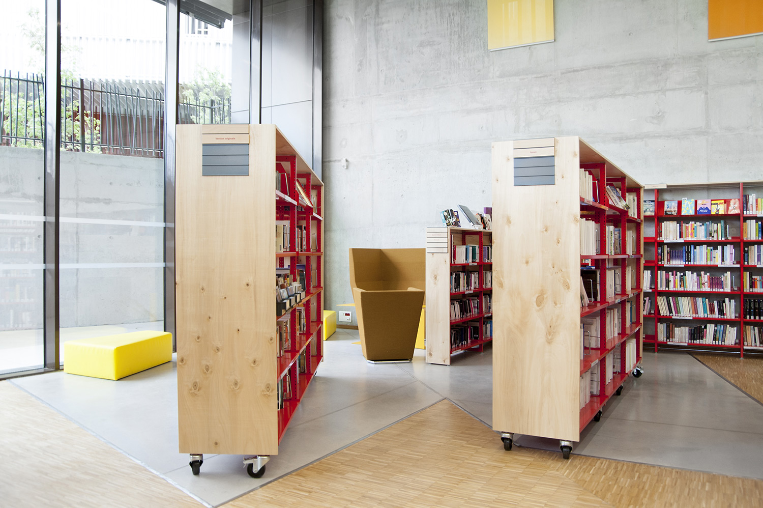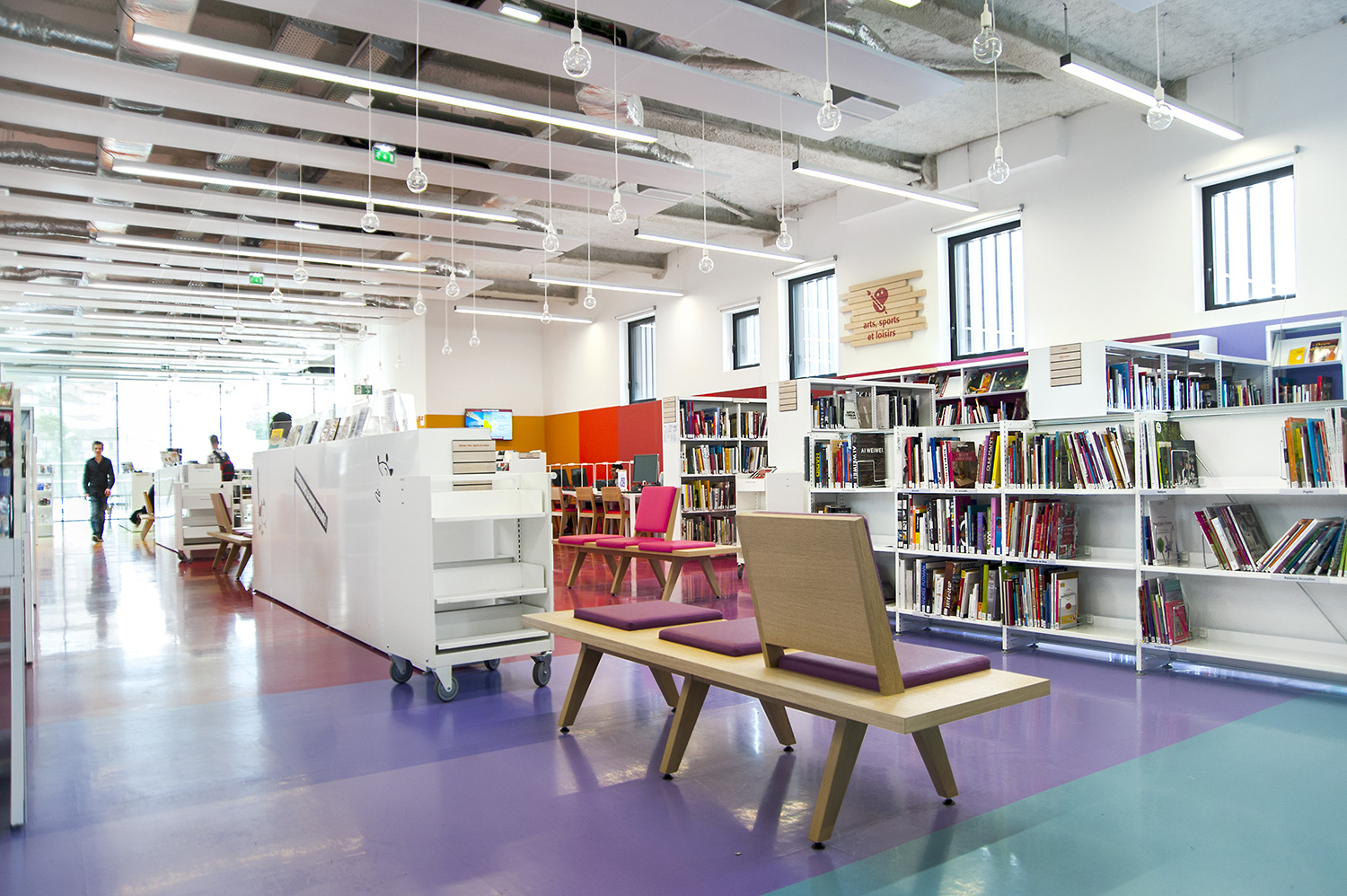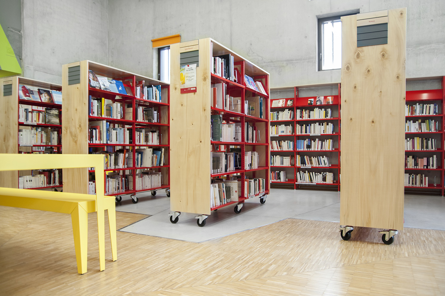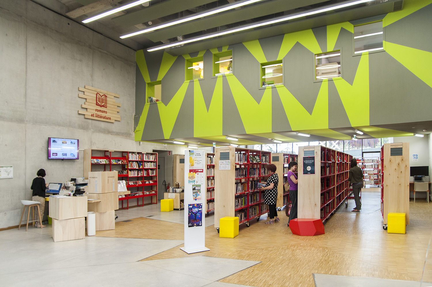 Die Bibliothek dreht sich um 3 Universen: Imagination, Kreation und Verstand. „Kreation“ ist ein Raum, der Comics, Kino, Musik und Kunst gewidmet ist. „Verstand“ deckt die Hauptgebiete des Wissens ab und bietet Raum sowie Bestände an, die dem literarischen Erbe und der Geschichte der Region Charente gewidmet sind. Zum Lesen und Studieren gibt es hier Einzel- und Gemeinschaftsräume. „Imagination“ führt Kinder mit Literatur zusammen. Von diesem Bereich aus gelangt man in den Gerichtshof und zum Auditorium.