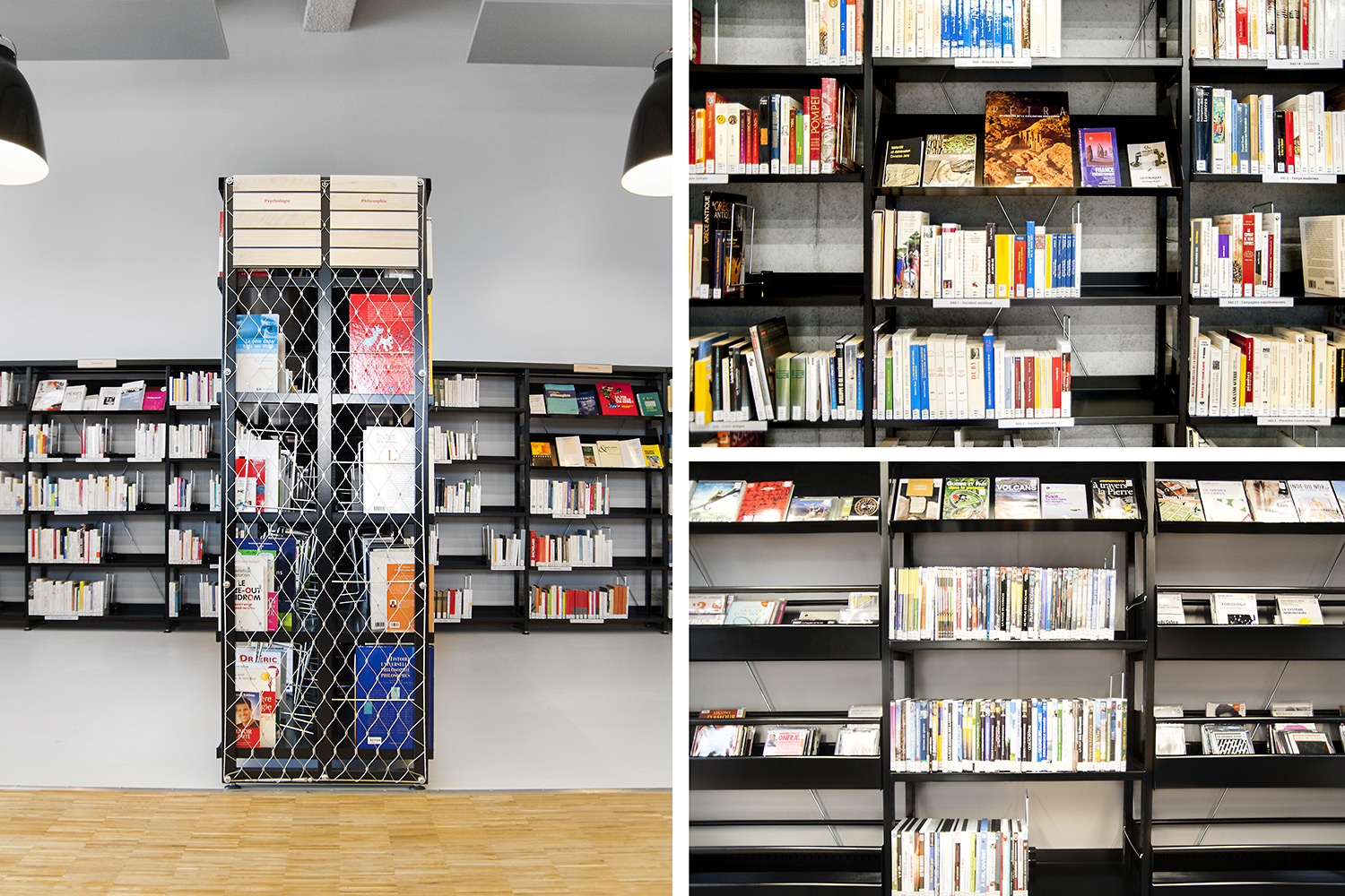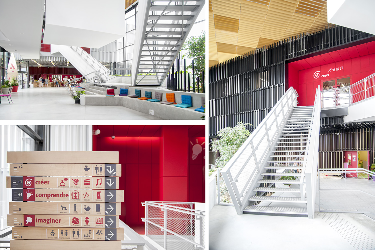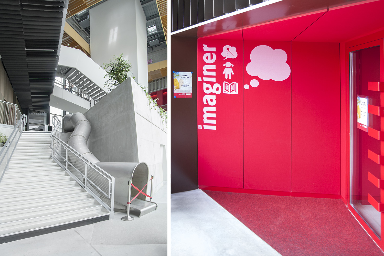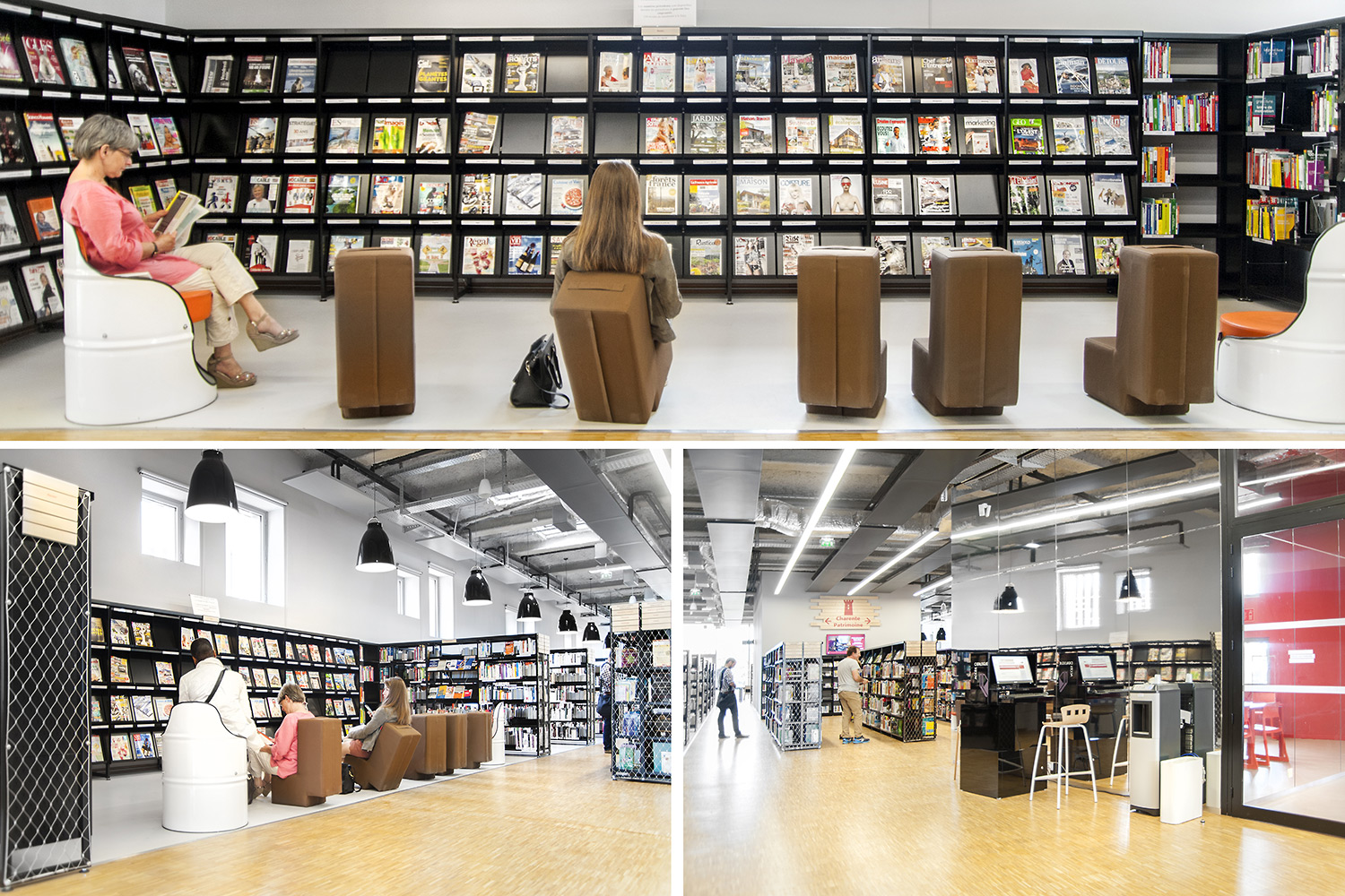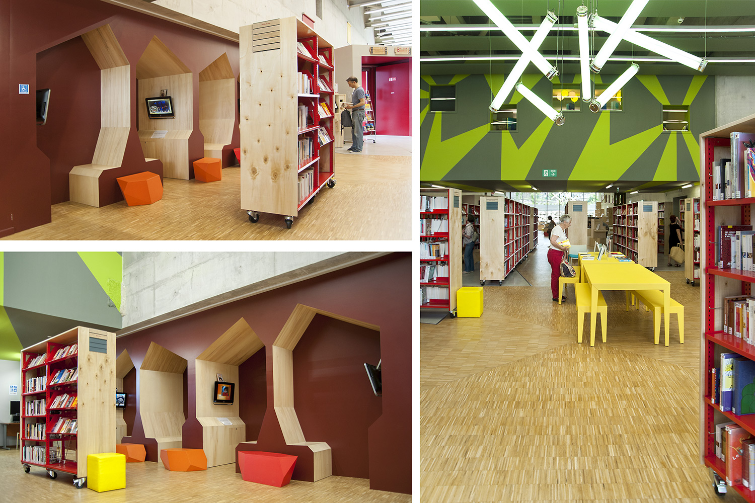 Die Bibliothek dreht sich um 3 Universen: Imagination, Kreation und Verstand. „Kreation“ ist ein Raum, der Comics, Kino, Musik und Kunst gewidmet ist. „Verstand“ deckt die Hauptgebiete des Wissens ab und bietet Raum sowie Bestände an, die dem literarischen Erbe und der Geschichte der Region Charente gewidmet sind. Zum Lesen und Studieren gibt es hier Einzel- und Gemeinschaftsräume. „Imagination“ führt Kinder mit Literatur zusammen. Von diesem Bereich aus gelangt man in den Gerichtshof und zum Auditorium.