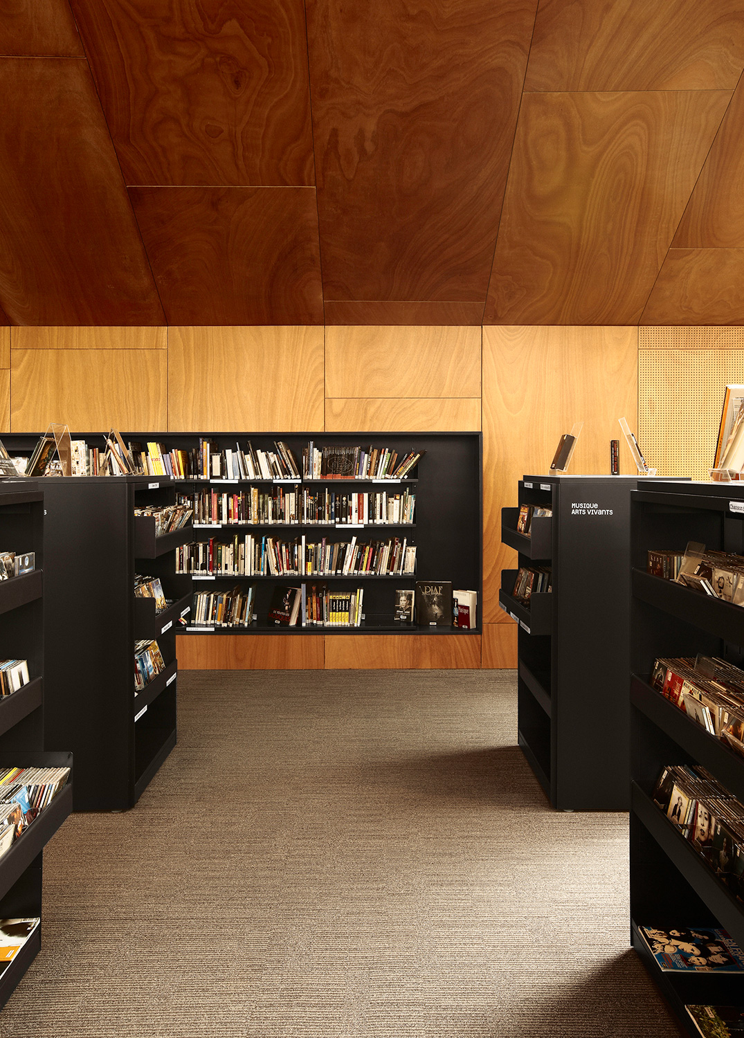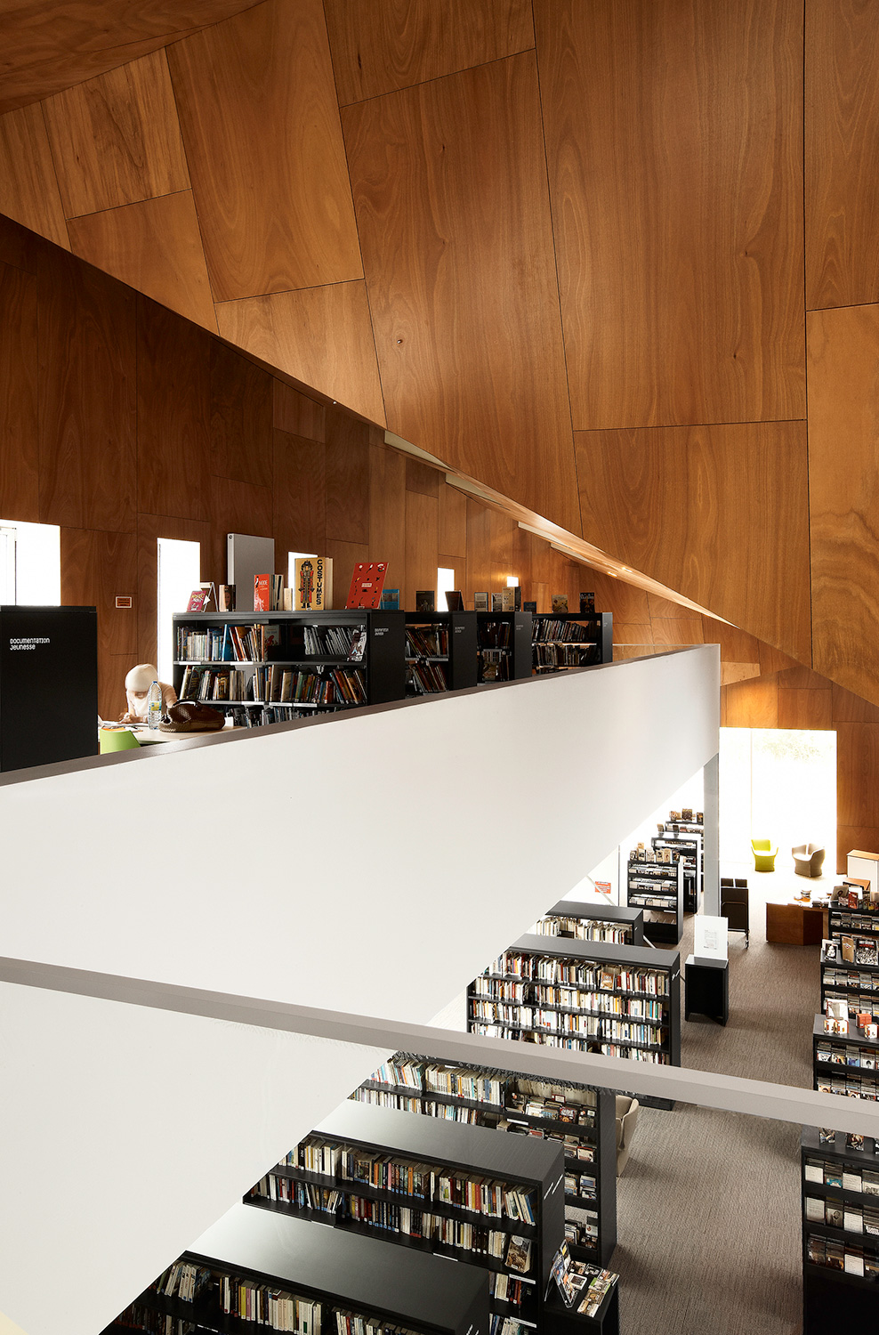Im Innern fügt das BCI Regalsystem 60/30 mit London Seitenverkleidungen und Abdeckböden Funktionalität hinzu und trägt dazu bei, die Mediathek zu einer starken Umgebung für das Lesen und die Erfahrung der neuen Kulturmedien zu machen.