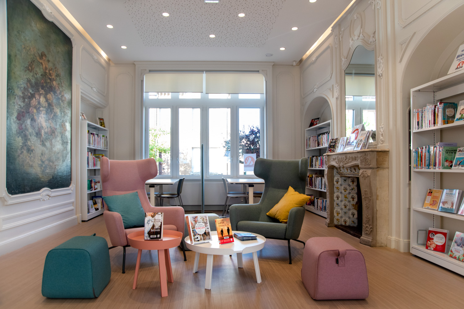 Bei der Renovierung dieses Gebäudes wurden historische Details wie der Kamin und die gemalten Dekorationen bewahrt, um den Lesern ein heimeliges Gefühl zu vermitteln. Die Regale und die Einrichtung schaffen eine ästhetische Atmosphäre, die von den Benutzern geschätzt wird. Die Auswahl der Möbel und Farben betont die neue Gestaltung.