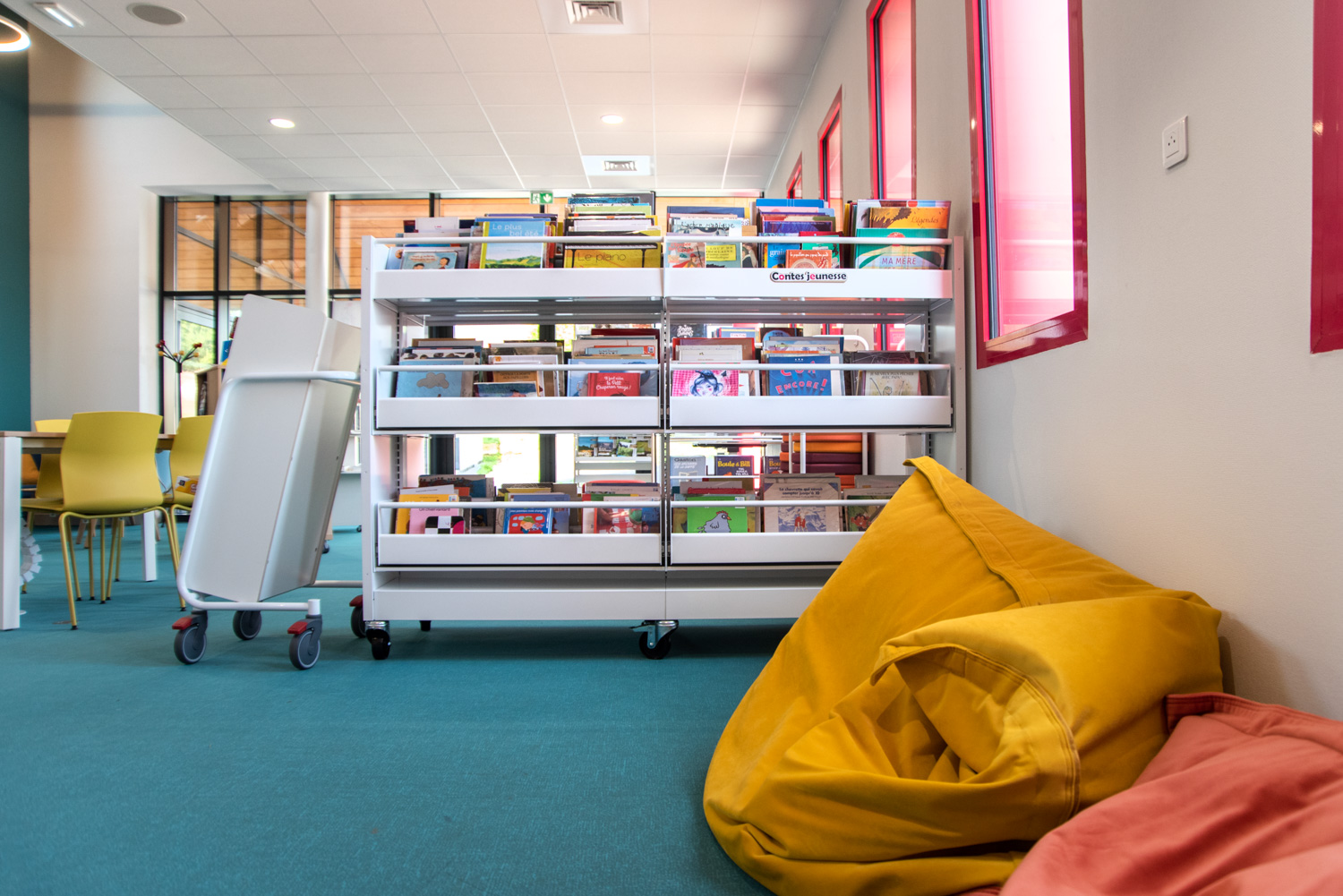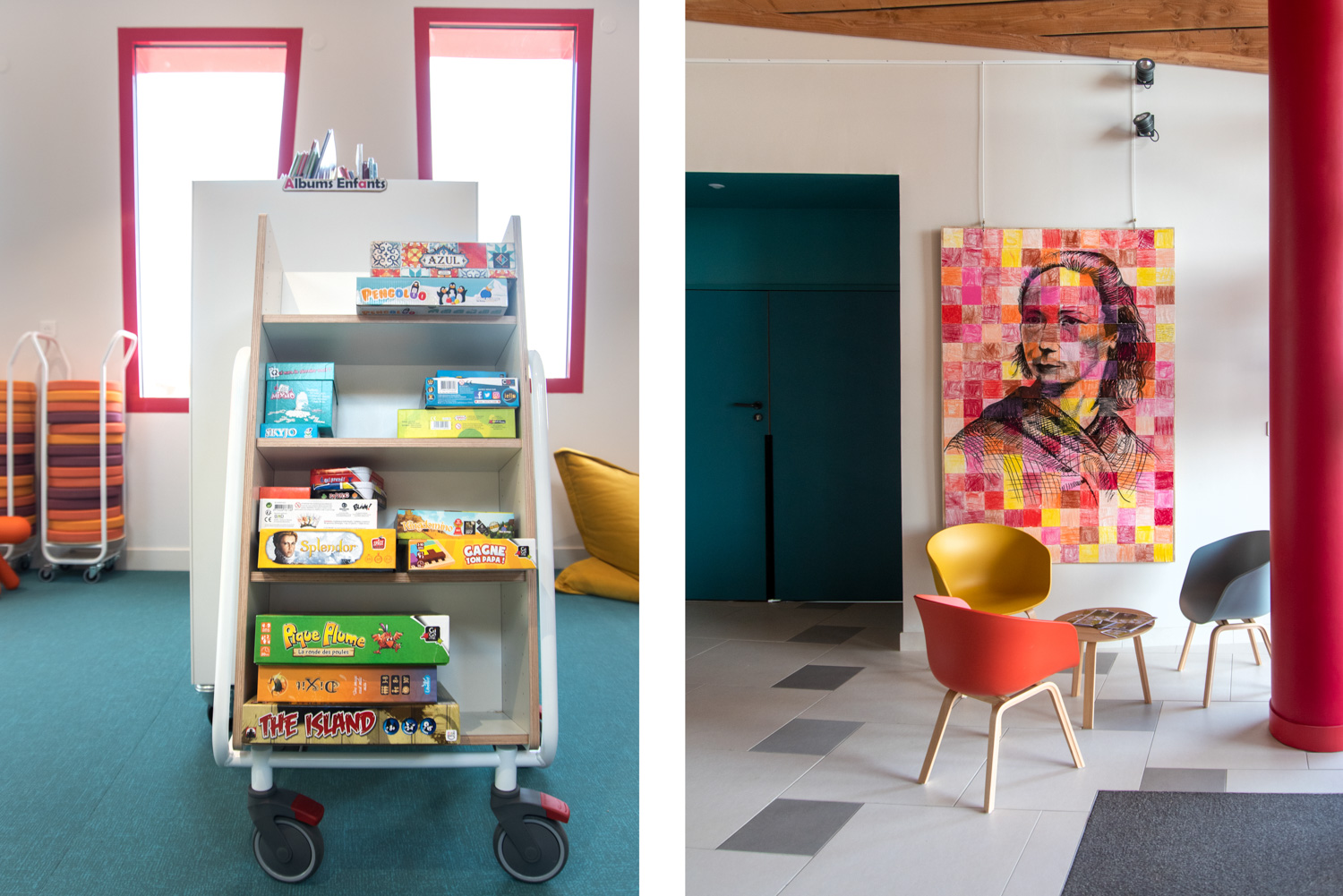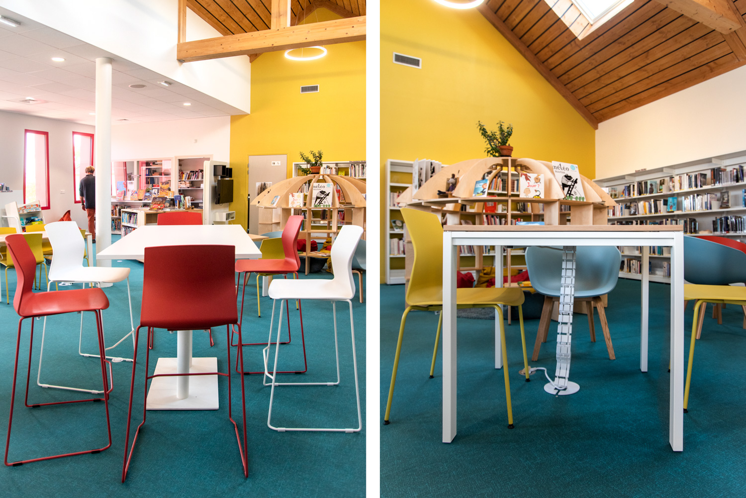 Das Layout dieser Mediathek ist das Ergebnis einer echten Zusammenarbeit mit dem Architekten, der Gemeinde, dem Bibliothekar und dem Team von BC Intérieur bei der Auswahl der Möbel, Farben und Stoffe. Es ist uns gelungen, an einem relativ kleinen Ort (100 m²) einen Raum zu schaffen, der jedem Publikum gewidmet ist: Die Holzhütte ist die Zuflucht der Kleinen, das Sofa lädt Eltern ein, ihren Kindern eine Geschichte vorzulesen, die hohe Bar ist der ideale Ort, an dem sich alle gerne treffen, um zu spielen, verbundene Tische zur Arbeit, dicke Jungs zum Einrollen, kleine bequeme Sessel, um Kaffee zu trinken, während sie ihre Zeitschrift lesen... man fühlt sich dort sehr wohl.