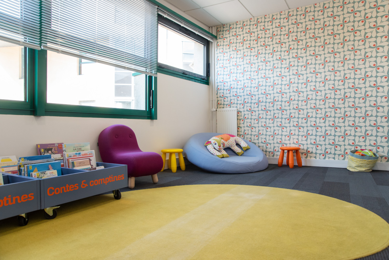 Ein Schaukelstuhl für einen neuen Vintage-Bereich, eine Cocoon-Hütte am Eingang zur Kleinkinderecke und zwei große Hasen, die geduldig auf die Teenager warten. Eine solide Sammlung in diesem schönen, vollständig renovierten Raum.