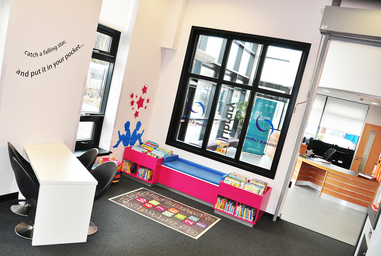 Das Hauptziel war, einen geeigneten Raum für digitales Lesen und Lernen zu schaffen mit einem begrenzten Buchbestand, aber starkem Focus auf E-Reader. So konzentrierte sich unsere Inneneinrichtung auf Lieferwege, die neue Technologien umfassen, einschließlich PC-Stationen und - zu unserem Stolz und unserer Freude - „The Gadget Bar“, einen Tisch, der sowohl für zufällig herein- kommende Nutzer als auch für Unterrichtseinheiten konfiguriert ist.