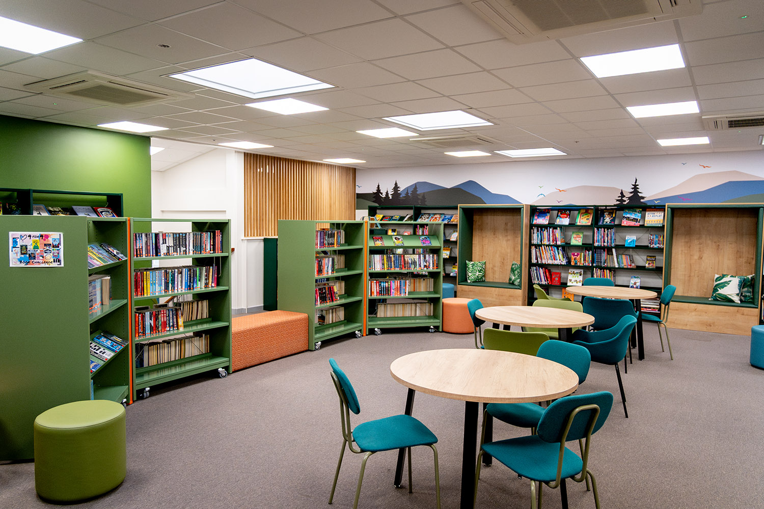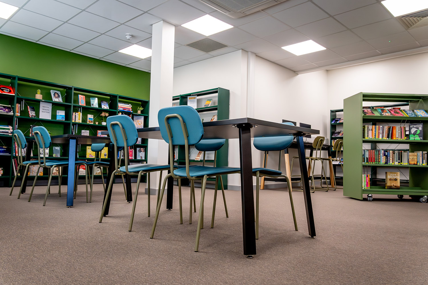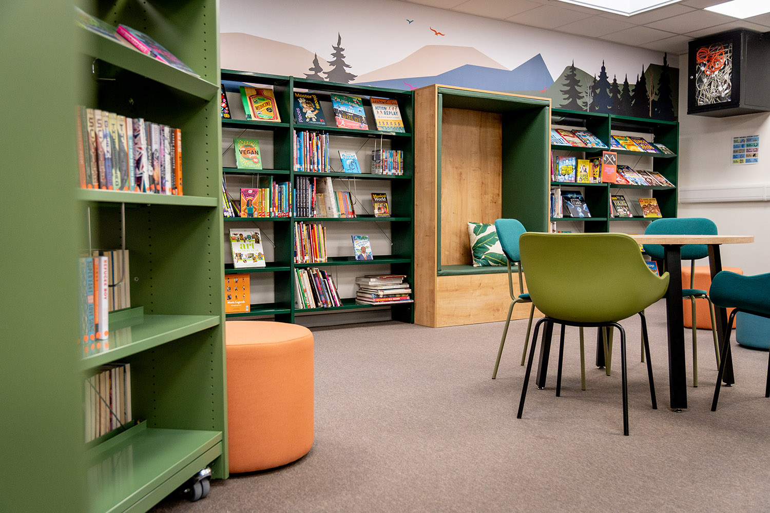 Besondere grafische Elemente wurden mit Hilfe der Schüler selbst entworfen, was dem Raum eine ganz persönliche Note und ein Gefühl der Eigenverantwortung verleiht. Die Farben der Polstermöbel und die grünen Regale sorgten dafür, dass alle Aspekte der Bibliotheksgestaltung nahtlos integriert wurden.