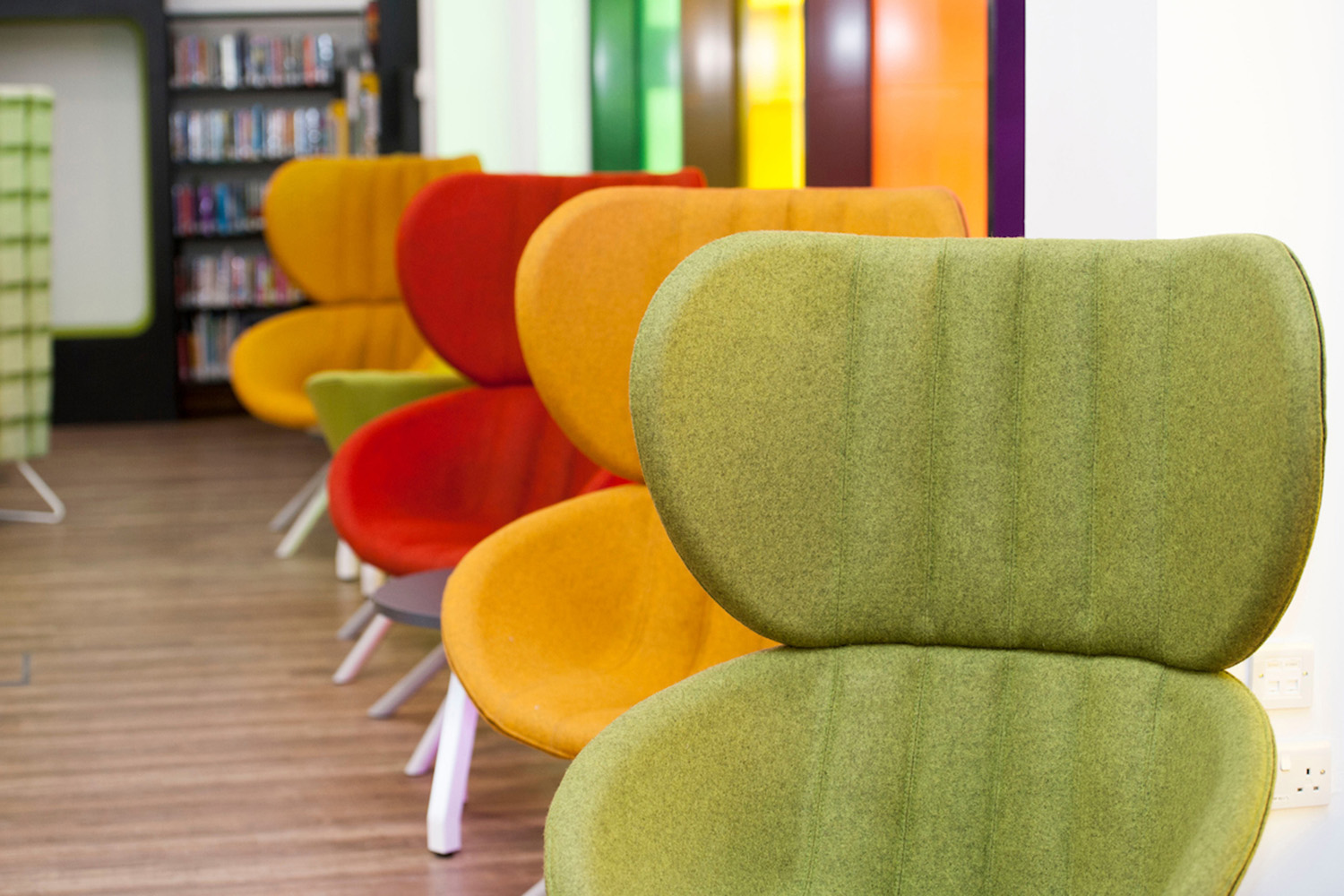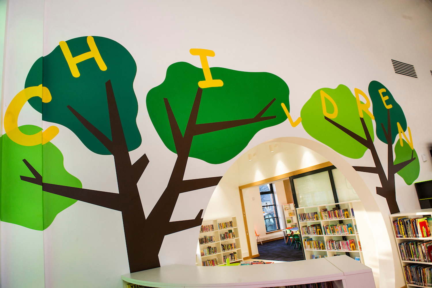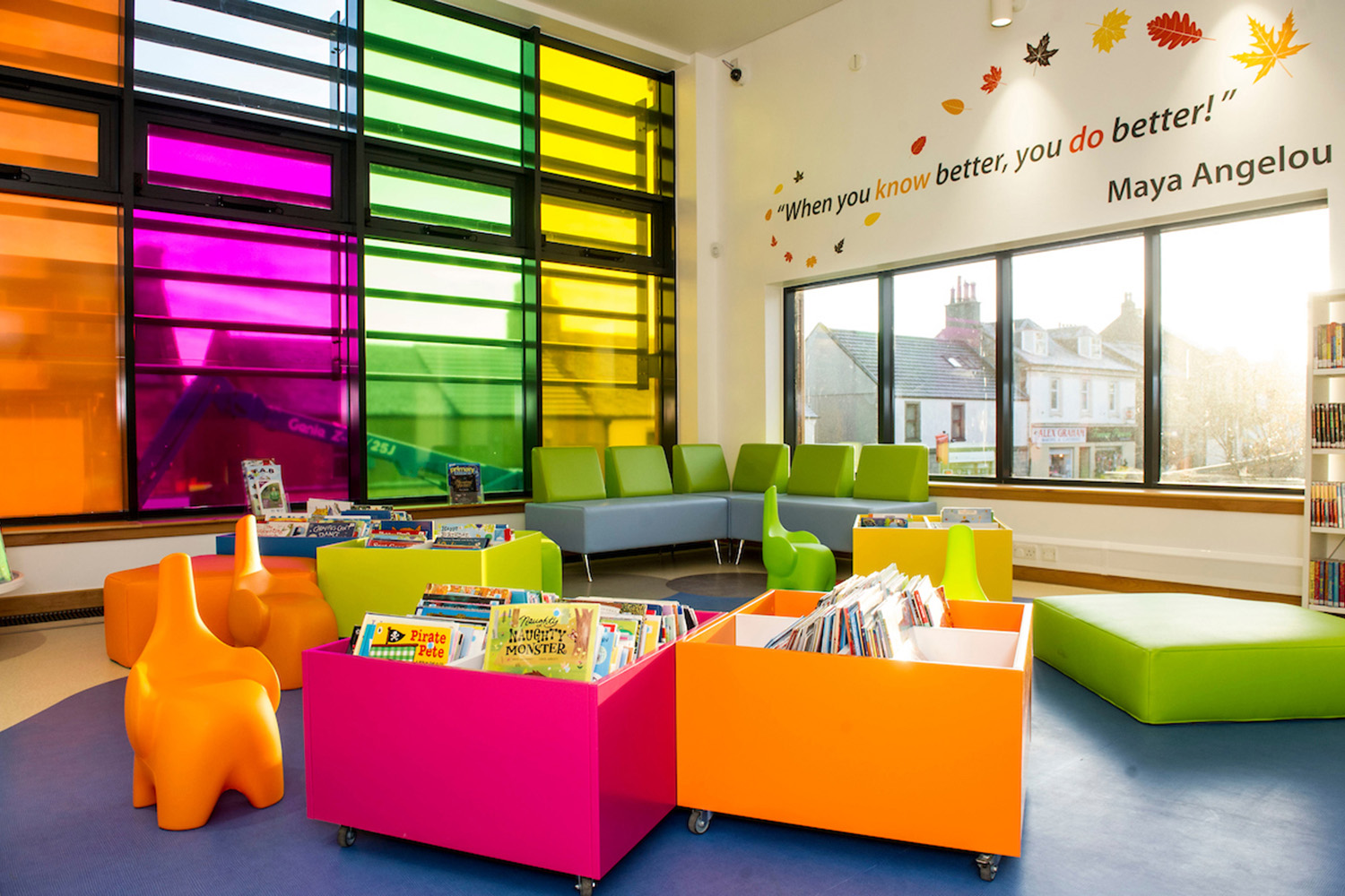 Helle Farben und eine sagenhafte Kinderabteilung bewirken bei dieser Bibliothek einen unbestreitbaren WOW-Effekt.