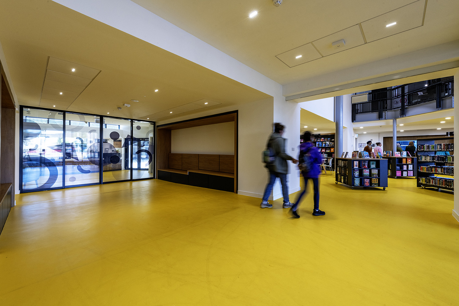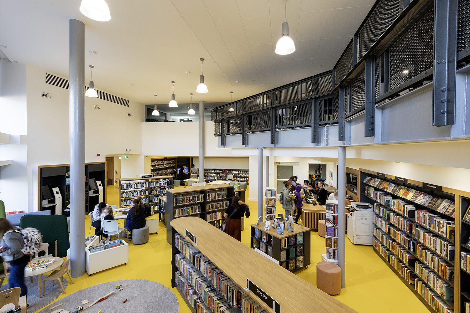 Die Bibliothek erstreckt sich über zwei Ebenen, mit Büchern im Erdgeschoss und einem Kompetenzzentrum im Obergeschoss. Es gibt gemeinsame Räume, die mit dem Lernzentrum für Kleinkinder und dem Kunstzentrum genutzt werden. Große Fenster mit Blick auf den Platz ermöglichen eine freie Sicht: links auf das Kunstzentrum und rechts auf die Bibliothek.