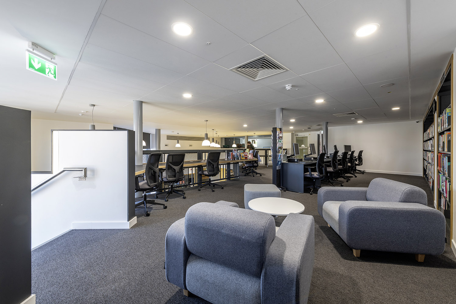 Die Auswahl der Regale und Möbel für die Bibliothek spielte eine zentrale Rolle bei der Schaffung einer harmonischen und gleichzeitig funktionalen Atmosphäre, die das Ethos des Macmillan-Hub-Projekts widerspiegelt. Die modularen und flexiblen Regalsysteme wurden bewusst gewählt, um den sich wandelnden Anforderungen der Bibliothek gerecht zu werden. Durch den offenen Grundriss und die anpassungsfähigen Einrichtungselemente entsteht ein Raum, der Besucher dazu einlädt, die Bibliothek zu erkunden und miteinander in Interaktion zu treten.