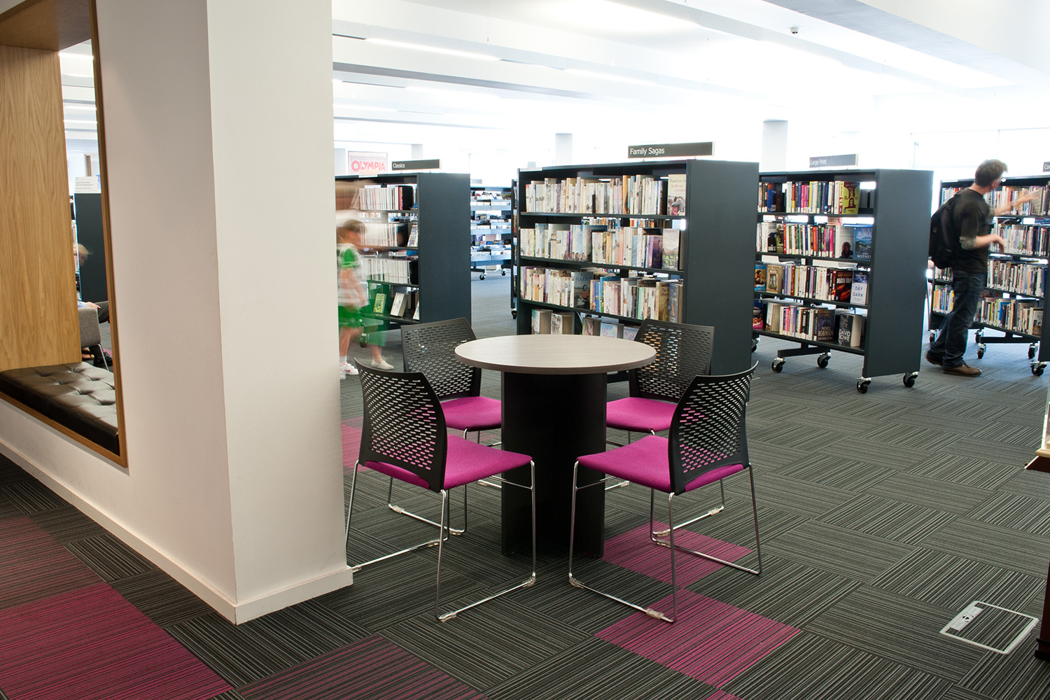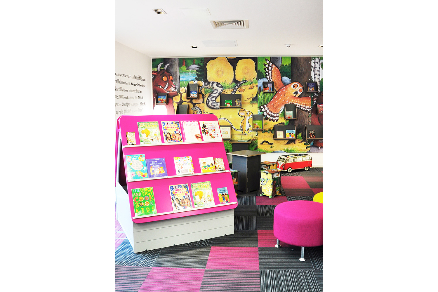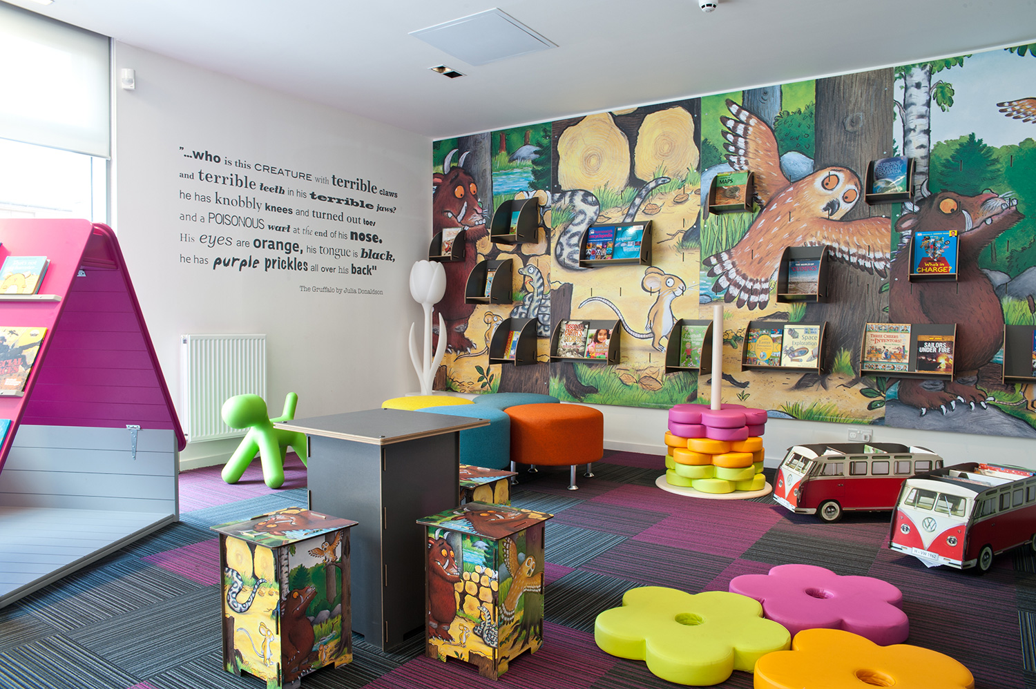 Die Hauptthemen und Bereiche der Bibliothek werden durch Grafiken und Schilder, die mit Genehmigung der Hofdichterin der Kinder, Julia Donaldson, verwendet werden, noch weiter verbessert. Dabei setzten wir ihre beliebten Gruffalo-Darstellungen als Wandgrafiken in der Kinderabteilung ein und führten dieses Thema bis hin zu den maßgeschneiderten Minimöbeln weiter.