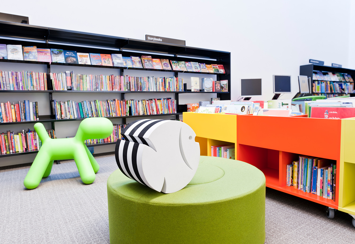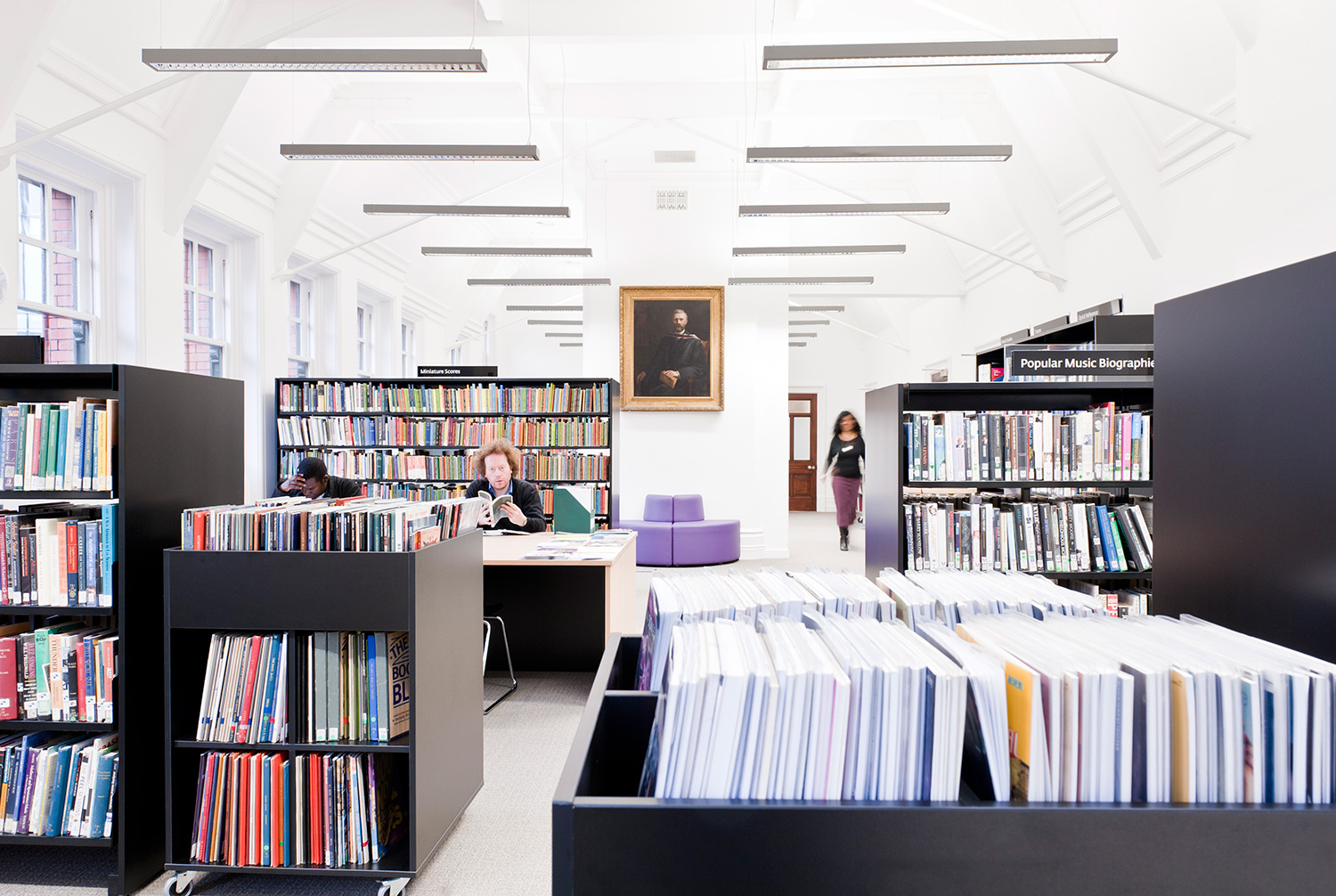 The library is equipped with Classic Steel Shelving System and specially made key pieces of furniture, designed to highlight the current quick pick furniture. The library share the same basic concept as Longsight, Beswick and Brookland, but the unique colour themes and a couple of characteristics details give the library its own identity.