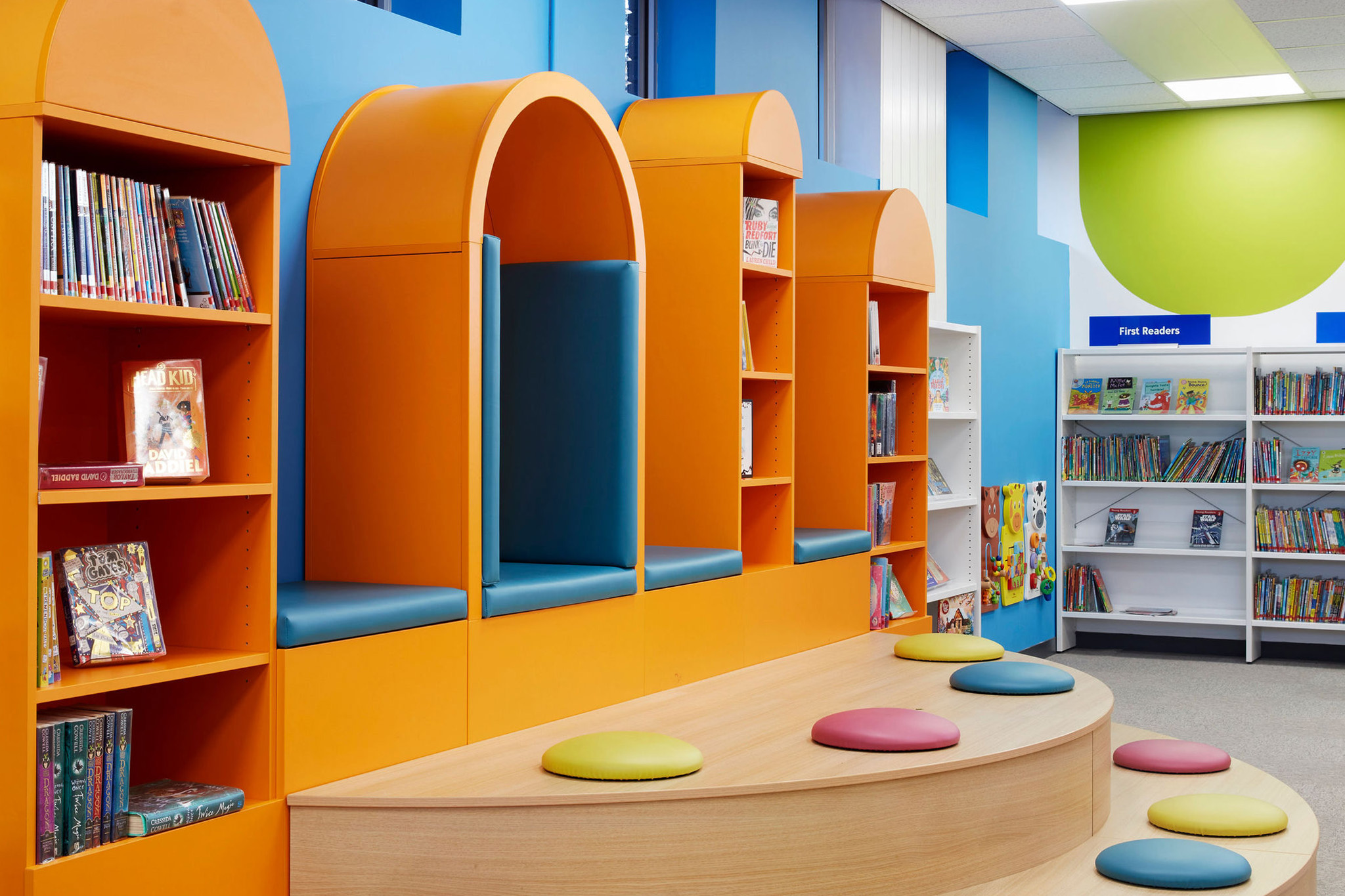 Der Kinderbereich ist verspielt und einladend mit lebhaften Farben und lustigen Formen gestaltet, um Kinder in die Bibliothek zu locken und sie zu ermutigen, die große Auswahl an Büchern zu entdecken. Der maßgeschneiderte Bühnenbereich kann für verschiedene Aktivitäten genutzt werden und eignet sich sowohl für Einzelpersonen als auch für Gruppen. Die Einbeziehung sensorischer Elemente in die Gestaltung des Kinderbereichs war sehr wichtig, um sicherzustellen, dass der Bereich für alle Familien zugänglich und einladend ist.