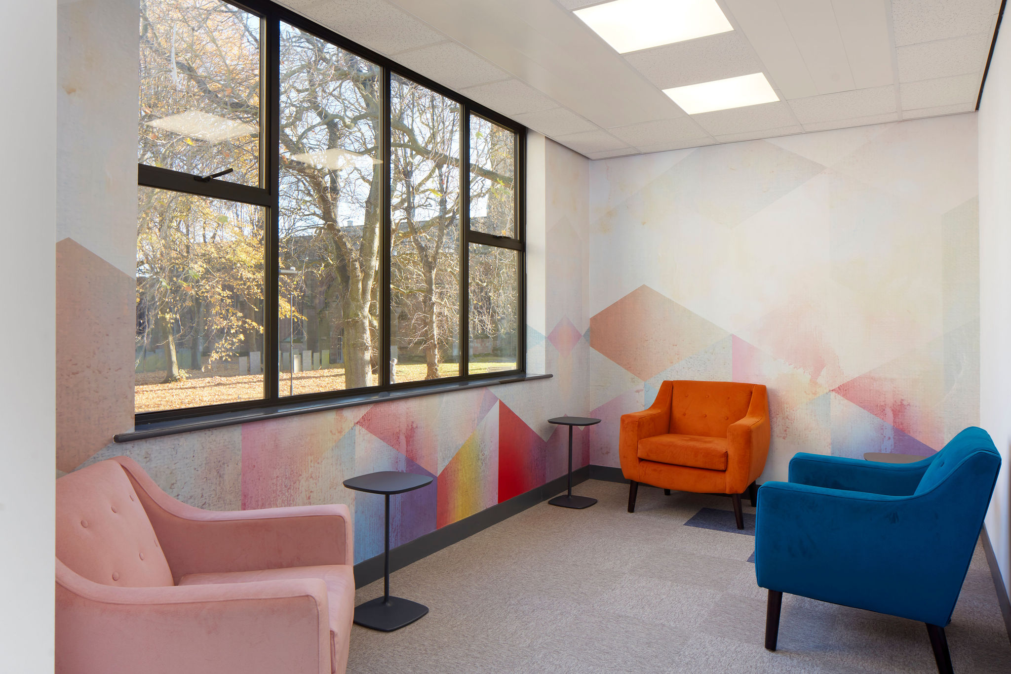 Besonderes Gewicht wurde auf die Auswahl von Stoffen und Farben für alle Polstermöbel gelegt. Unsere Gesellschaft in Großbritannien, thedesignconcept, wählte alle Farben in der gesamten Bibliothek aus und ergänzte sie mit sorgfältig ausgewählten digitalen Grafiken und inspirierenden Zitaten, um die Atmosphäre des Raumes positiv zu beeinflussen und die Benutzer zu motivieren. Wir entwarfen einen Teppich in verschiedenen Farben, der sich jeder zukünftigen Raumgestaltung anpasst.