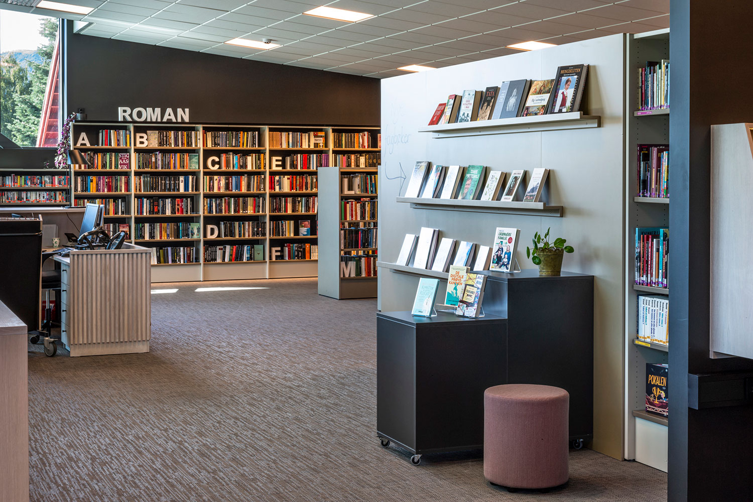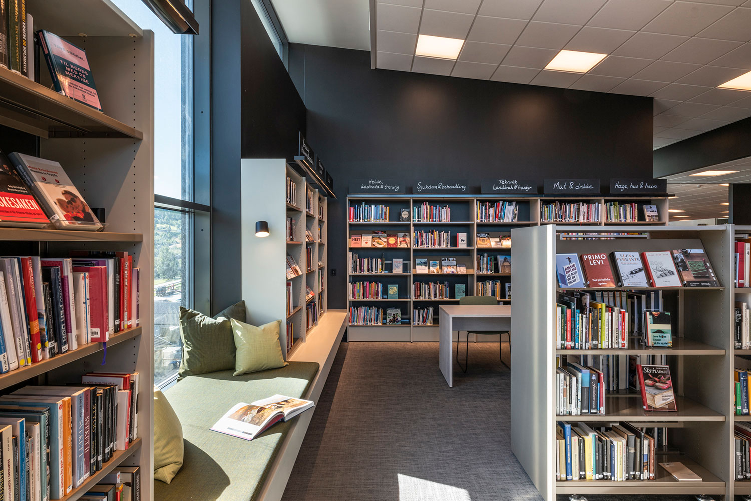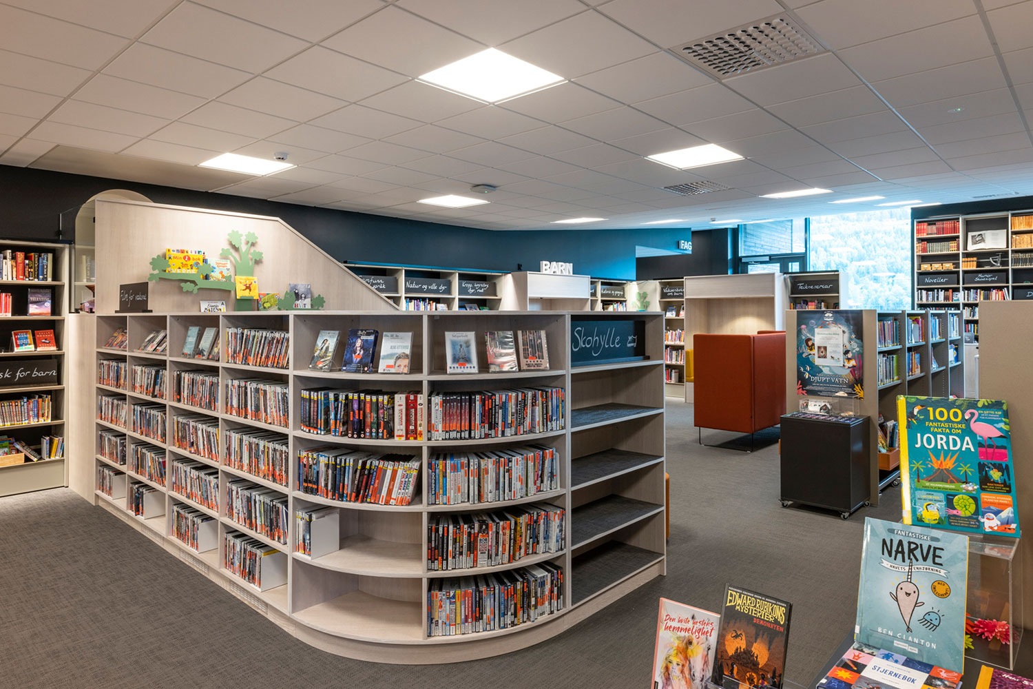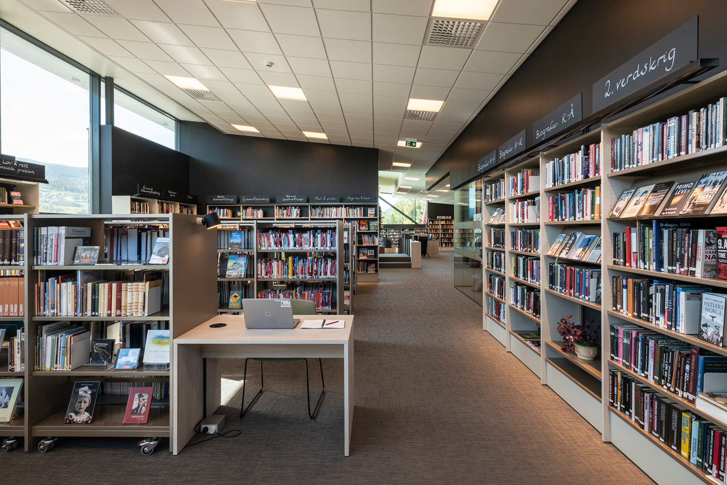Die Bibliothek von ÅL befindet sich in einer erstaunlichen Lage auf dem neuen Erweiterungsbau des Kulturhauses. Das Design der Bibliothek betont den Raum, die Beleuchtung und flexible, mobile Möbel. Durch die flexible Inneneinrichtung lassen sich die Räumlichkeiten leicht an die Jahreszeiten, Veranstaltungen und Aktivitäten anpassen und die verwendeten Farben sind von der lokalen Rosenmalerei-Tradition inspiriert.