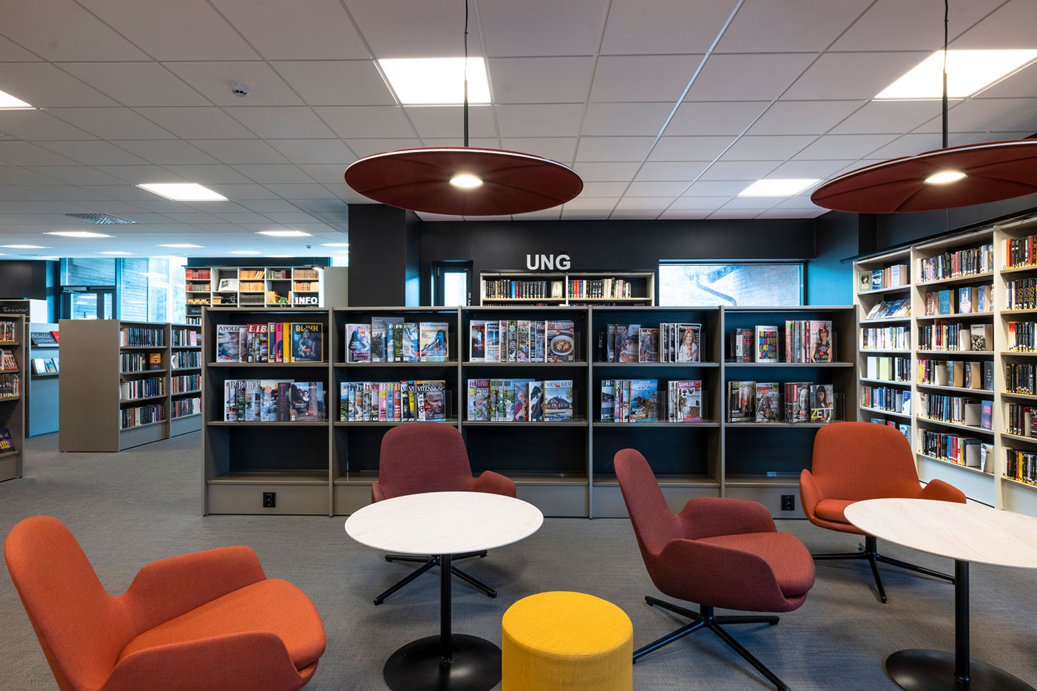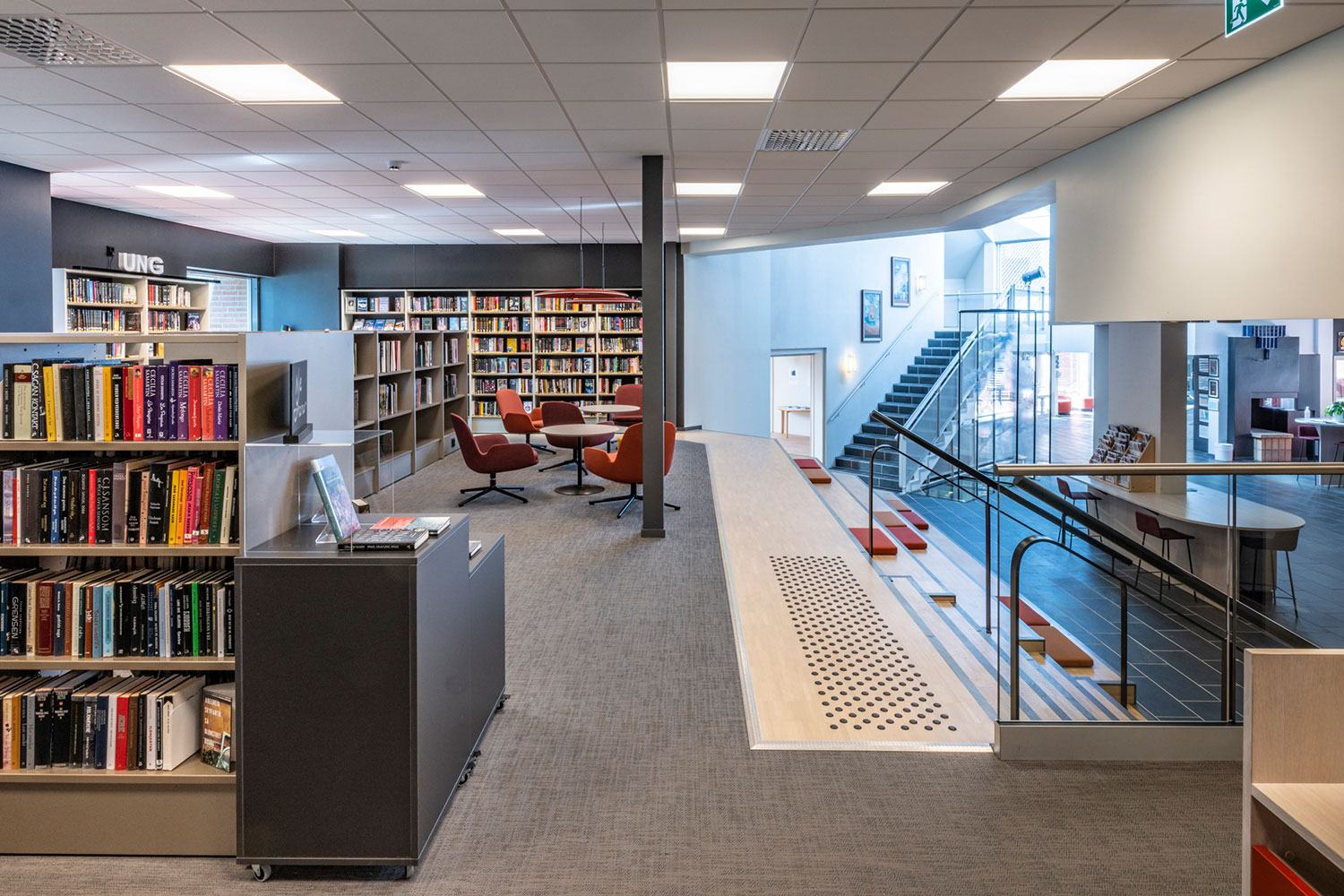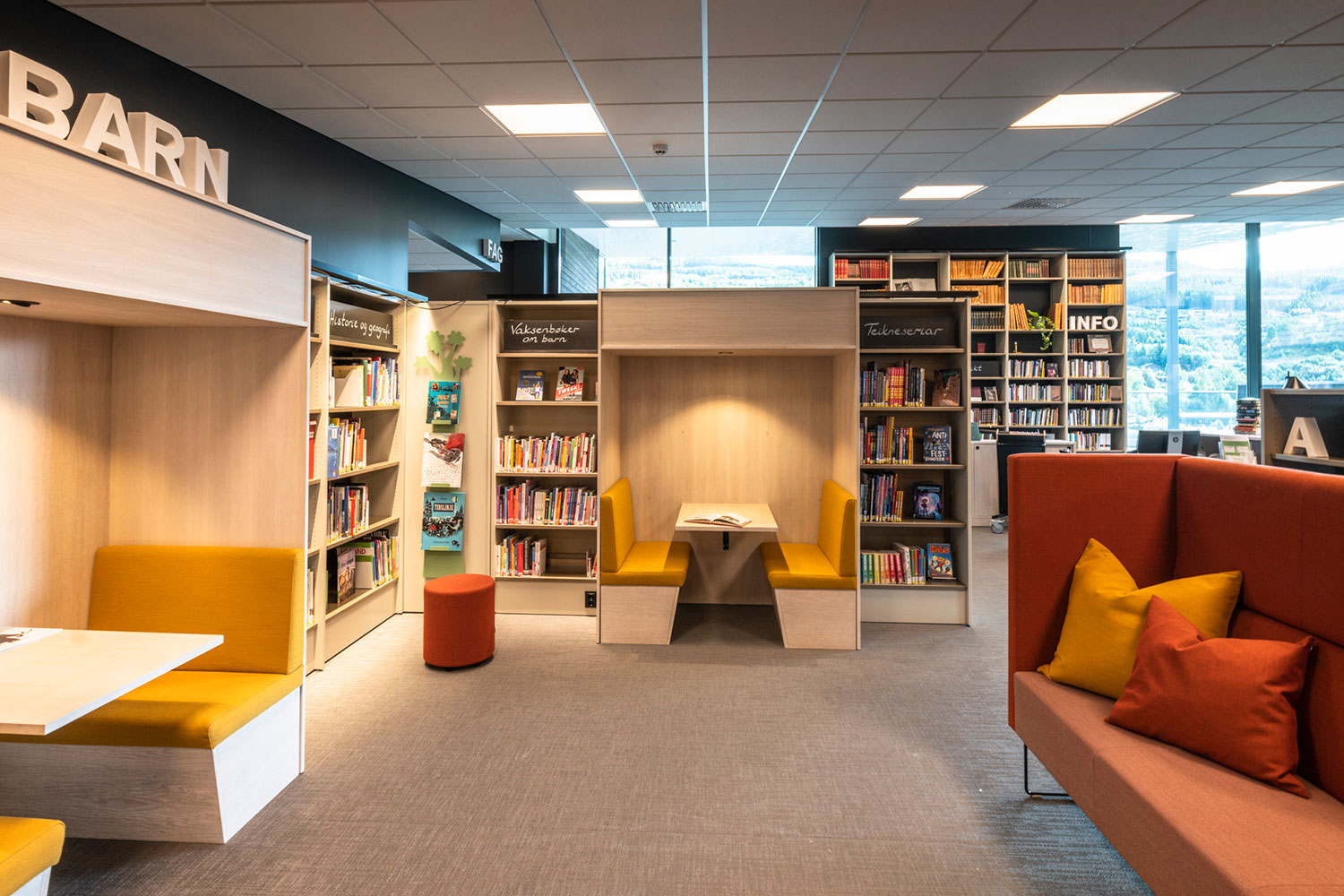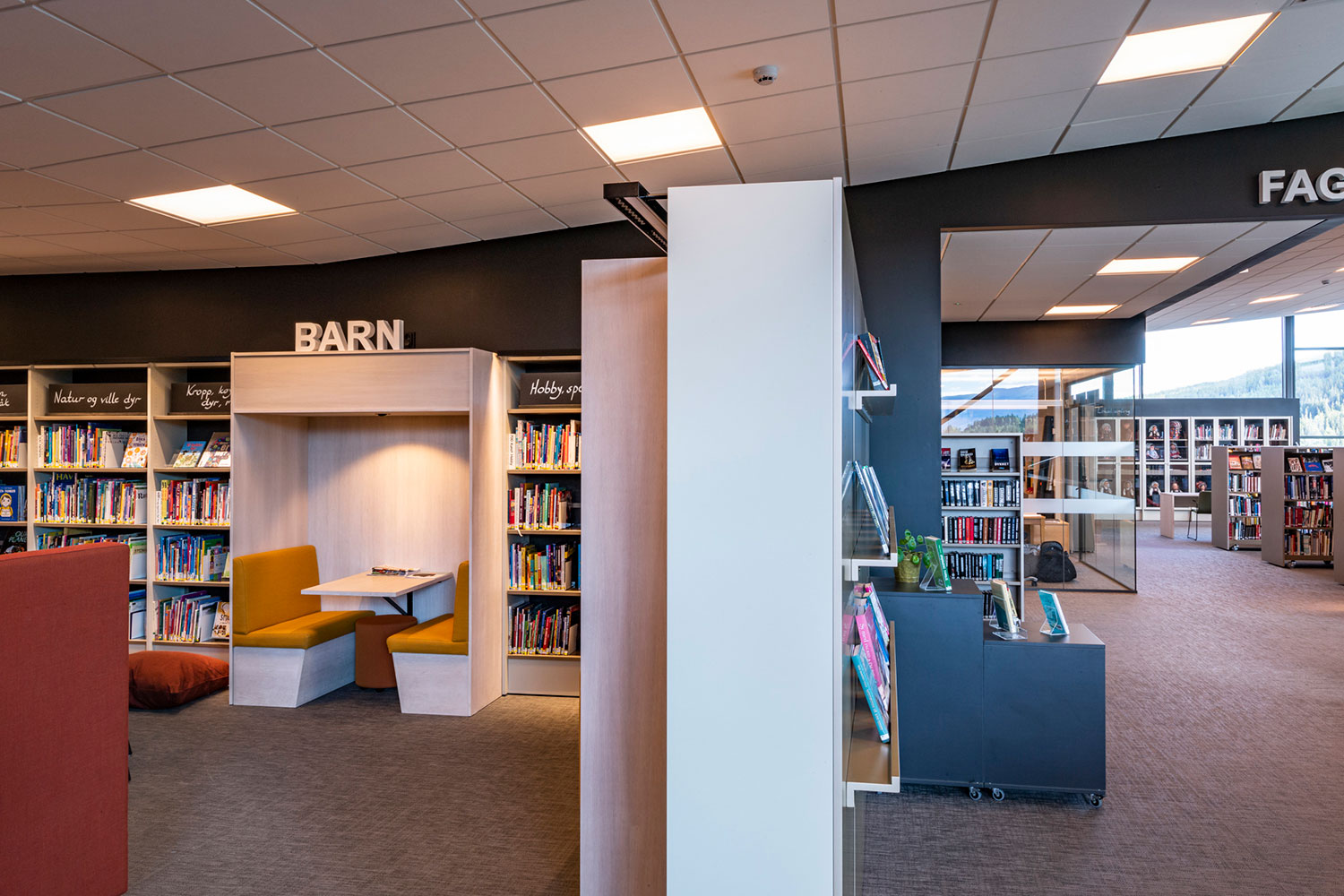 Die Bibliothek von ÅL befindet sich in einer erstaunlichen Lage auf dem neuen Erweiterungsbau des Kulturhauses. Das Design der Bibliothek betont den Raum, die Beleuchtung und flexible, mobile Möbel. Durch die flexible Inneneinrichtung lassen sich die Räumlichkeiten leicht an die Jahreszeiten, Veranstaltungen und Aktivitäten anpassen und die verwendeten Farben sind von der lokalen Rosenmalerei-Tradition inspiriert.