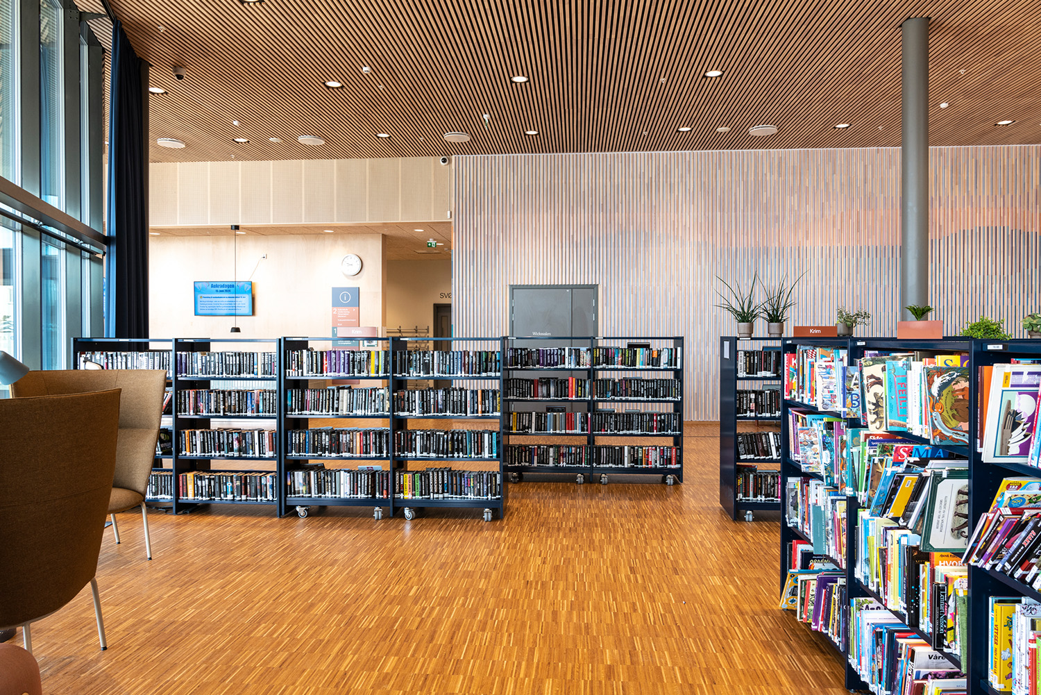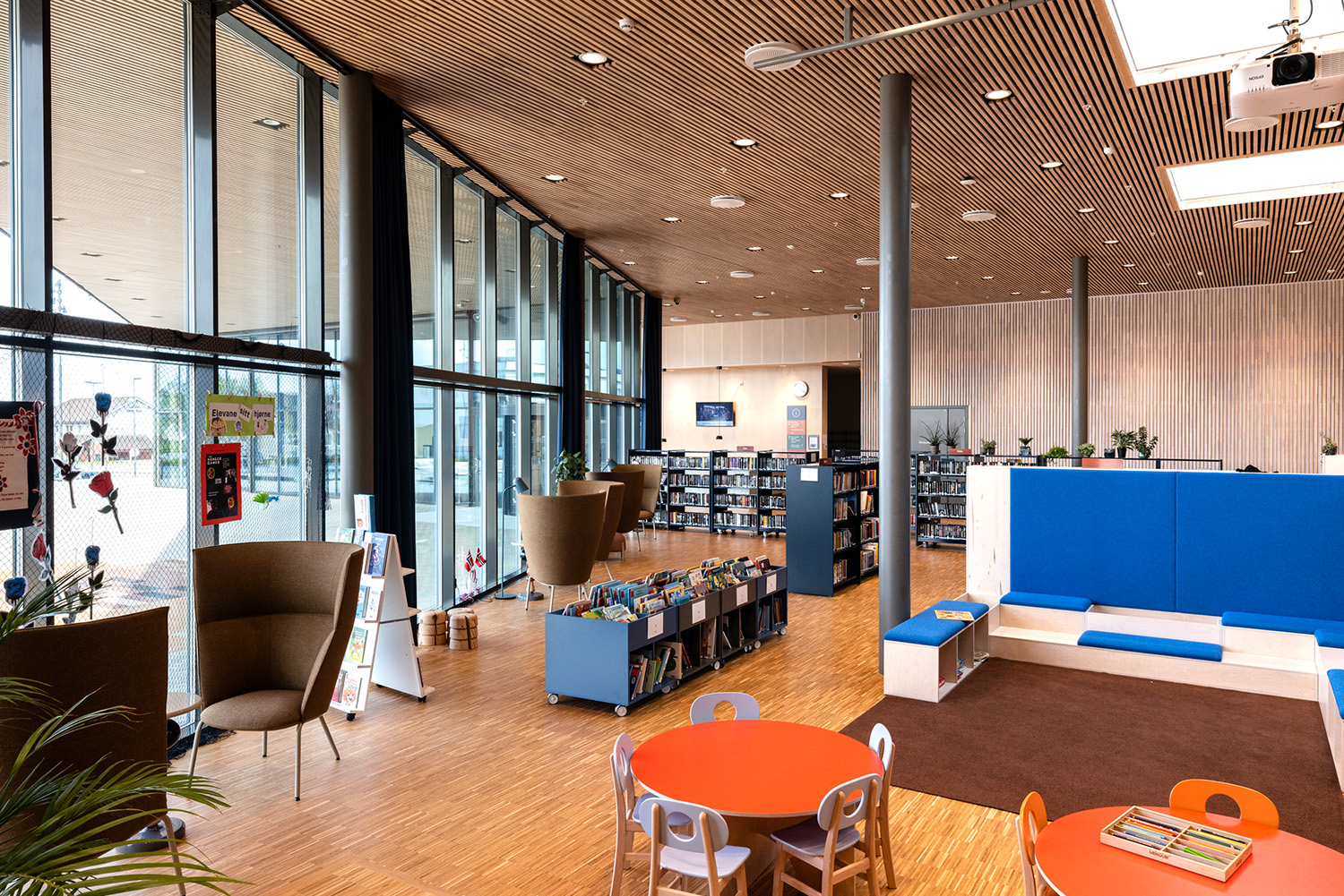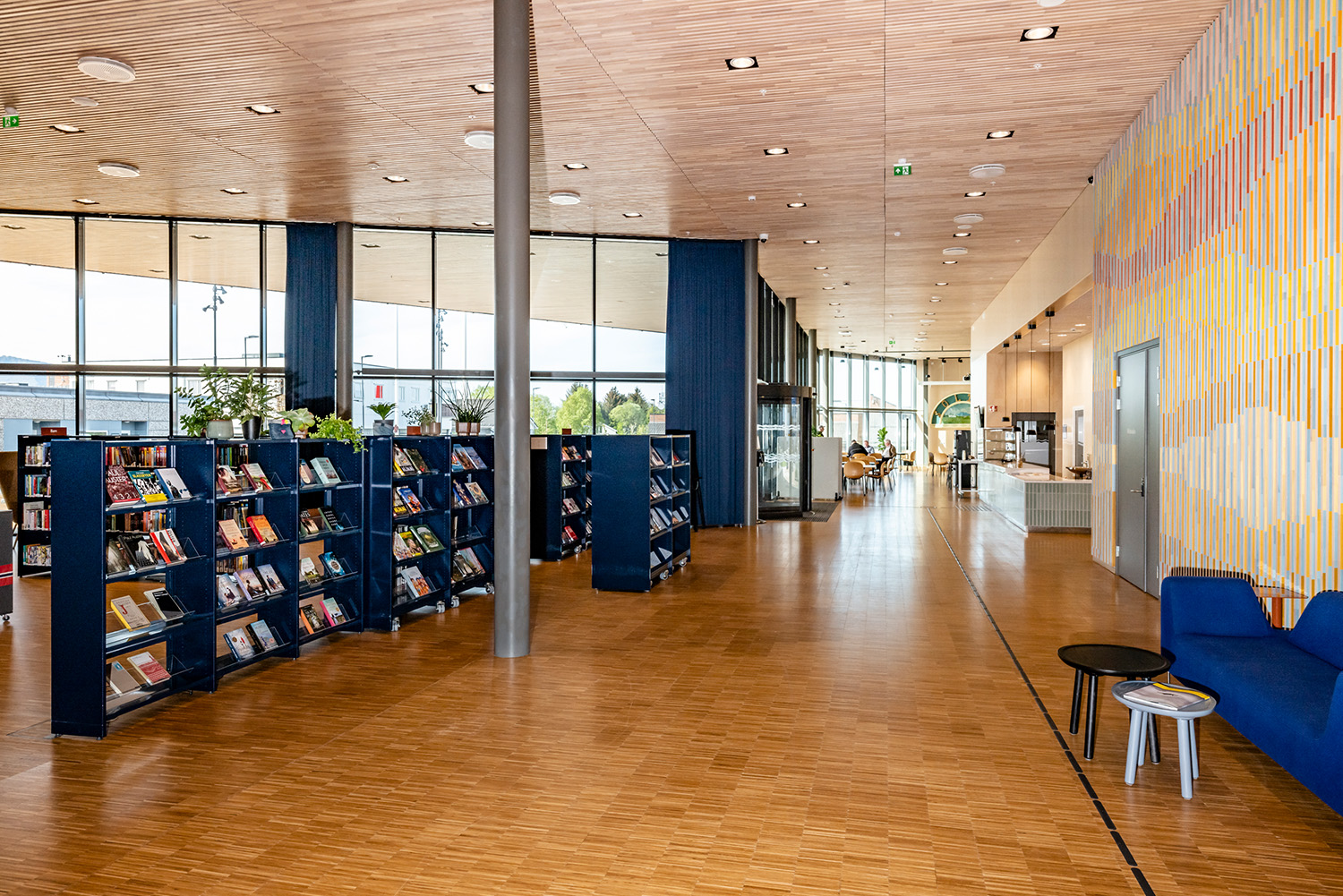 Die Bibliothek befindet sich strategisch günstig im Untergeschoss des Kulturzentrums, das sich durch hohe Decken und große Fenster auszeichnet. Das Zentrum beherbergt außerdem ein Hallenbad, ein Café, eine Kulturschule und einen großen Saal mit 220 Sitzplätzen, der für Filmvorführungen, Konzerte und Theateraufführungen genutzt wird, sowie einen Jugendclub und Büroräume.