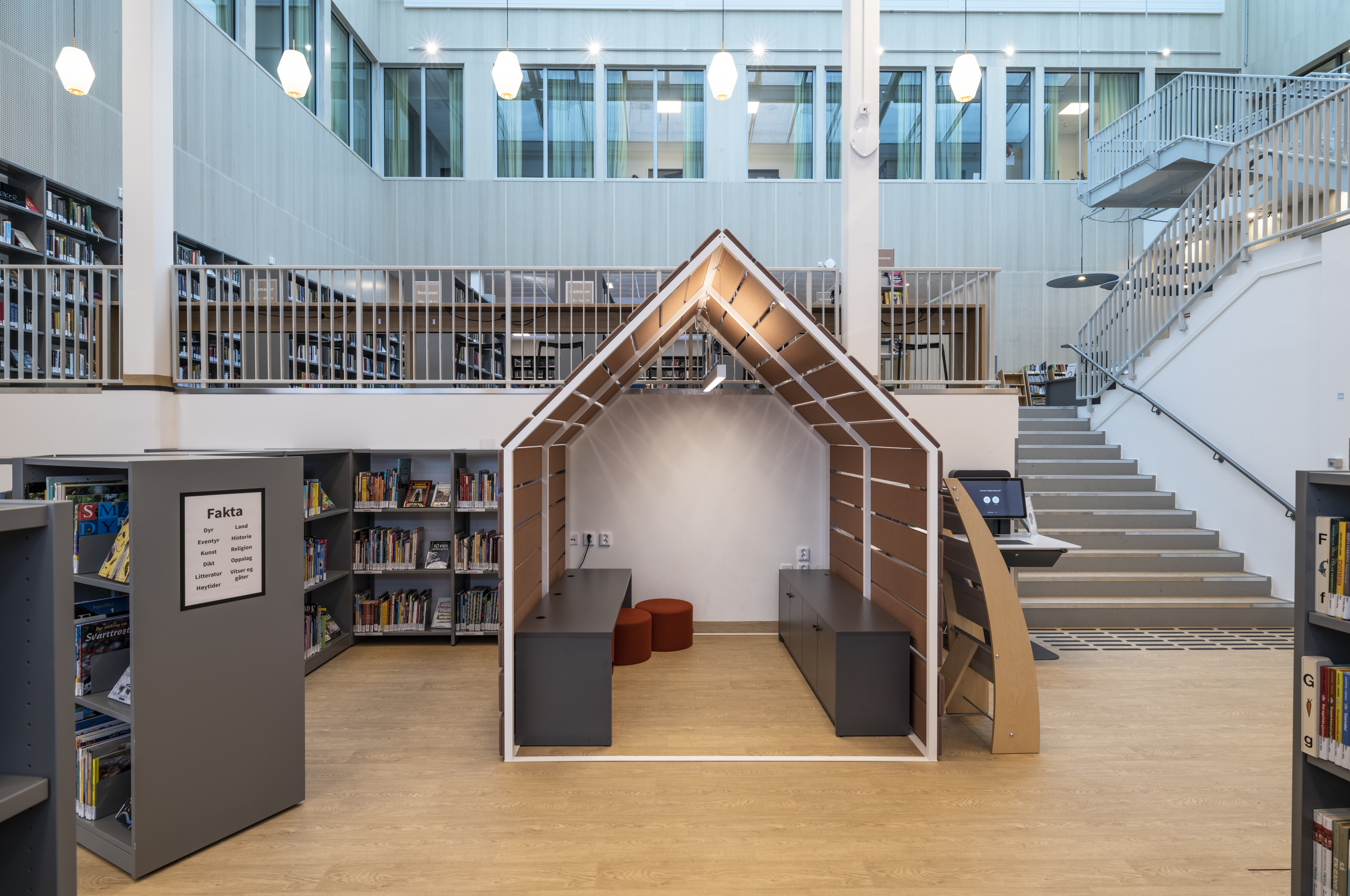 Die Kinderbibliothek befindet sich auf der unteren Ebene, mit speziellen Räumen für das Geschichtenlesen und Aktivitäten für jüngere Kinder. Auf der mittleren Ebene befinden sich die Bereiche für Erwachsene und Jugendliche. Auf dieser Ebene befinden sich auch ein Informationsschalter und ein geräumiger, flexibler Bereich, der bei Bedarf leicht in einen Veranstaltungsraum umgewandelt werden kann. Das Zwischengeschoss bietet ruhigere Sitzbereiche und einen gemütlichen Lesesaal.