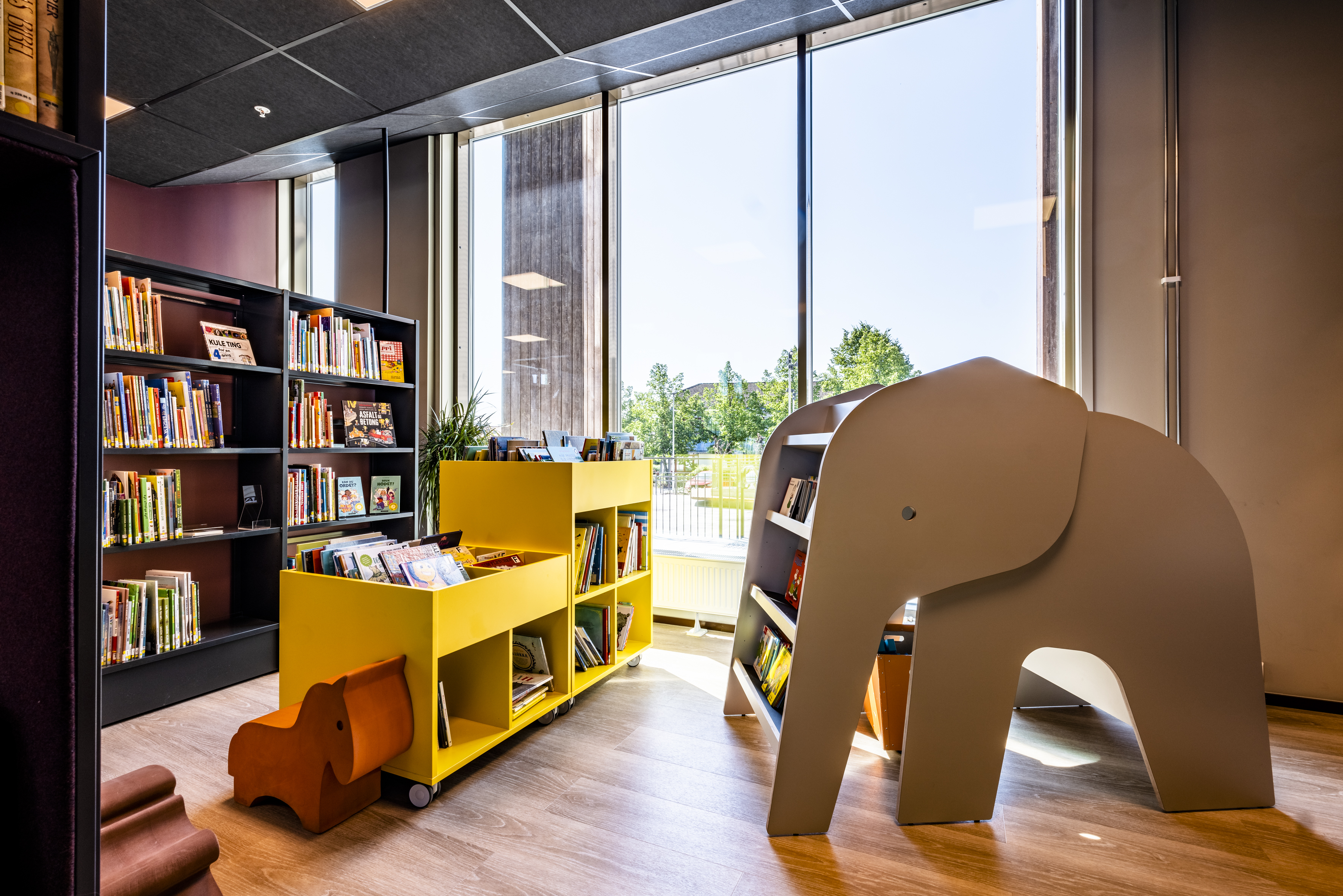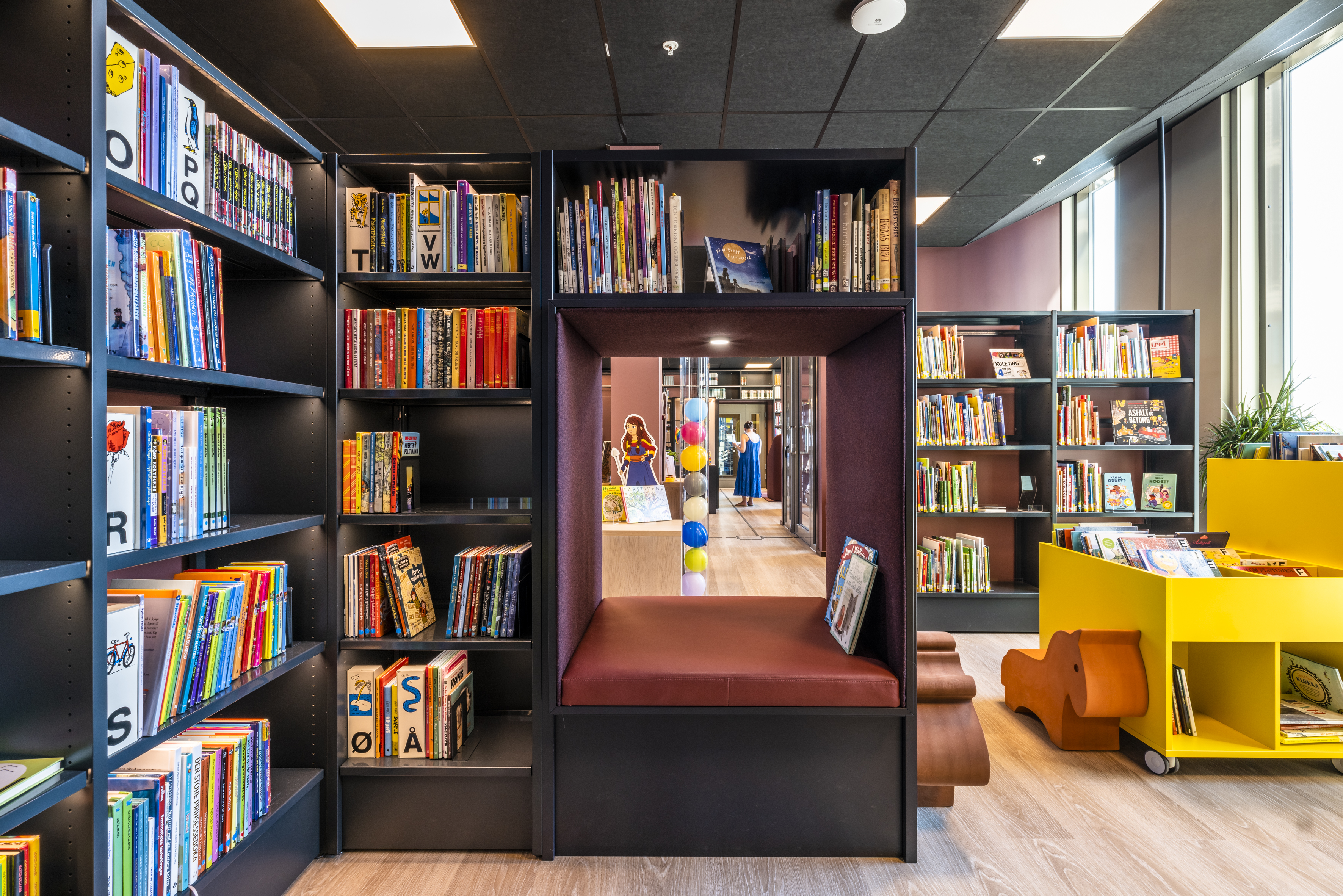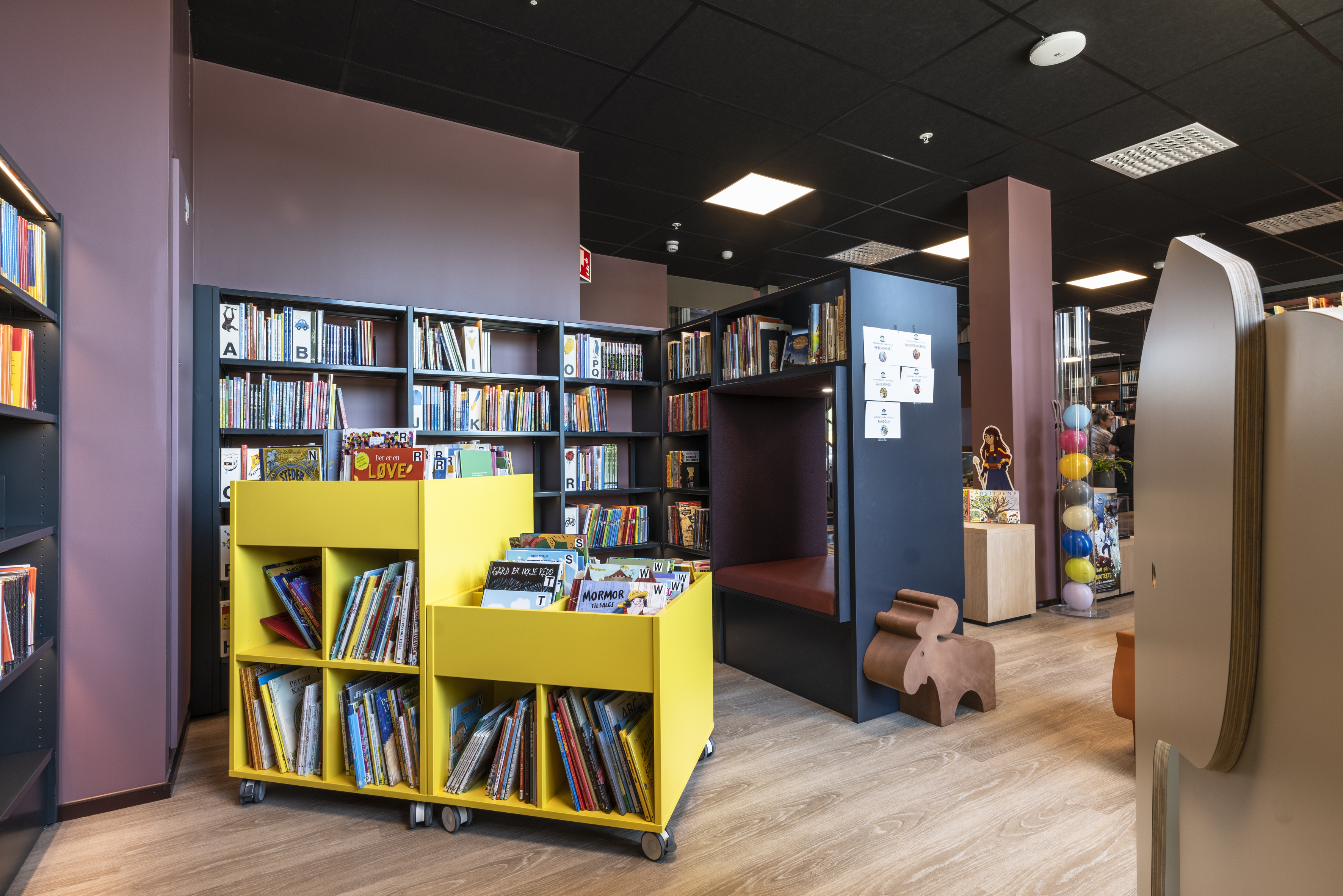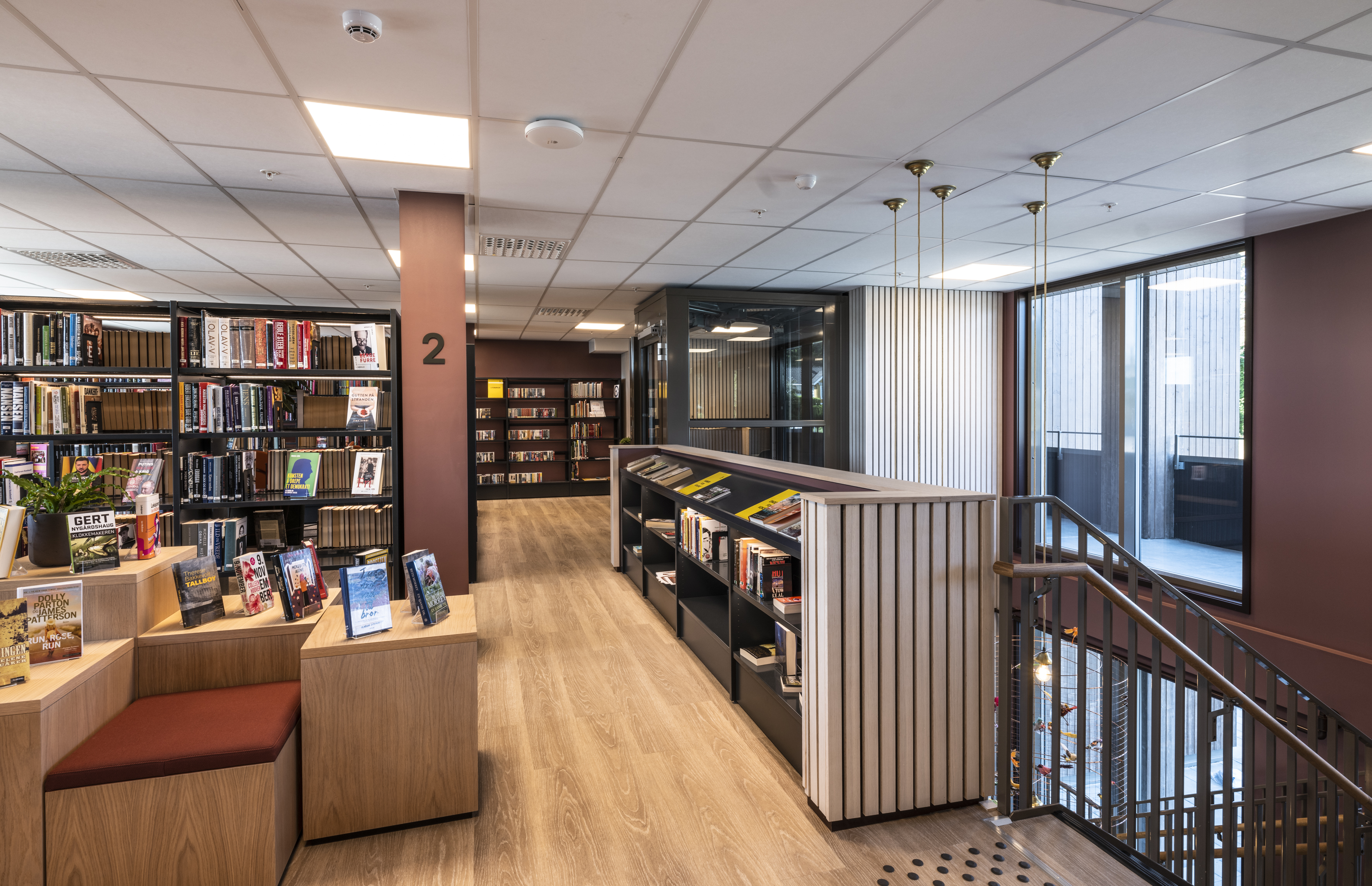 Im ersten Stock befinden sich die Kinderabteilung mit farbenfrohen Möbeln und Bilderbuchtrögen sowie die Erwachsenenabteilung für Sachliteratur und eine Zeitschriftenzone. Im zweiten Stock gibt es unter anderem Belletristik für Erwachsene mit einem eigenen „Raum“ für Krimis. Die Jugendabteilung hat einen etwas geschützteren Platz im Erdgeschoss erhalten, wo sich die Jugendlichen für Hausaufgaben und Gruppenarbeit in gemütliche Sitzecken zurückziehen können. Hier befindet sich auch die lokale Sammlung, gut erhalten in hohen Regalen mit abschließbaren Glastüren.
