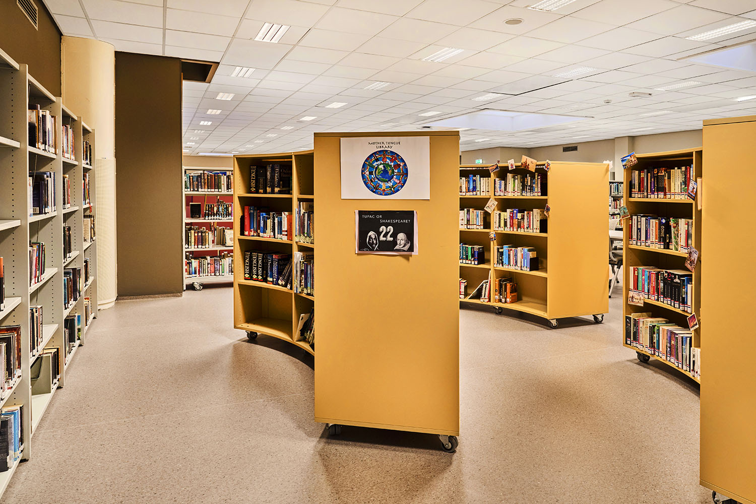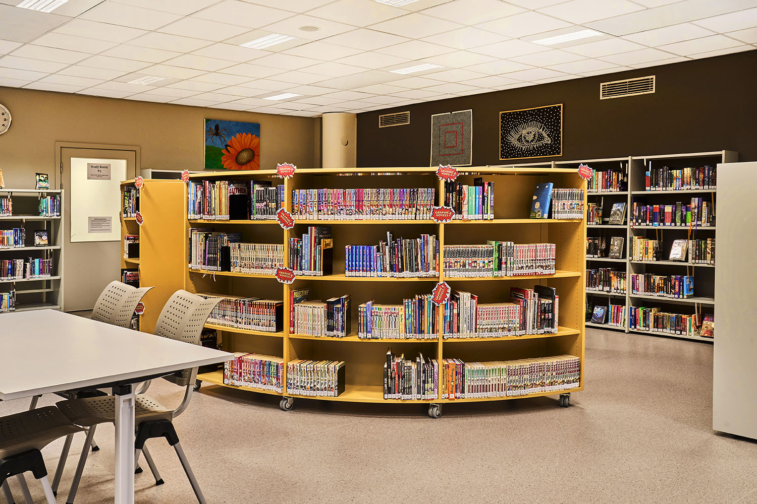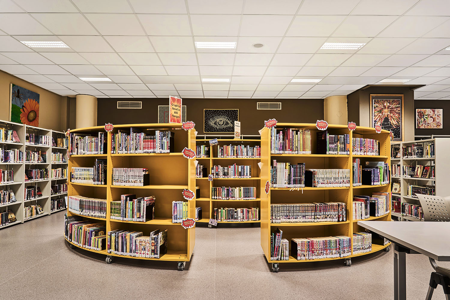 Die runden Regale schaffen kleine Räume in der Bibliothek und die sonnige gelbe Farbe verleiht dem Raum eine Wärme und Frische, was in schönem Kontrast zu den neutralen Farben der übrigen Bibliotheksmöbel steht.