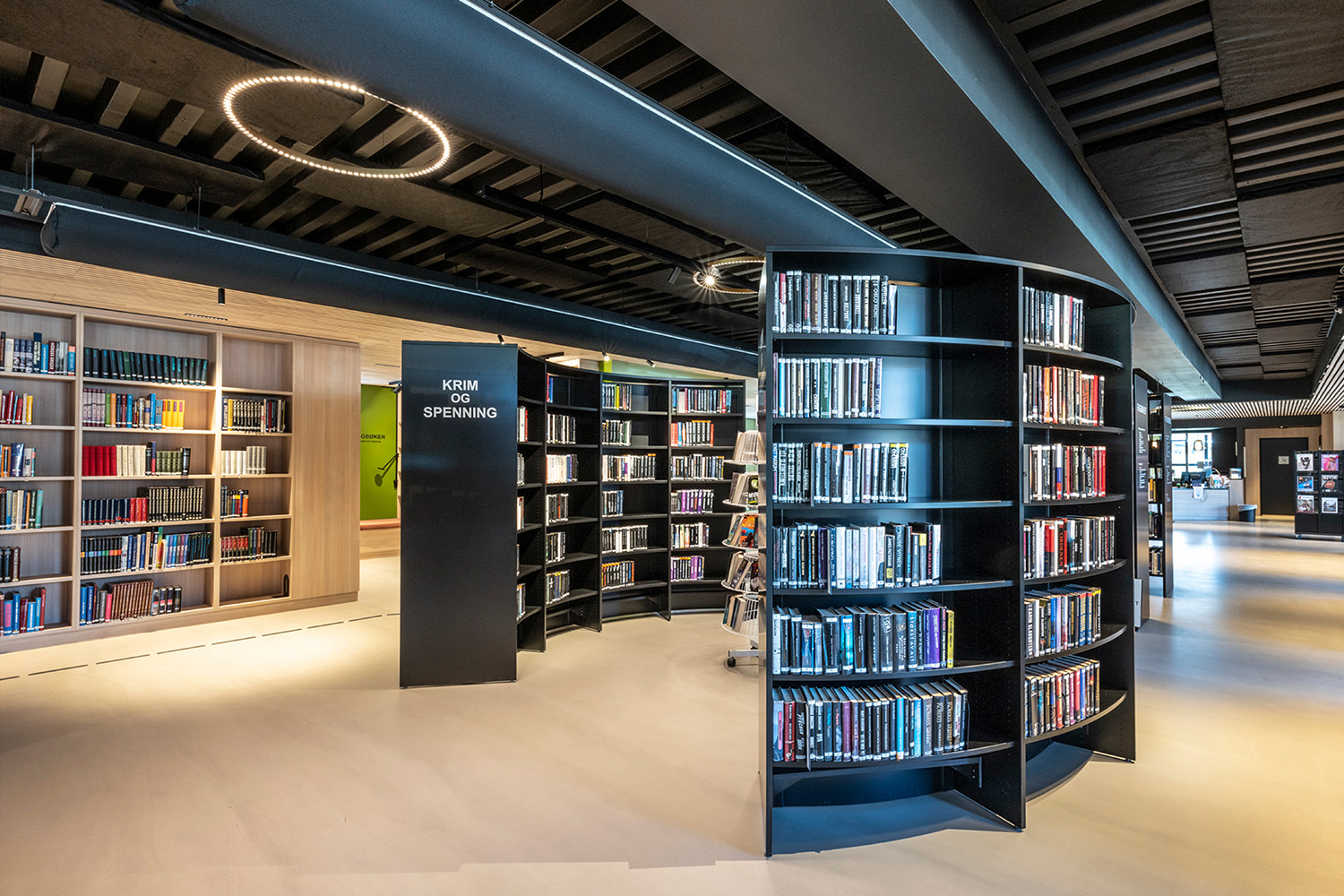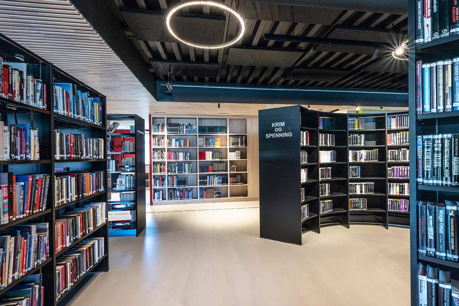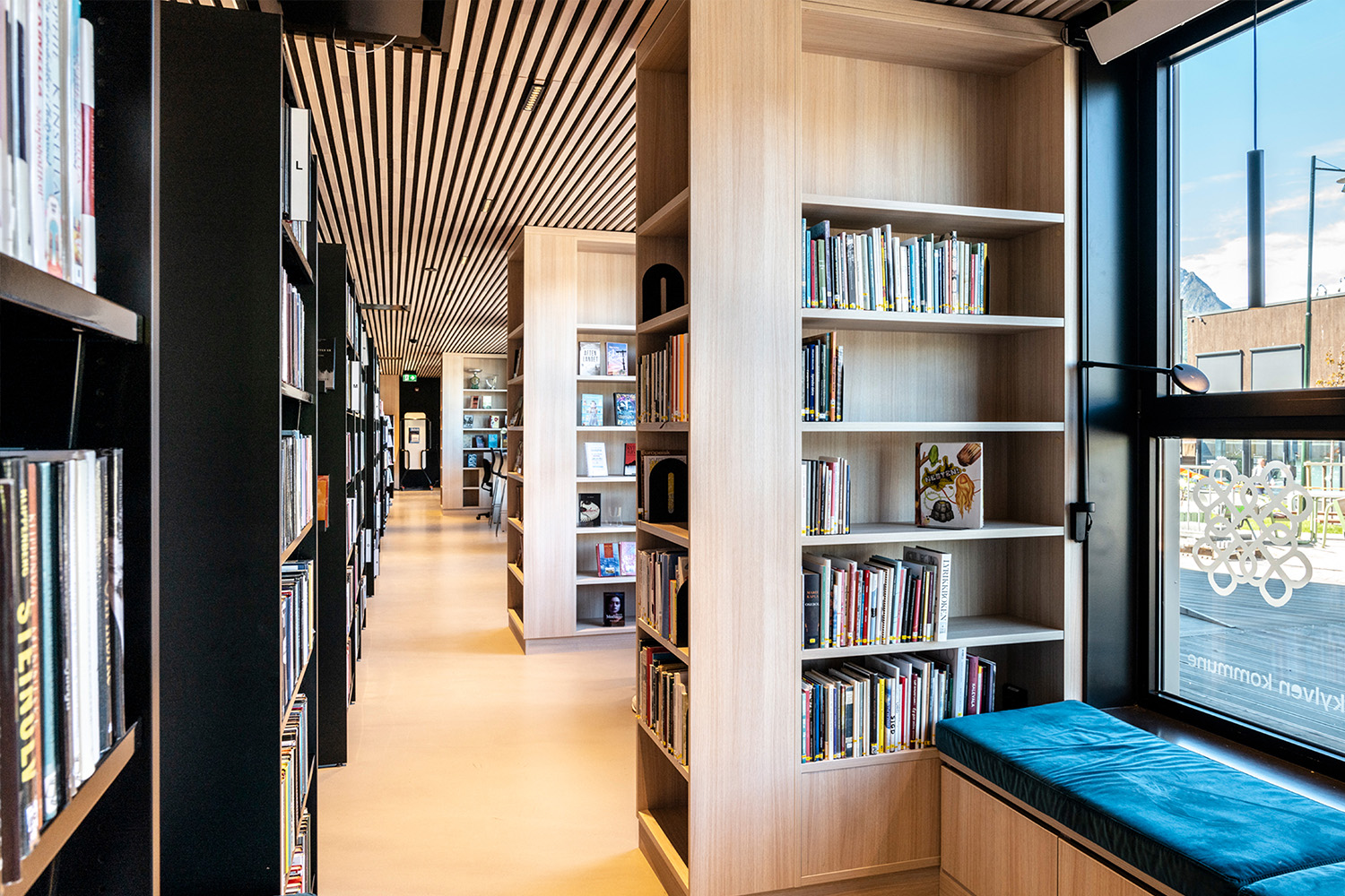 Die schwarzen Regale in der Mitte des Raums wurden von BS Eurobib geliefert. Um jedoch die hohen Decken optimal zu nutzen, wurden die hellen Regale entlang der Wände maßgefertigt. Die Bibliothek hat sich zu einem beliebten Treffpunkt entwickelt, an dem Besucher mit Freunden zusammenkommen, Spiele spielen, Zeitungen lesen, lernen und vieles mehr unternehmen können.