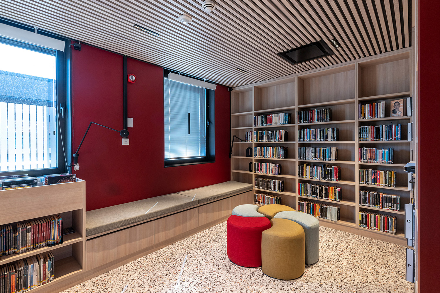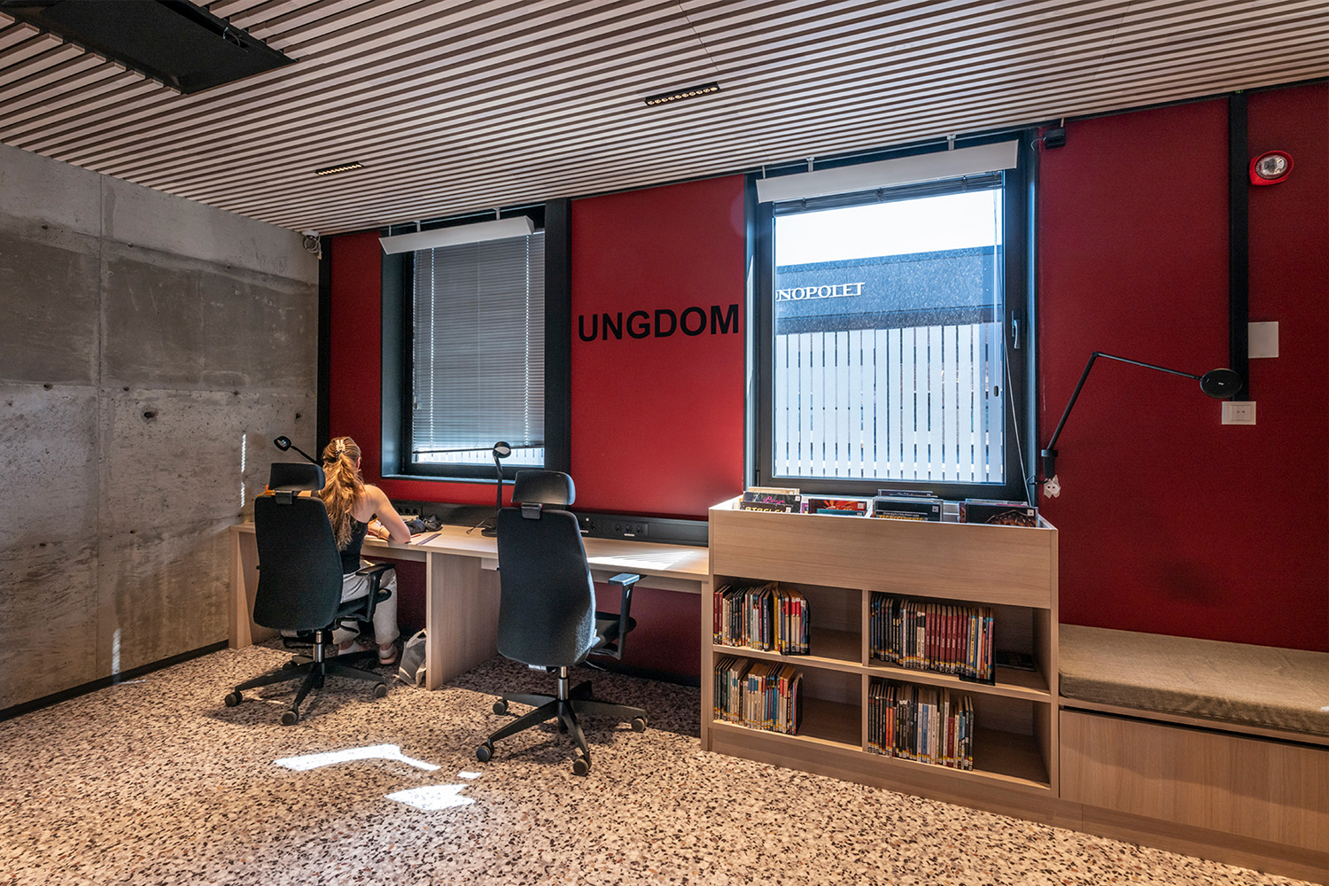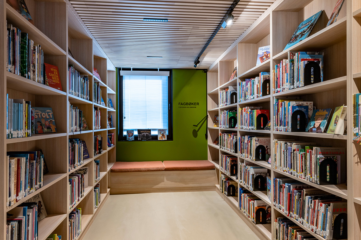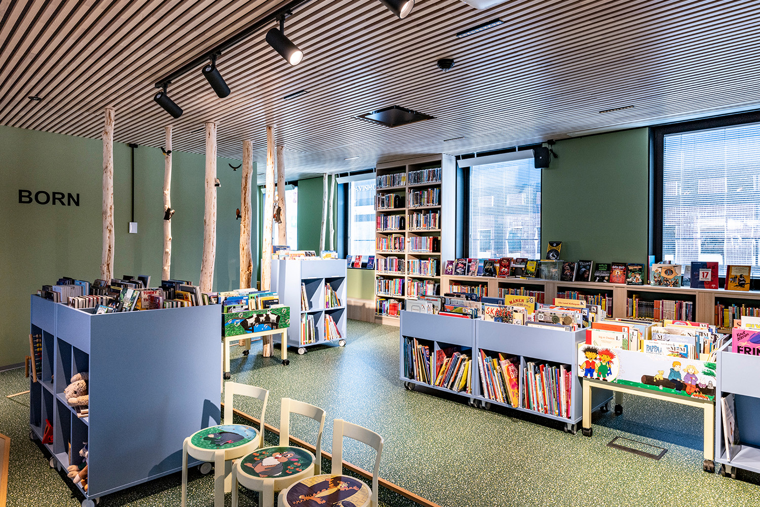 Die schwarzen Regale in der Mitte des Raums wurden von BS Eurobib geliefert. Um jedoch die hohen Decken optimal zu nutzen, wurden die hellen Regale entlang der Wände maßgefertigt. Die Bibliothek hat sich zu einem beliebten Treffpunkt entwickelt, an dem Besucher mit Freunden zusammenkommen, Spiele spielen, Zeitungen lesen, lernen und vieles mehr unternehmen können.