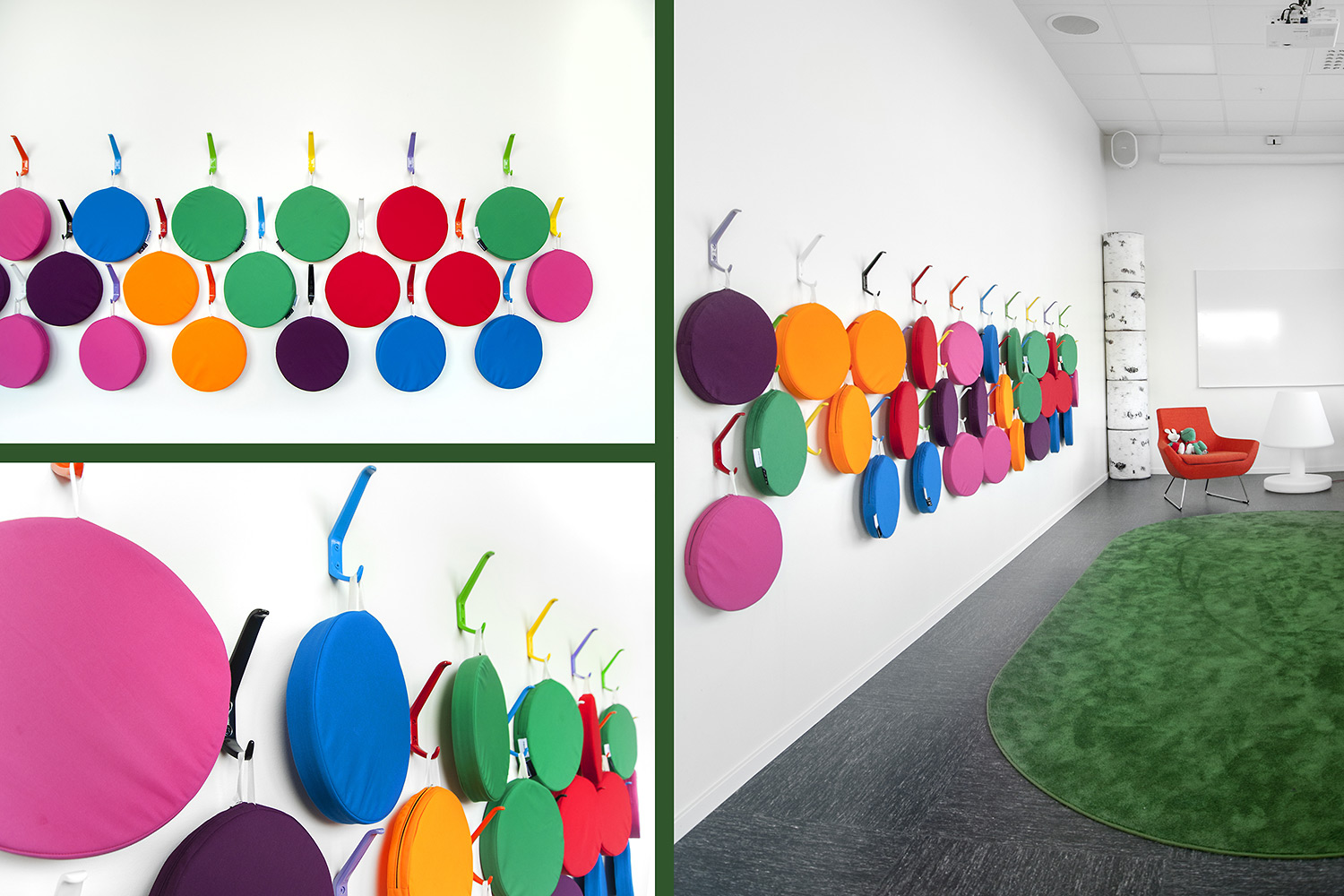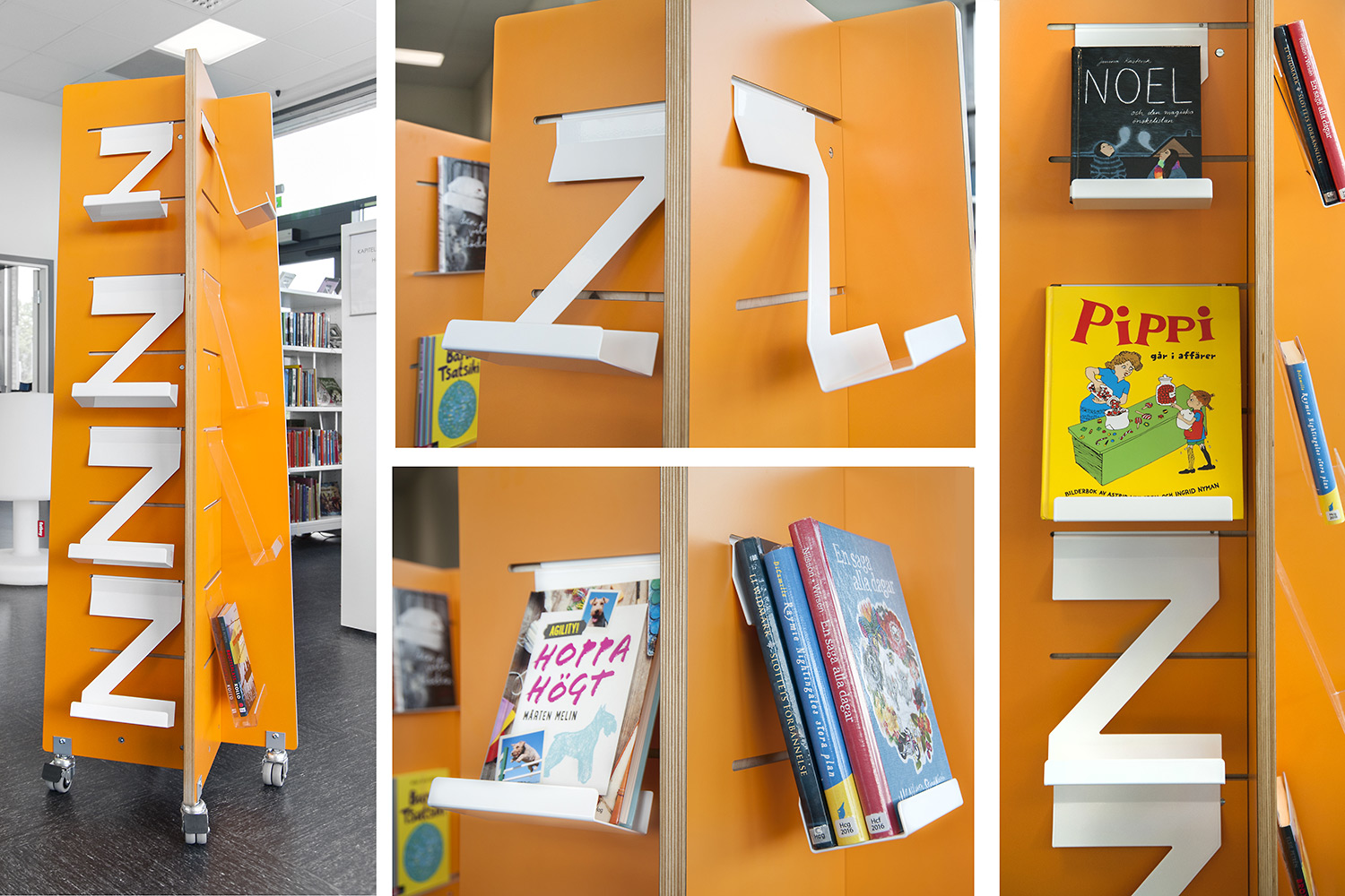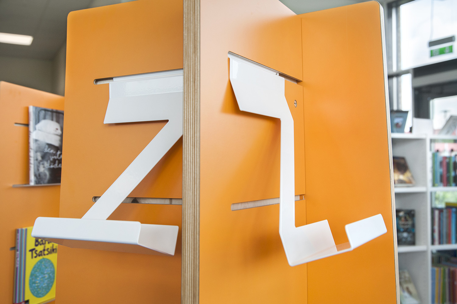 Das Regalsystem ist zur Erhöhung der Flexibilität teilweise mit Rollen ausgerüstet. Die fahrbaren Regale ermöglichen es, dass Teile des Raumes für unterschiedliche Veranstaltungen genutzt werden können. Die Seitenwände werden zum einen als Eureka Recherchestationen und zum andern für die Beschriftung genutzt. Quattro Displaytürme in Weiß und Orange in zwei unterschiedlichen Höhen präsentieren Neuheiten und Themen, um Interesse zu wecken.