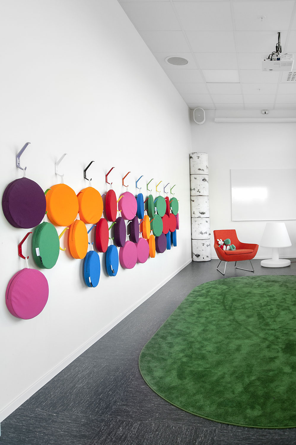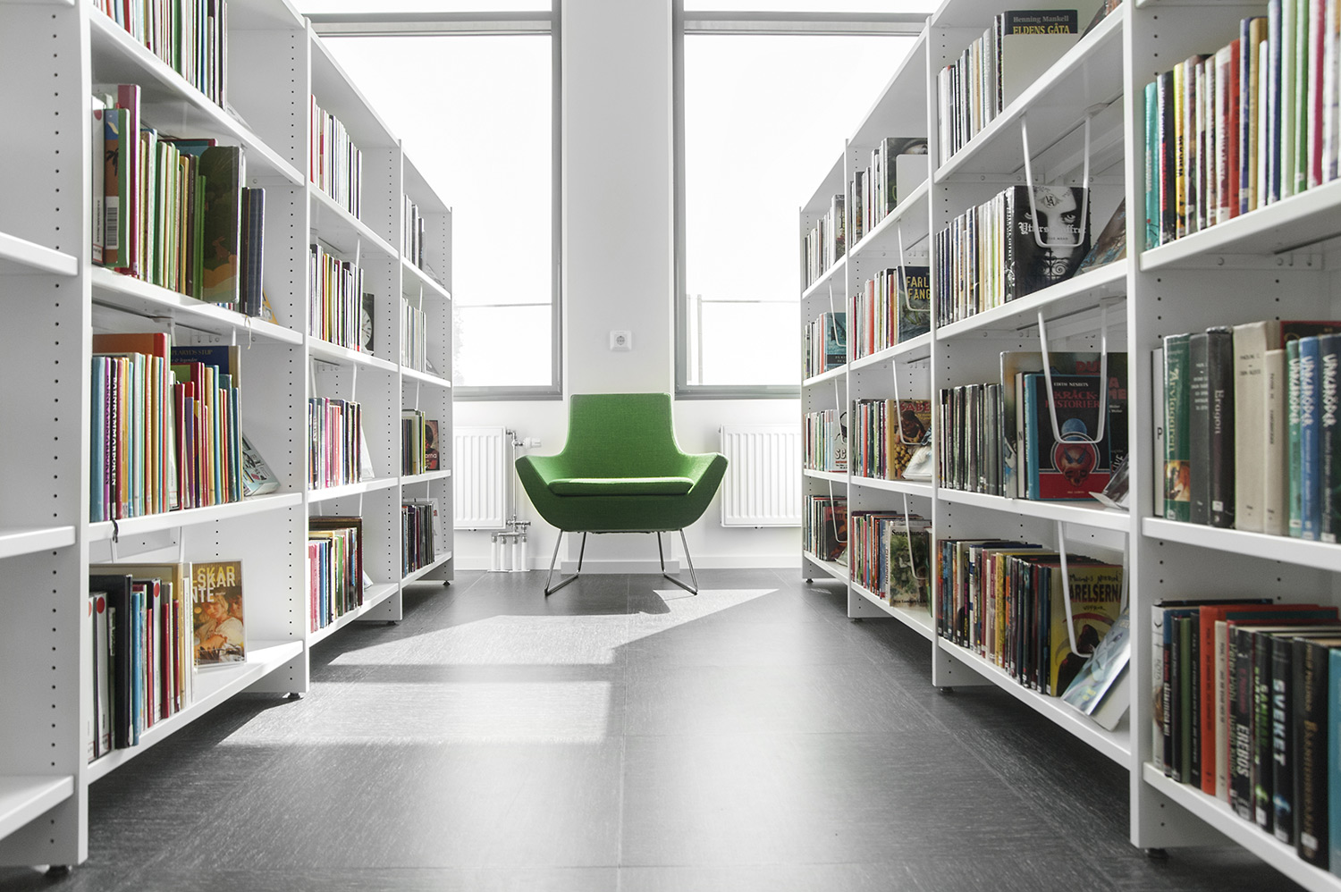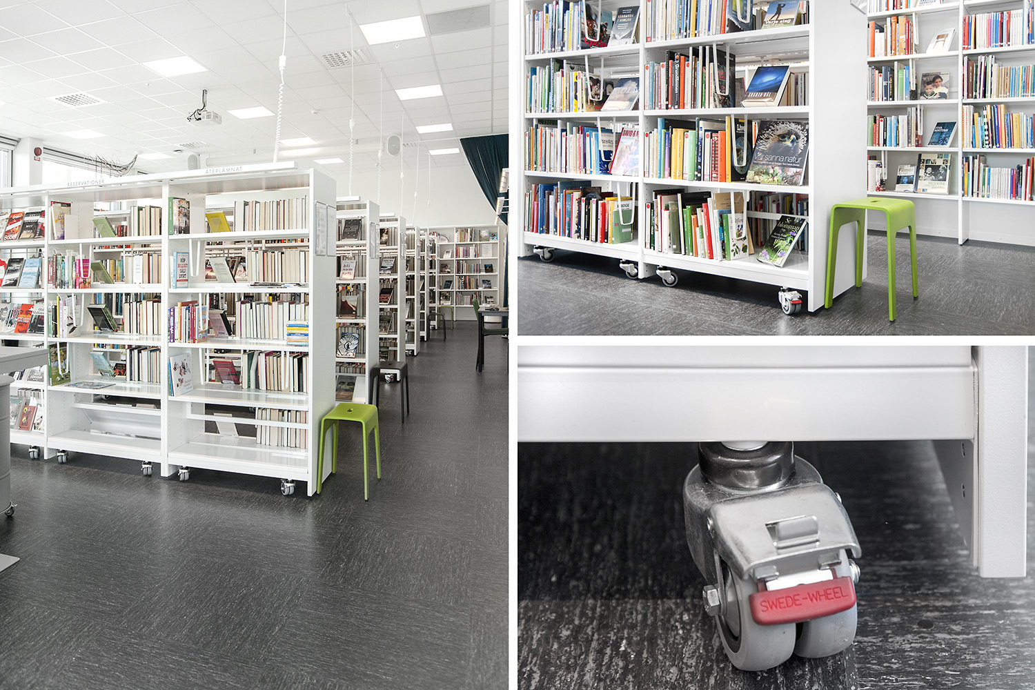 Die Bibliothek ist mit dem Regalsystem Frontline in Weiß eingerichtet, das mit einigem Zubehör ausgestattet ist wie z. B. den Zeitschriften- und Präsentationsfachböden. Das Regalsystem ist so aufgestellt, dass es aus allen Richtungen des Raumes her gut zugänglich ist.