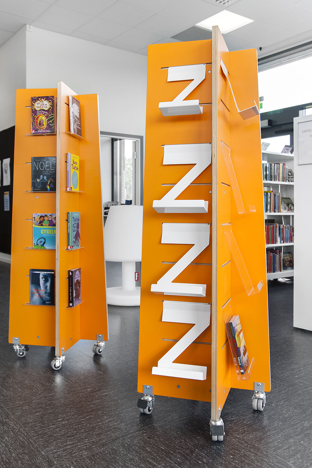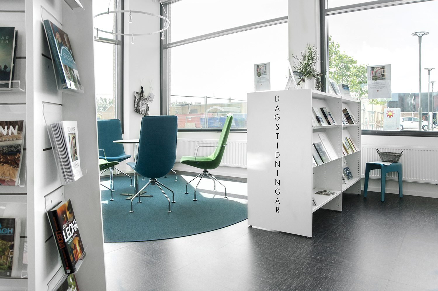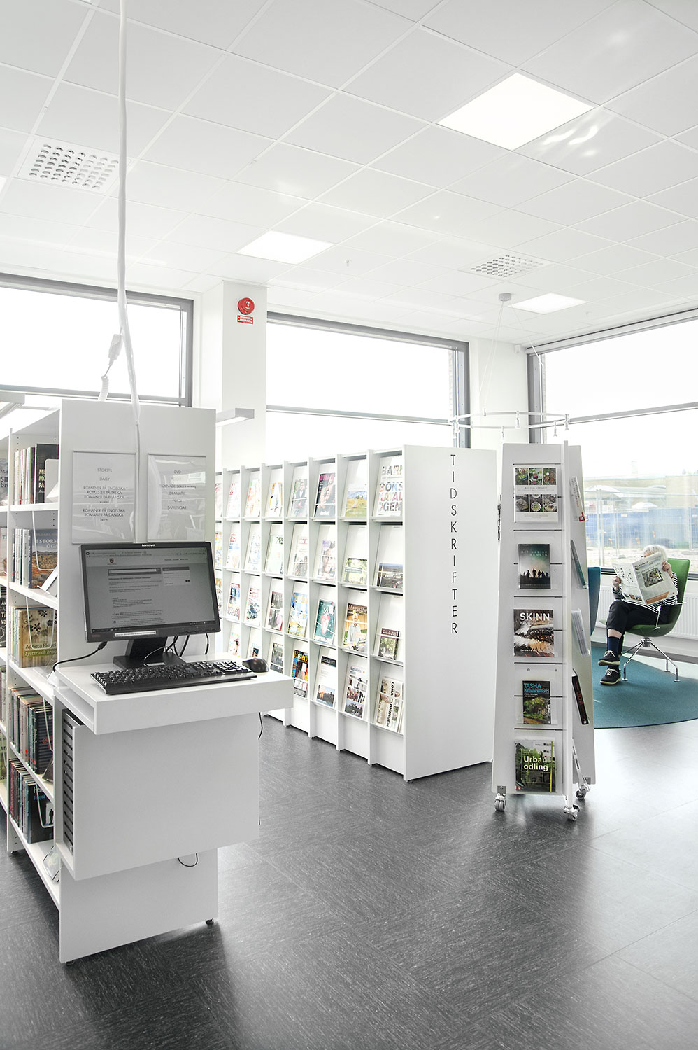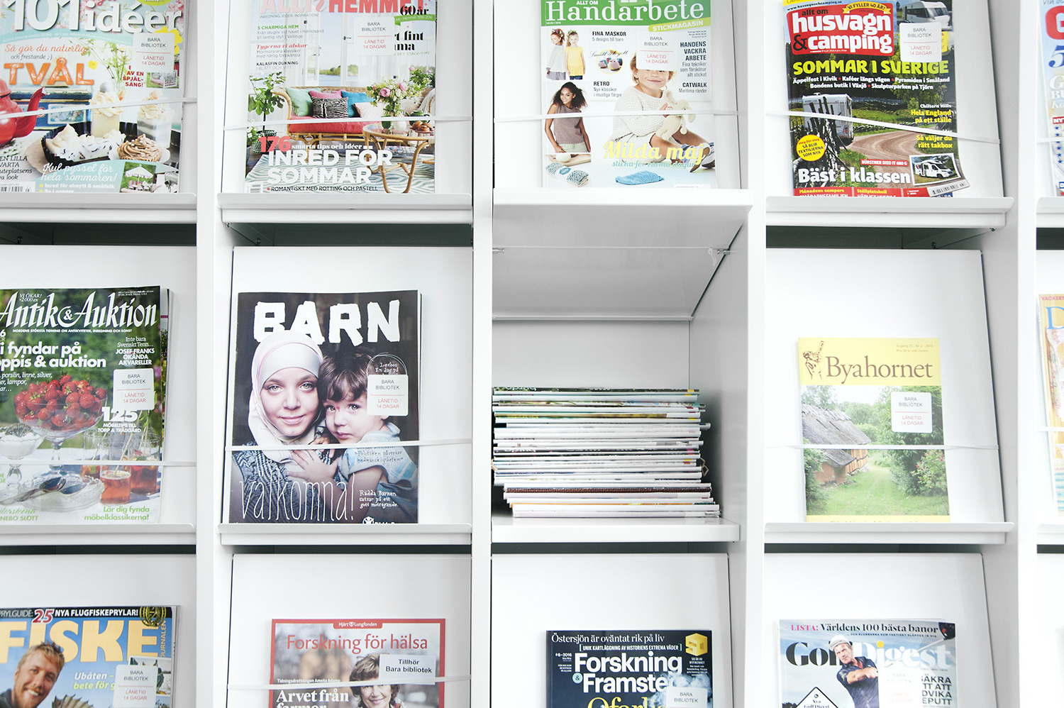 Der ungehinderte Zugriff auf alles stellte Anforderungen an das Mobiliar. Zum Beispiel müssen Zeitschriften und Zeitungen leicht zu greifen sein, sowohl die neuesten als auch die älteren Ausgaben. Die Magazinierungs-/Präsentationsböden beim Regalsystem Frontline mit der Funktion der Magazinierung der Zeitungen hinter dem Display der Fachböden erfüllt diese Forderungen und ist eine beliebte Lösung sowohl beim Personal als auch bei den Benutzern.