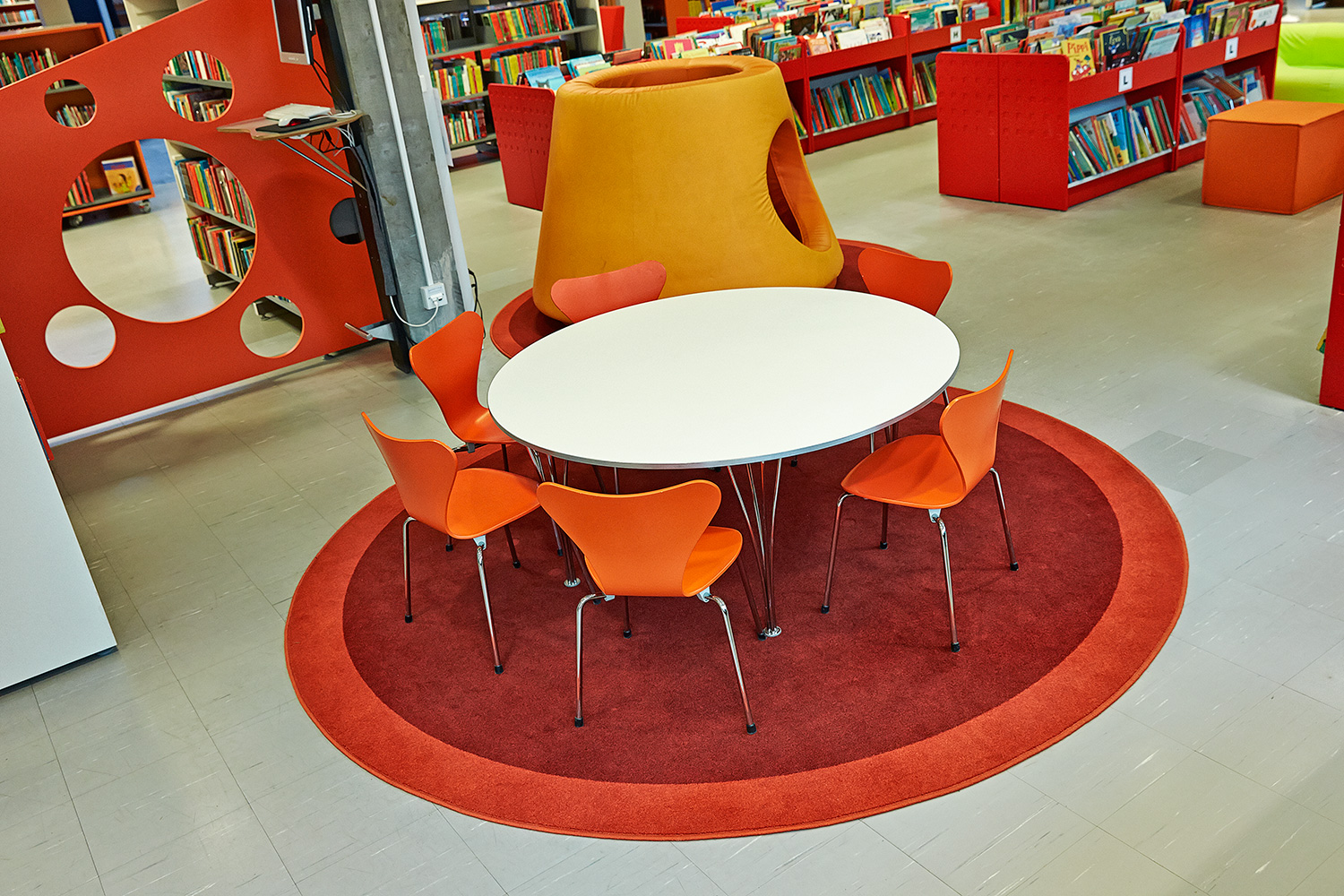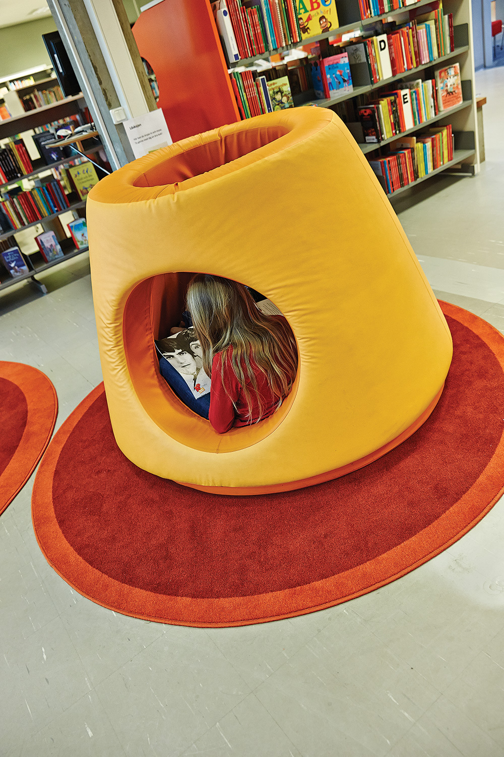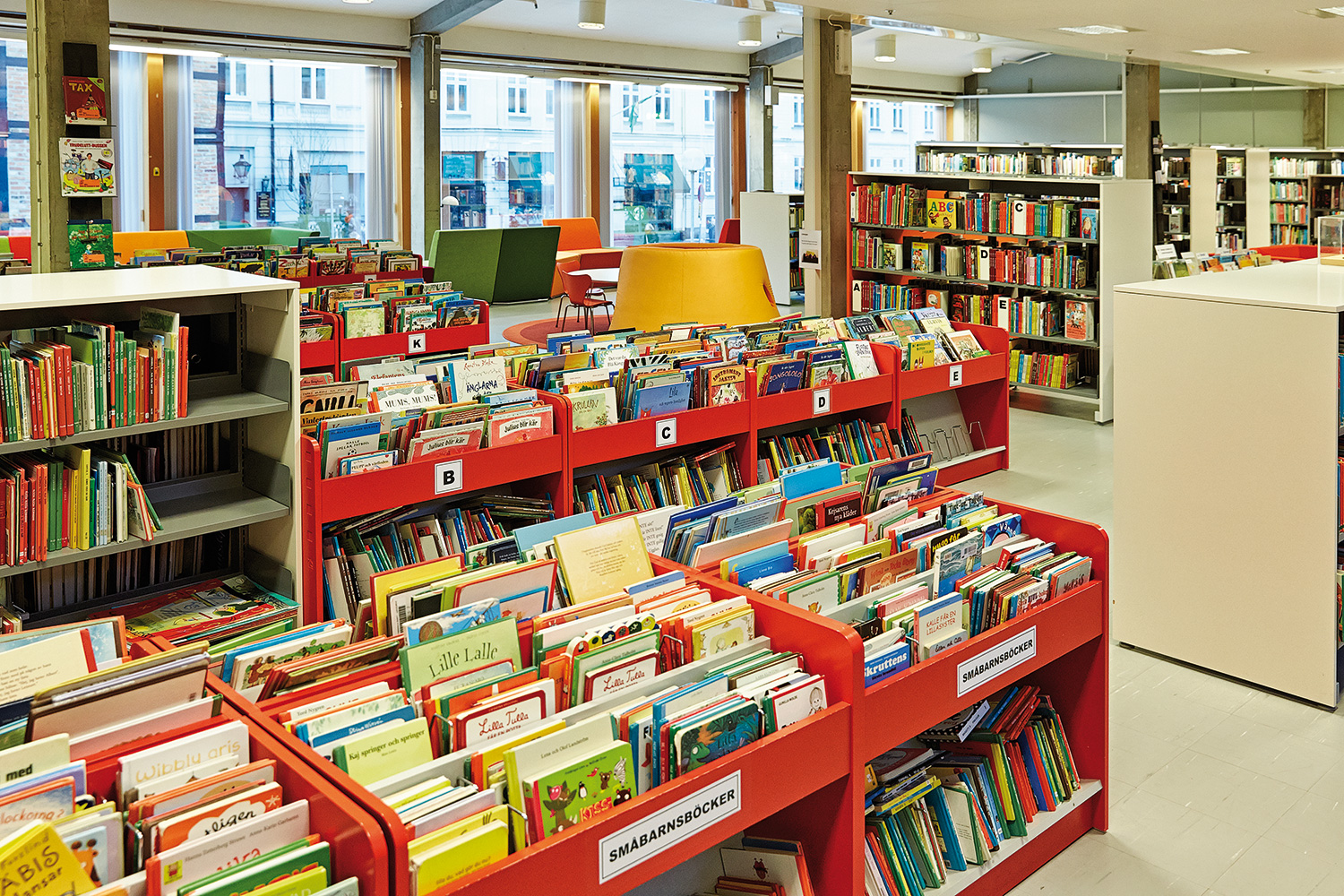 Die Hauptbibliothek in Lund befindet sich seit den 1970er Jahren im selben Gebäude. Im Laufe der Jahre wurde es immer wieder schrittweise renoviert und modernisiert. Zuletzt war die Kinderabteilung an der Reihe und unser eigener Innenarchitekt hat einen farbenfrohen Entwurf gemacht. Die beiden Bereiche – für kleinere Kinder und für Jugendliche – wurden mit Farben, Teppichböden und farbenfrohen Wänden zwischen den Regalen gestaltet.