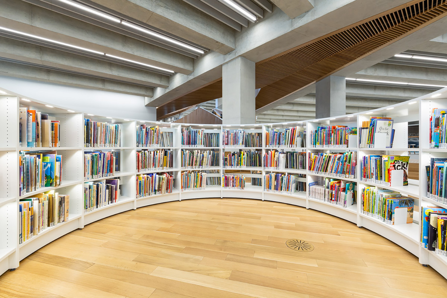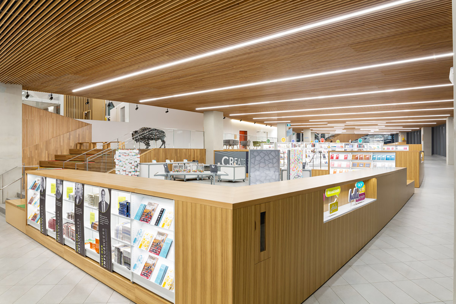 Wir lieferten unser Regalsystem Slimline, das den Anforderungen der beiden Architekten und der Bibliothek angepasst wurde. Das Regalsystem ist absichtlich niedrig gehalten, so dass die meisten Benutzer über den Abdeckboden hinausblicken können. An jedem einzelnen Fachboden ist LED-Beleuchtung installiert mit stets unsichtbarer Befestigung und Verkabelung. Die Holzteile des Regalsystems sind ohne Formaldehyd hergestellt als Beitrag zum LEED Gold Status der Bibliothek.