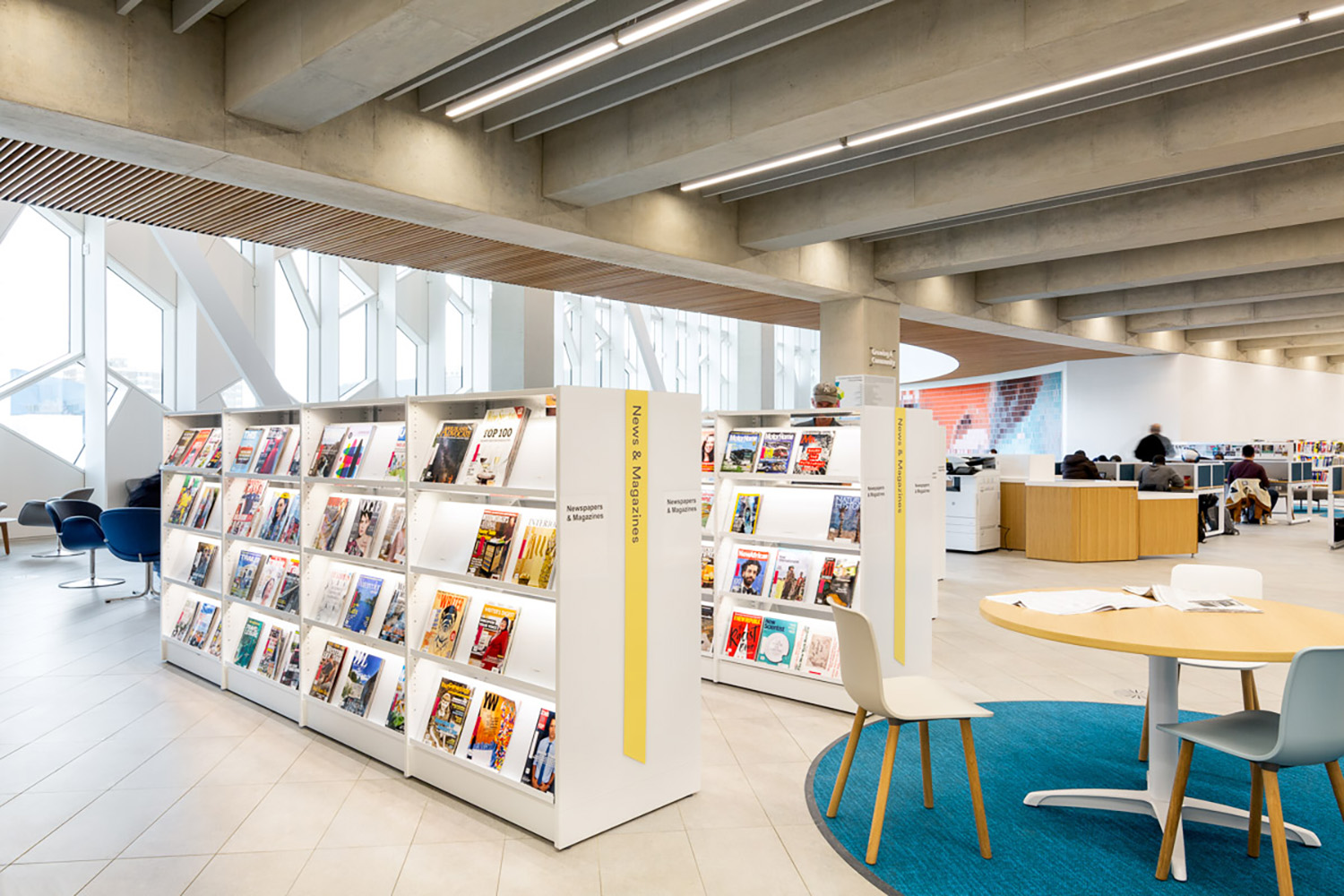Die neue Zentralbibliothek in Calgary (Kanada) befindet sich in einer Stadt, in der mehr als die Hälfte der Einwohner aktive Nutzer eines Bibliotheksaus-weises sind. Indem die Bibliothek jetzt mehr auf ihre Besucher und deren unterschiedliche Bedürfnisse eingeht, konnte sie sich um 66 % vergrößern. Sie verfügt nun über eine Fläche von 22.000 qm, verteilt auf vier Ebenen, mit 7.000 m Regalfläche und 450.000 Medien.