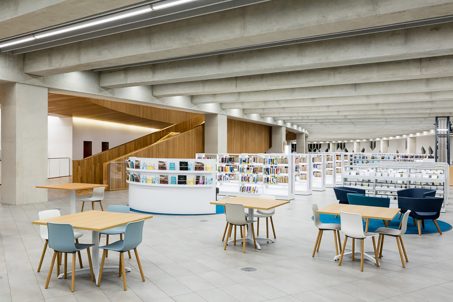 Das neue Bibliotheksgebäude hat reichlich Lese- und Studierräume, einen riesigen Kinder- und Jugendbereich, mehr als 30 Begegnungsräume, ein Café, eine Veranstaltungshalle mit 350 Plätzen und eine Aufenthaltszone im Freien von 7.000 qm, mit Sitzmöglichkeiten ausgestattet.
