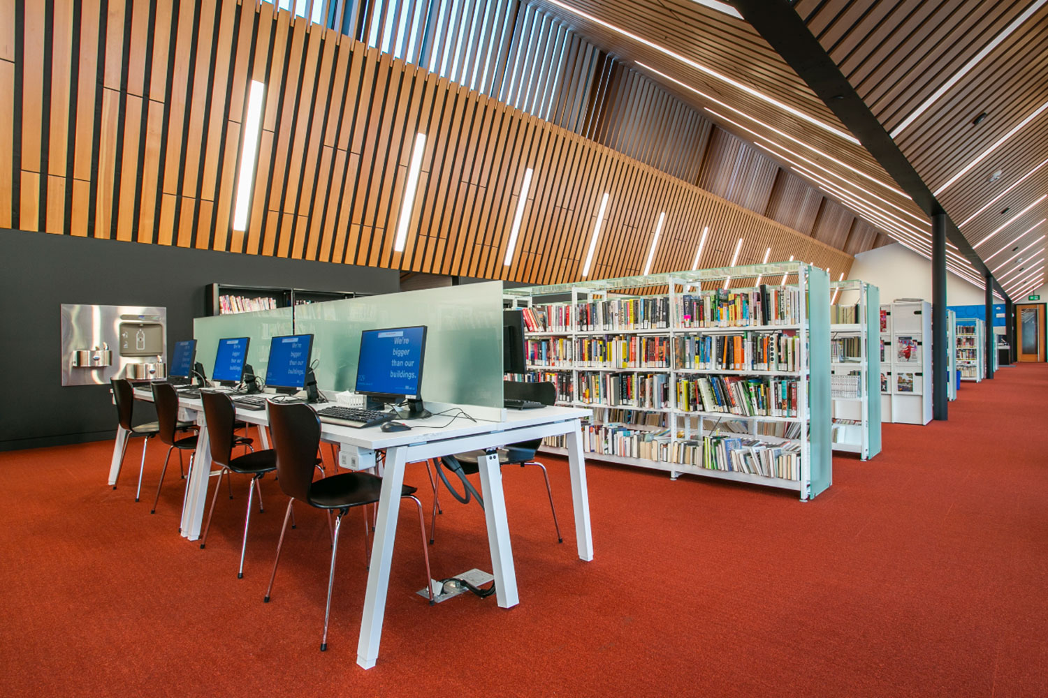Die Capilano-Filiale der Edmonton Public Library wurde in einem brandneuen Gebäude und einer neuen Lage mit ruhiger Aussicht und viel Tageslicht eröffnet. Der Ort ist sowohl zugänglich als auch mit der Natur verbunden. Die Bibliothek verfügt über Zugang zum Erdgeschoss, der dazu beitragen wird, Barrierefreiheitsprobleme in der alten Einrichtung im zweiten Stock der Capilano Mall zu lösen.