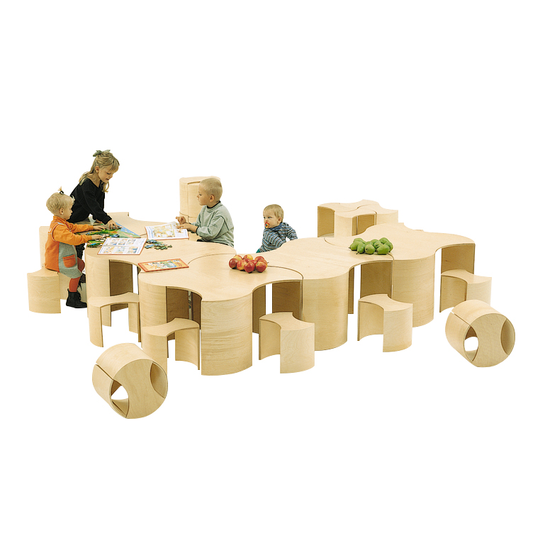 Puzzle ist nicht nur eine Möbelbaureihe, sondern auch ein Spielgerät für Kinder unter kindergerechten Bedingungen. Die Form ist ebenso einfach wie genial, weil das Element und die Konstruktion einen Tisch und Hocker bilden.