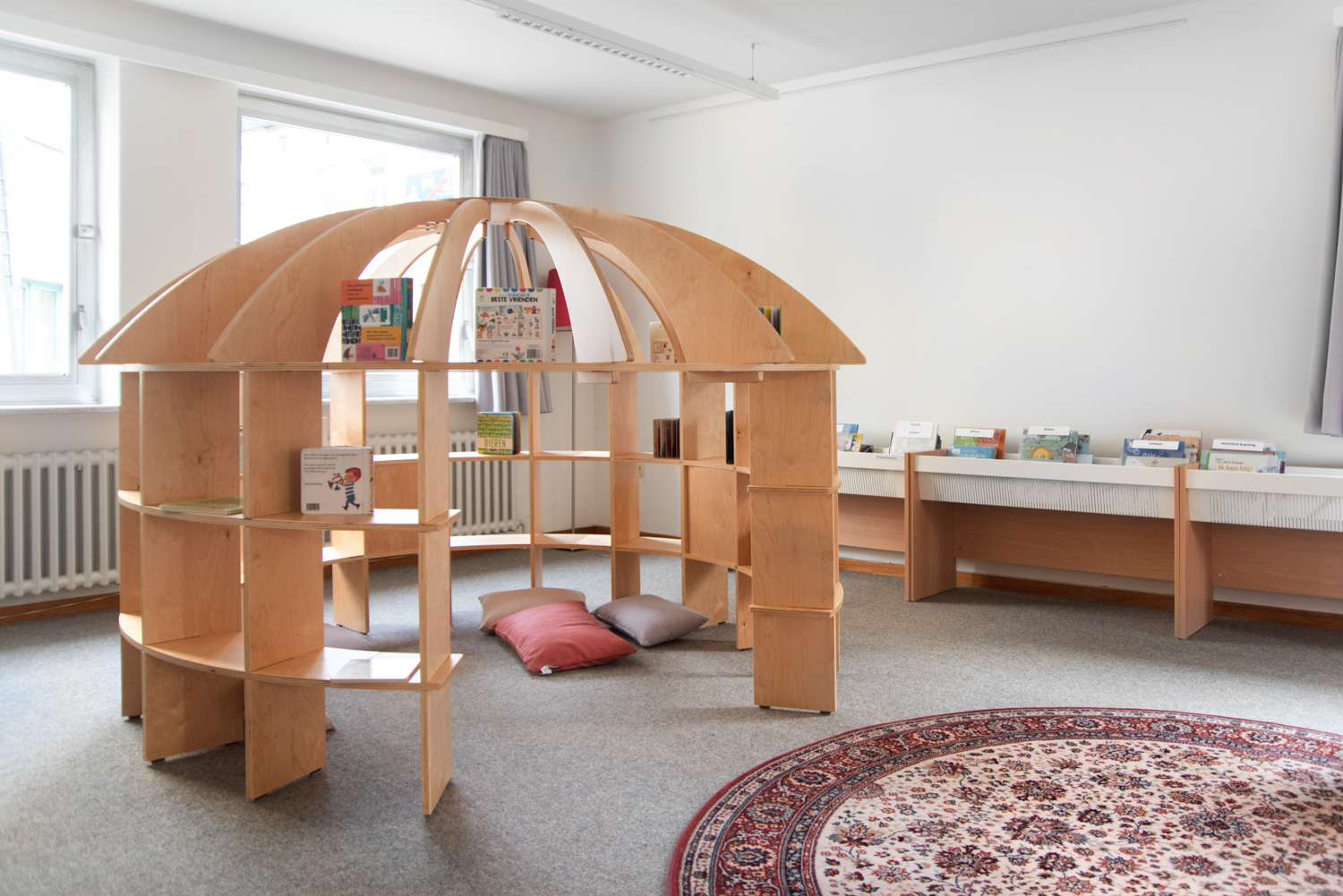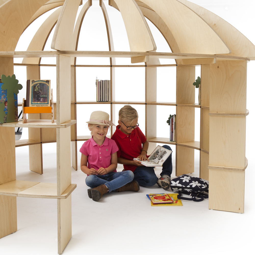 Die horizontalen Elementen verbinden die Konstruktion und bieten auf drei Ebenen reichlich Platz für Kinderbücher.