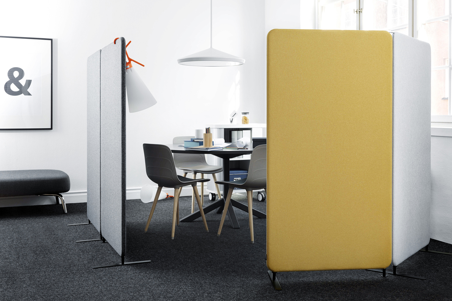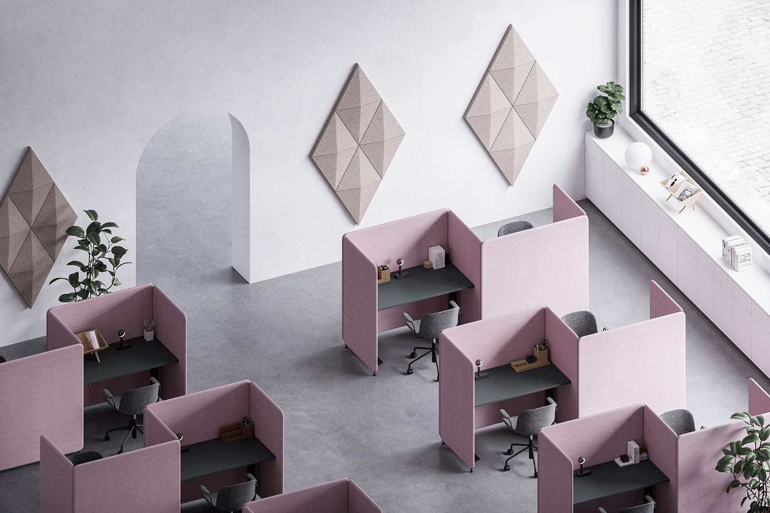 Funktionelles, flexibles, schalldämpfendes und modulares Trennwandsystem, das gleichzeitig als Raumteiler und Schalldämpfer dient.