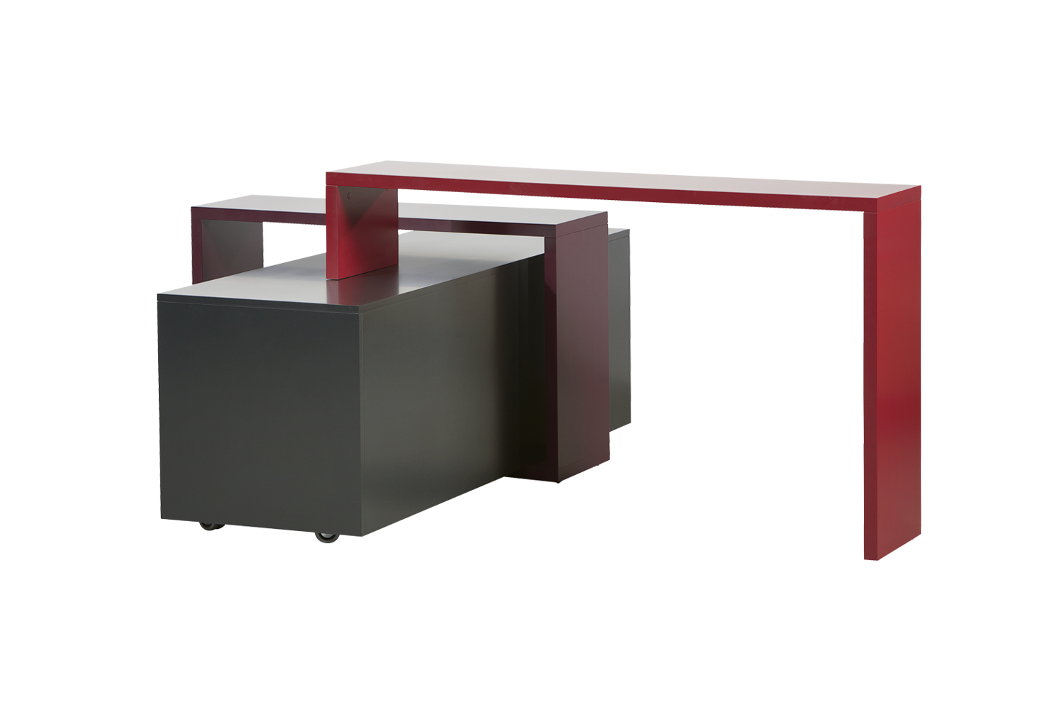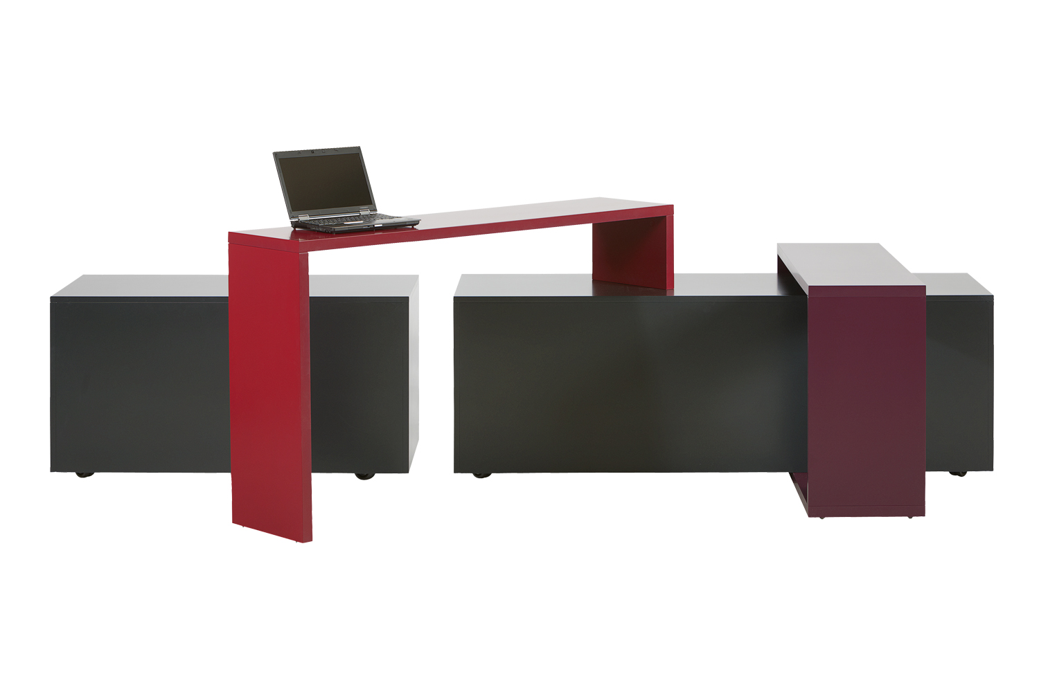 Alle Elemente sind mit Rädern ausgestattet, die dem System seine Mobilität verleihen. Sämtliche Elemente sind wahlweise mit oder ohne Laminatbeschichtung der Präsentationsfläche erhältlich.