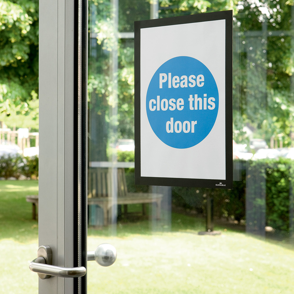 Die statische Magnetrahmen (Duraframe® Sun) lassen sich ohne Klebstoff befestigen (und ohne Blasenbildungsgefahr). Ideal für Werbung und Informationen zu größeren Fenstern und anderen Glasscheiben.