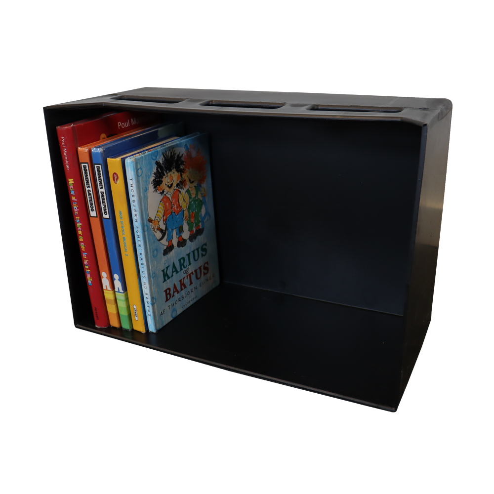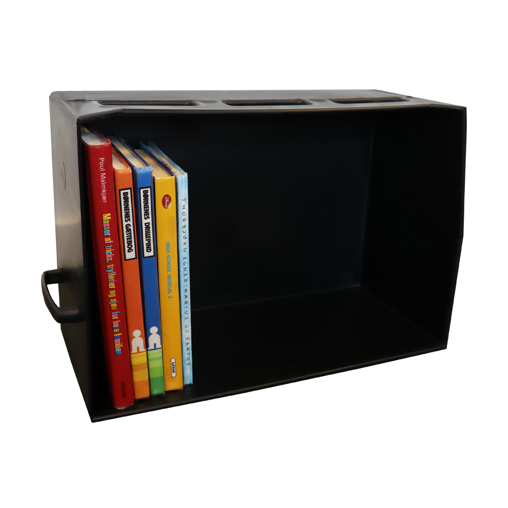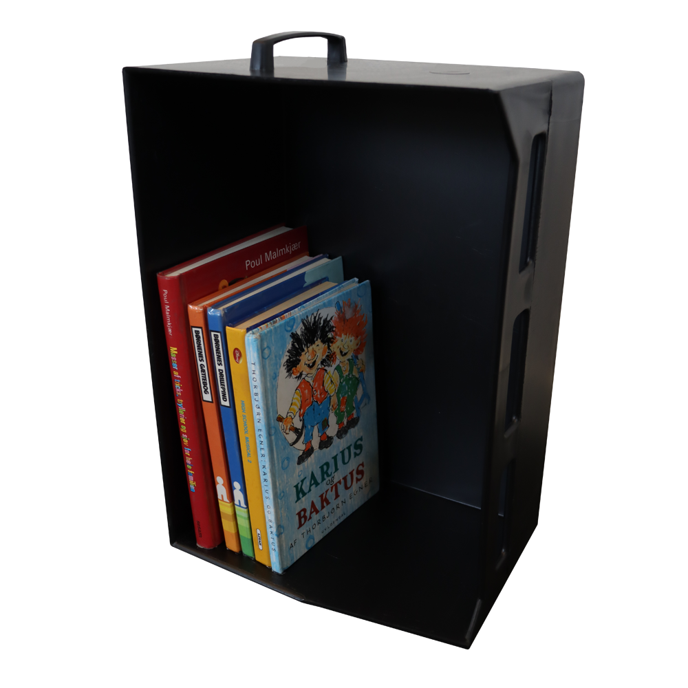 Einfacher, leichter Korb mit Griff für Bücher und andere Medien.