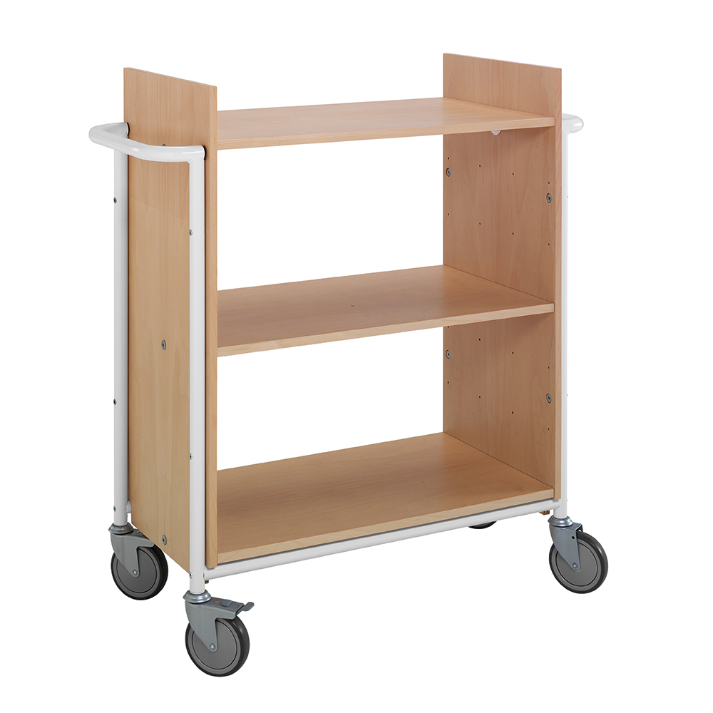 Geräumiger Bücherwagen/Transportwagen mit großzügigem Platz zwischen den Fachböden für Bücher und Ordner jeden Formats.