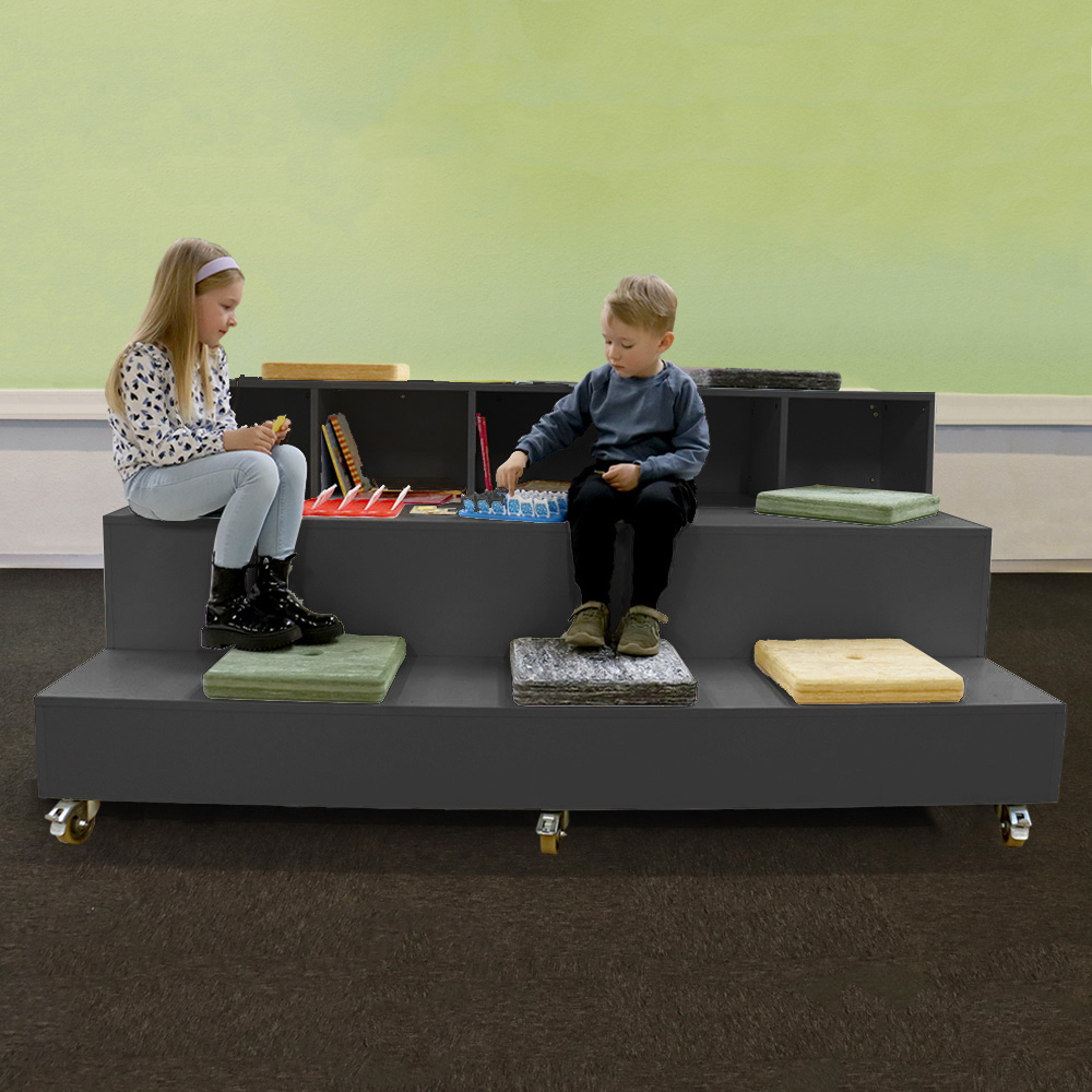 Das minimalistische und ästhetisch ansprechende Design von Verona erlaubt es, mehrere Einheiten dicht nebeneinander oder an einer Wand aufzustellen. Auf der Rückseite ist reichlich Platz für die Aufbewahrung von Gegenständen wie Sitzkissen, Spielen, Büchern und Spielzeug vorgesehen, so dass man sich kreativ entfalten kann. Das obere Podium lässt sich auch bequem umklappen, so dass die Ablagefächer nach vorne verlegt werden können.